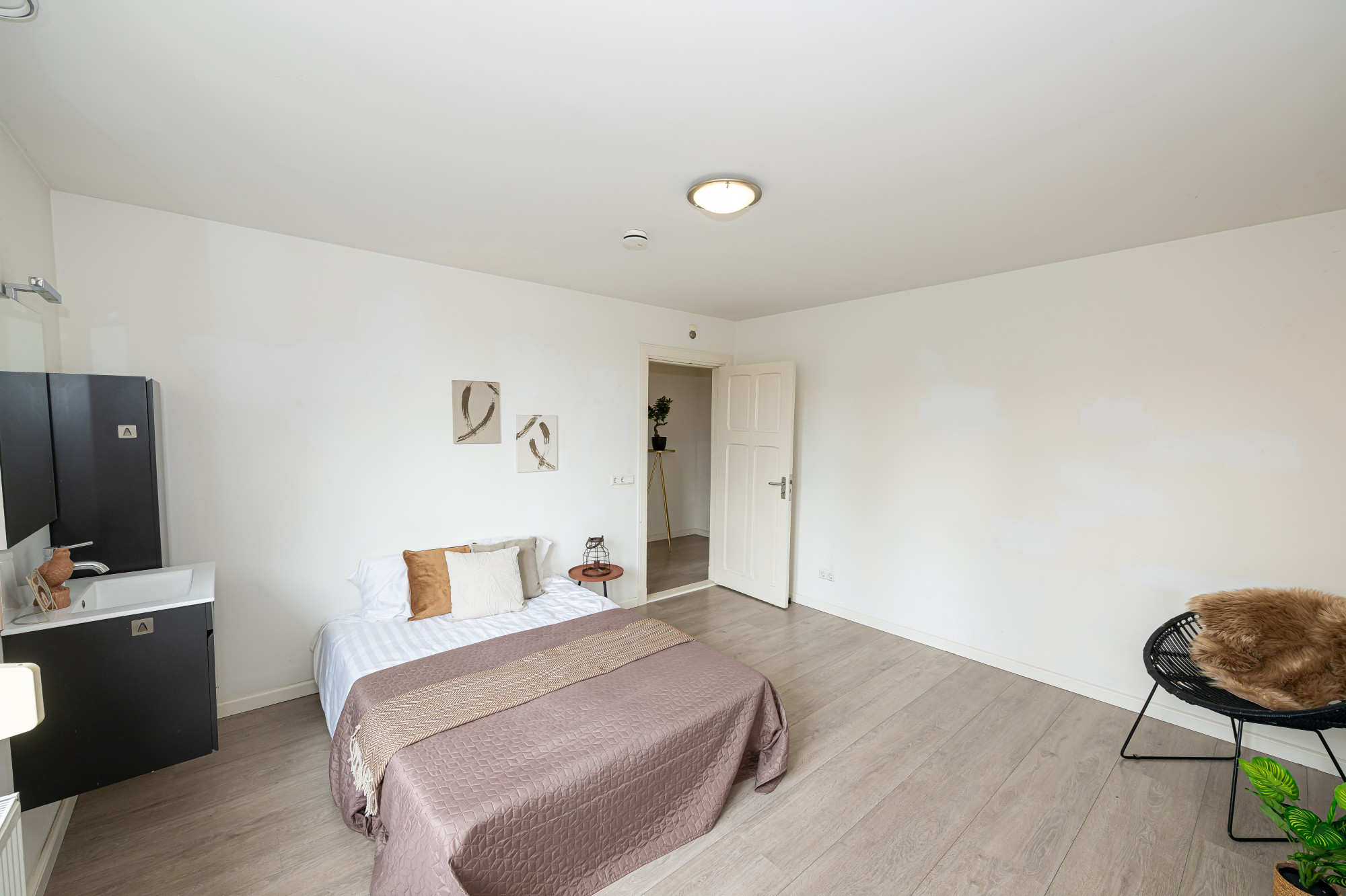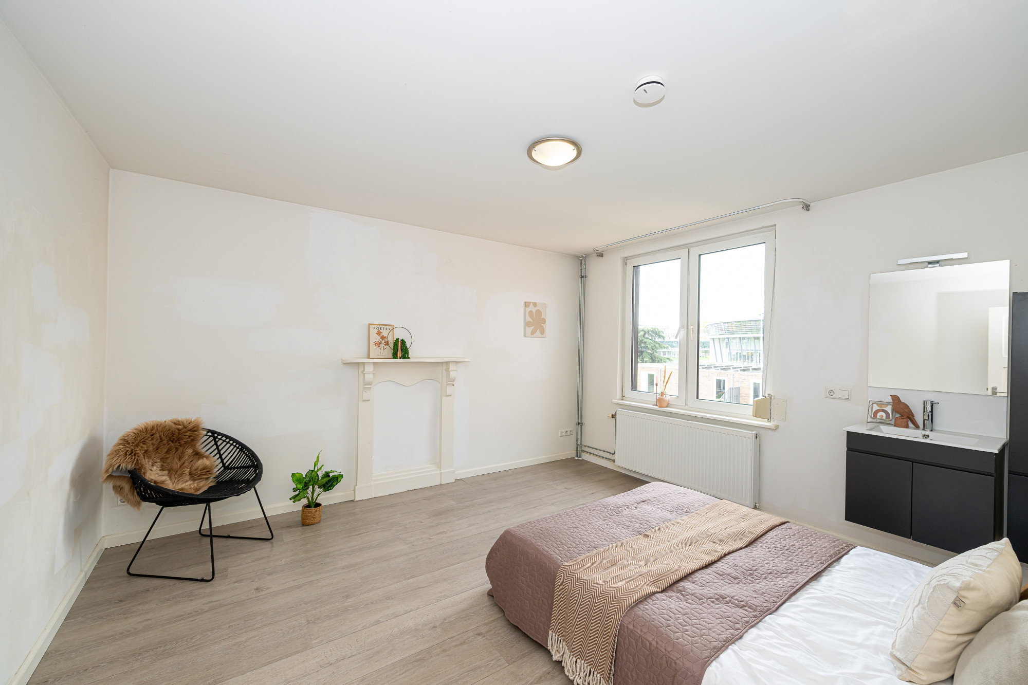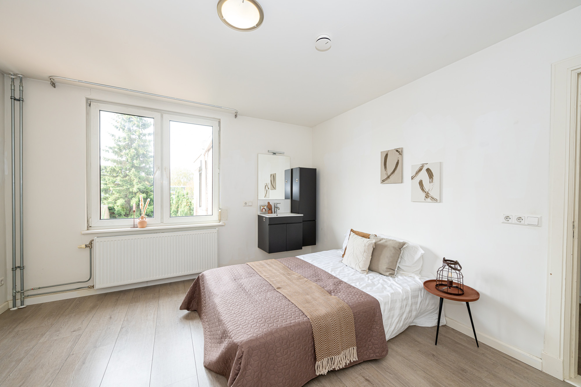 Slaapkamer aan de achterzijde voorzien van rolluiken, laminaatvloer en vaste wastafel met ombouw.