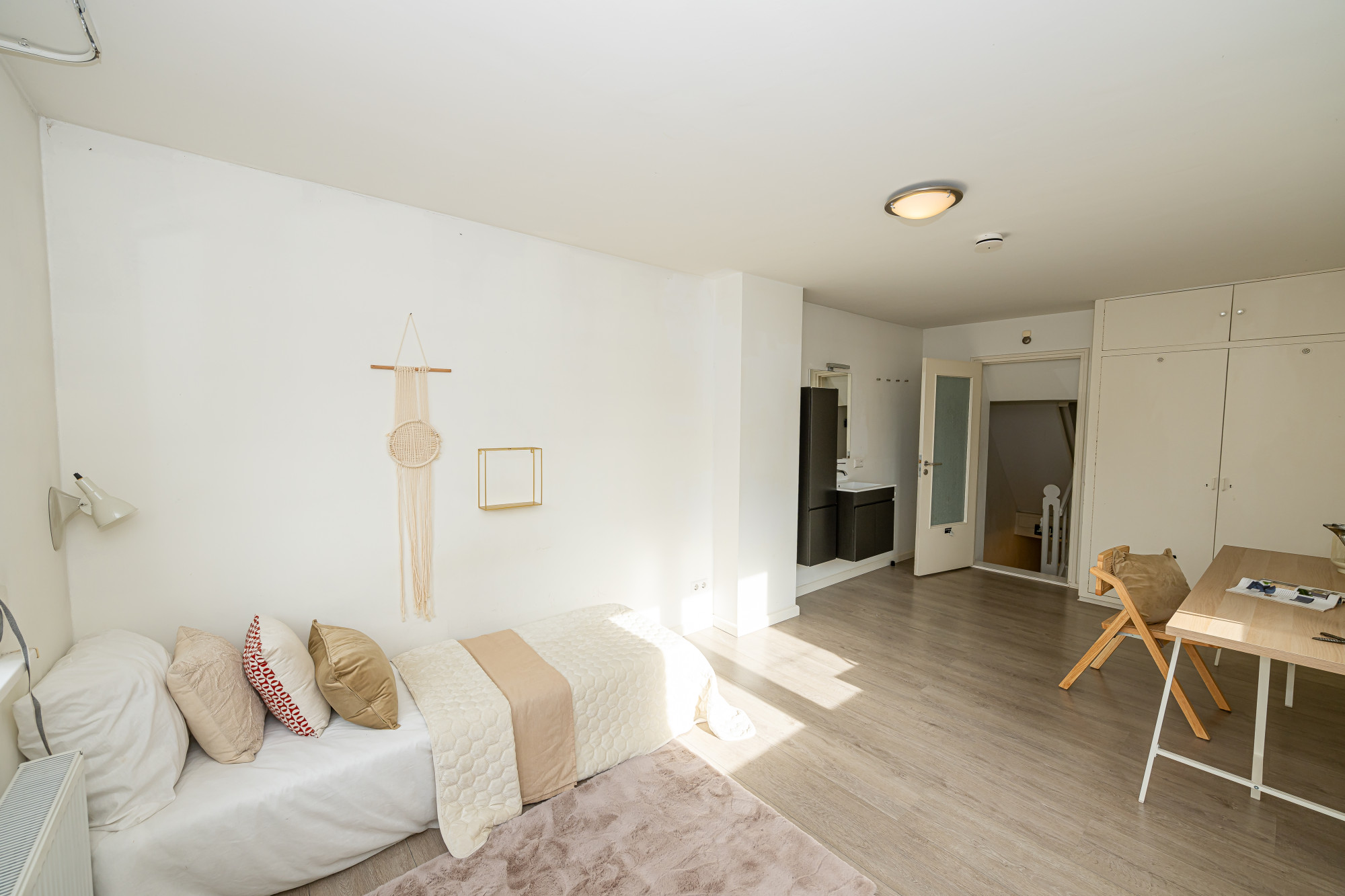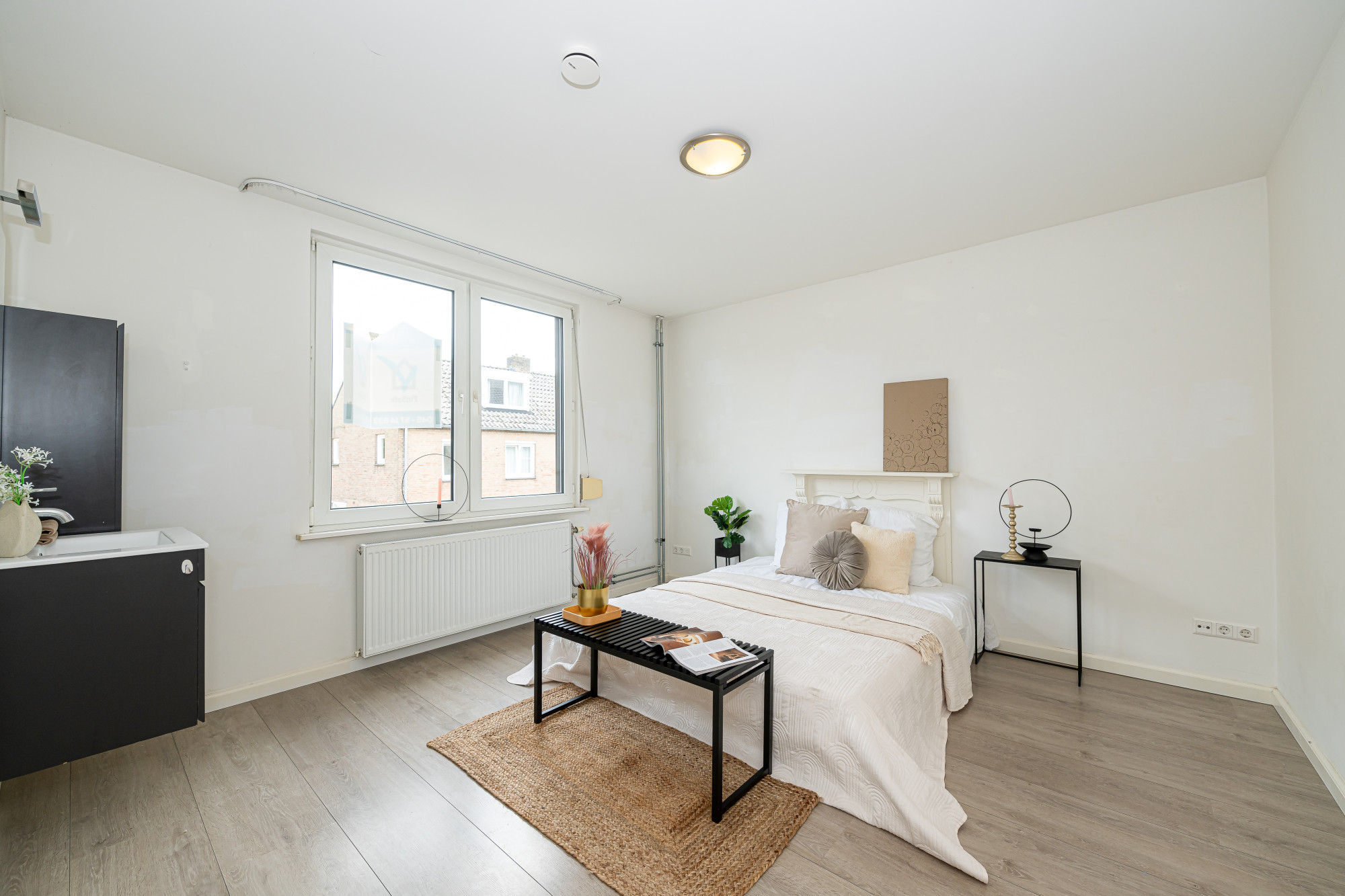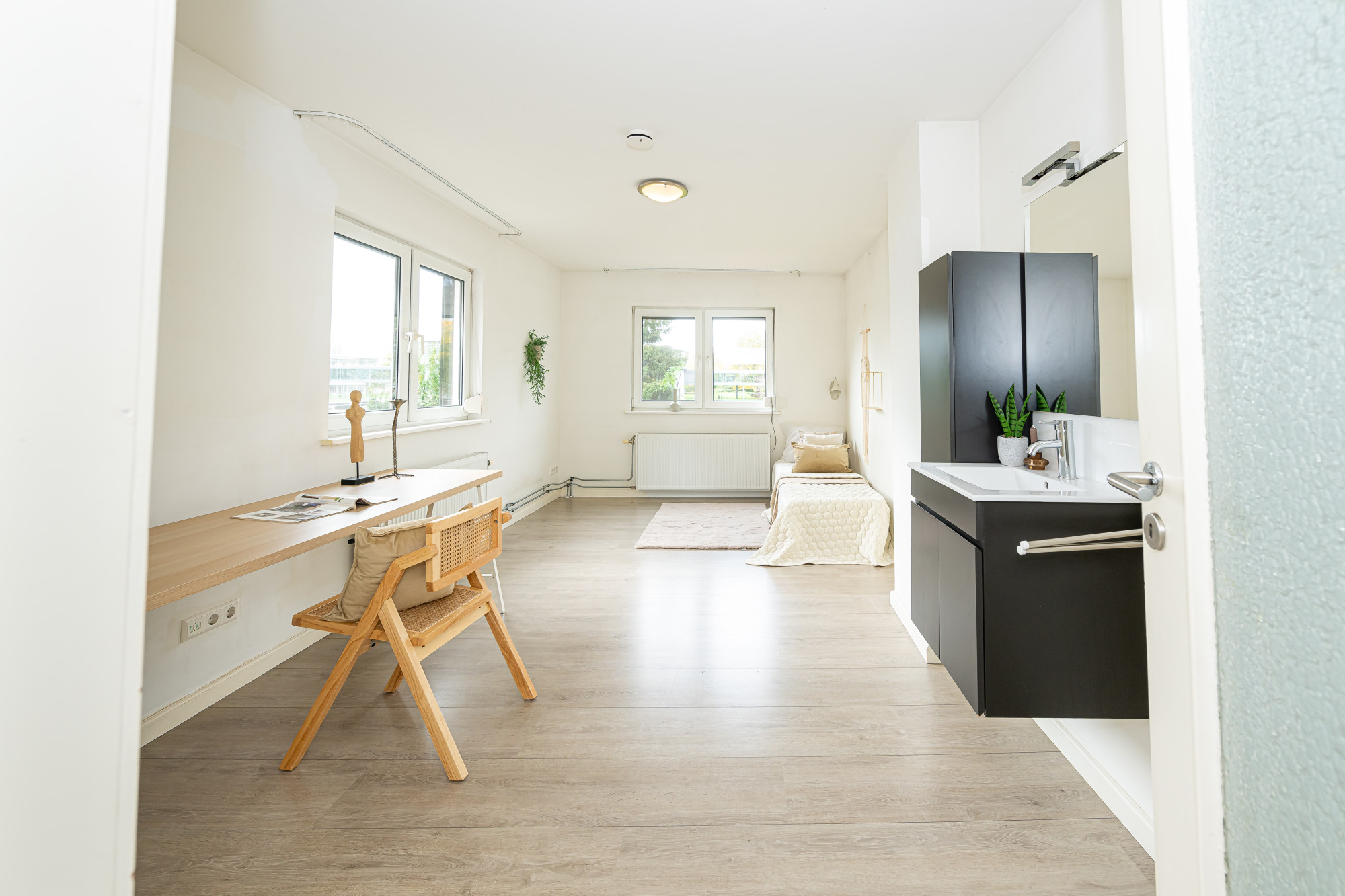 Slaapkamer aan de achterzijde voorzien van rolluiken, laminaatvloer en vaste wastafel met ombouw.