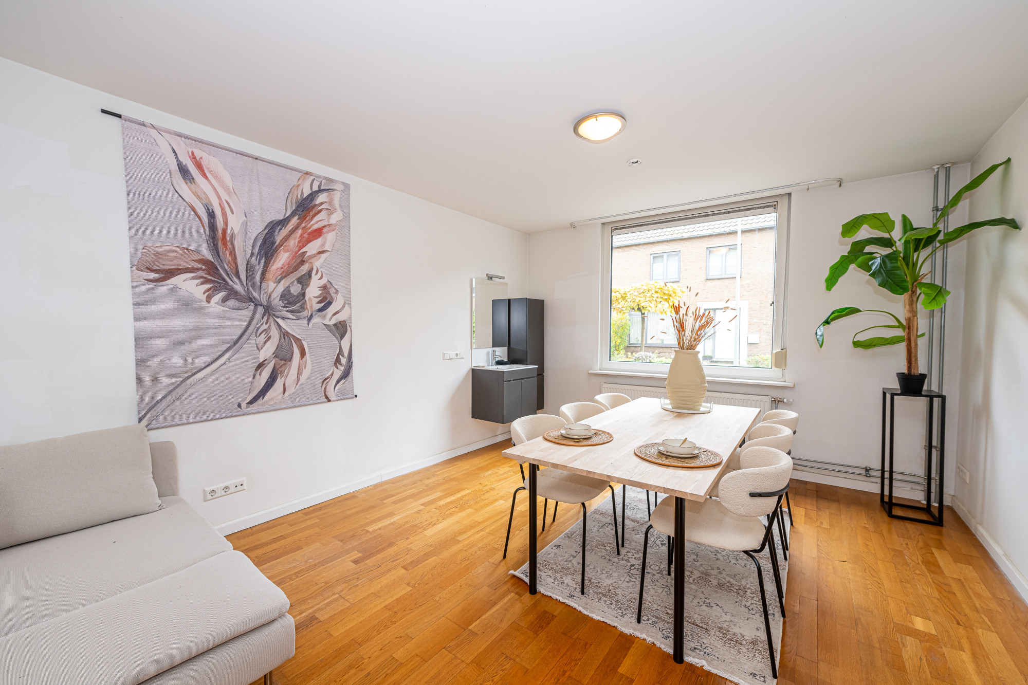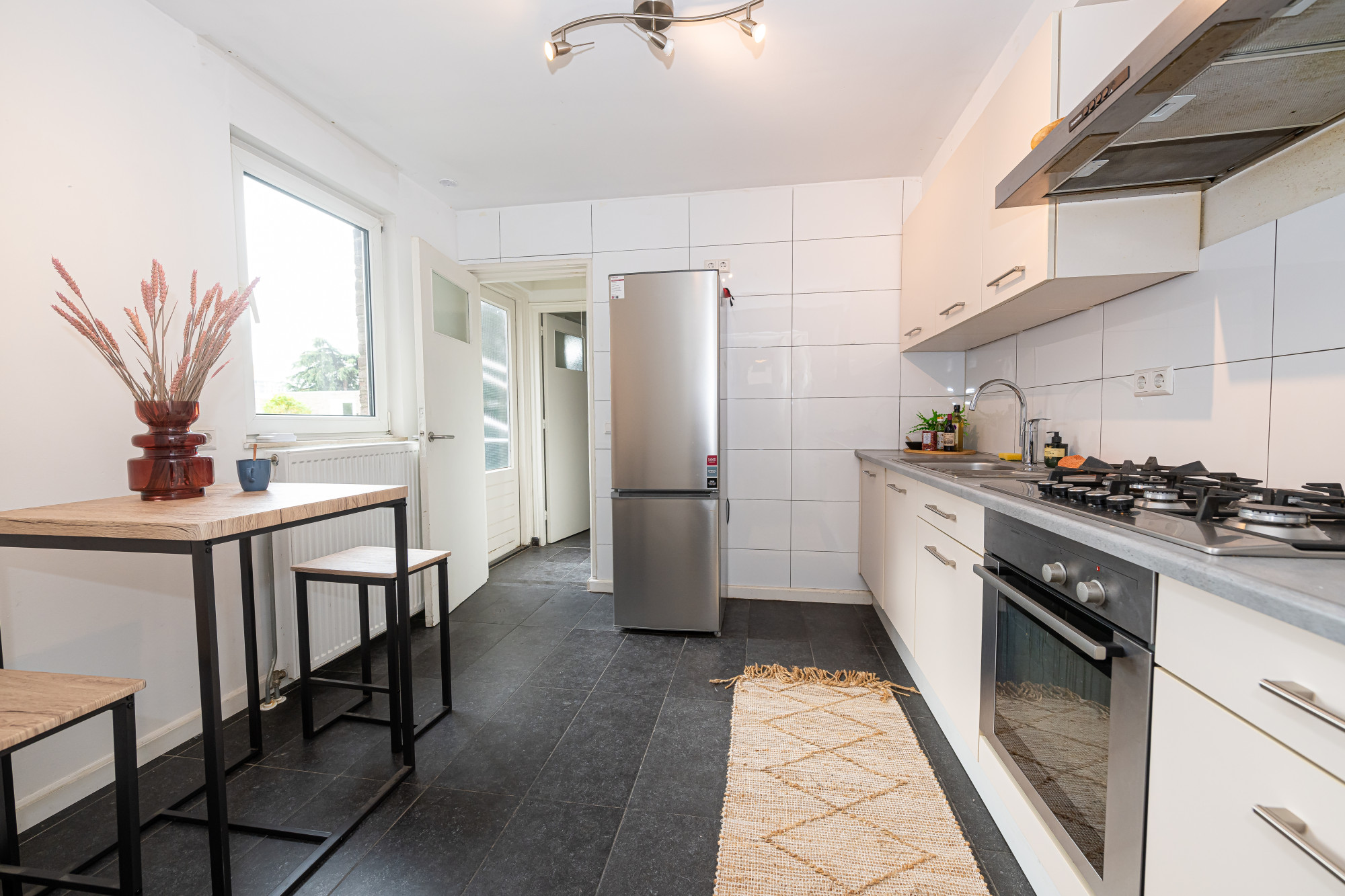 Vanuit deze ruimte bereikt men het terras aan de achterzijde en de naastgelegen garage.