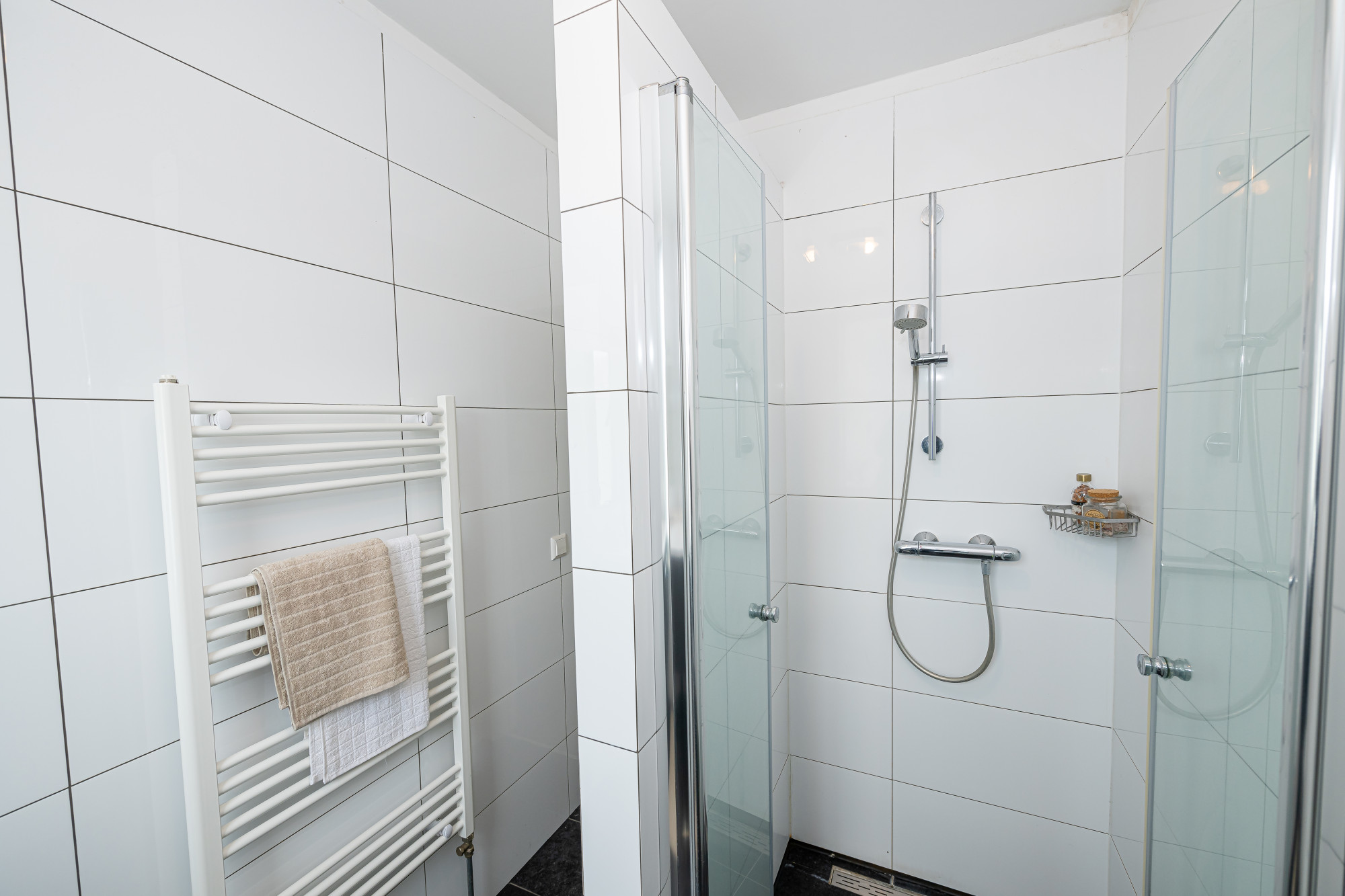 Modern betegelde ruime badkamer v.v. inloopdouche met thermostaatkraan, vrij hangend toilet, designradiator en vaste wastafel met ombouw.