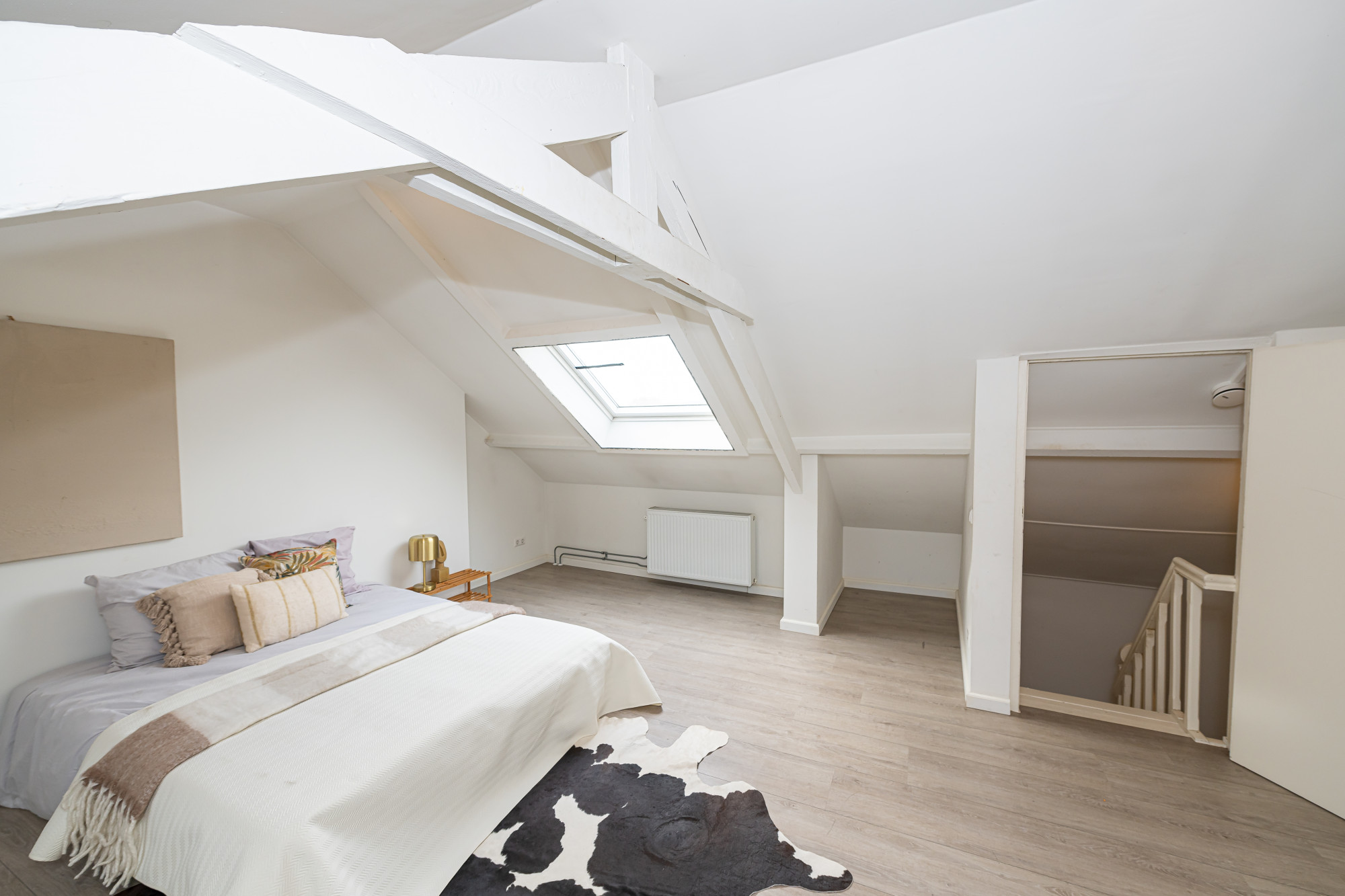 Via de speelse verdeelhal met trapjes zijn er drie slaapkamers en een badkamer te bereiken.