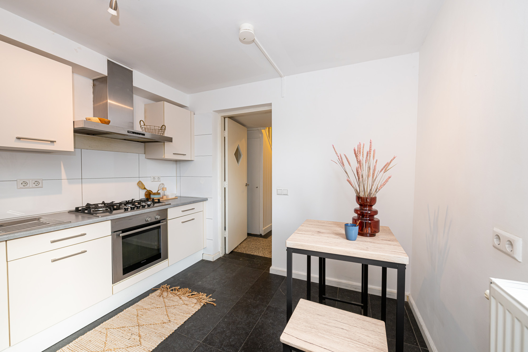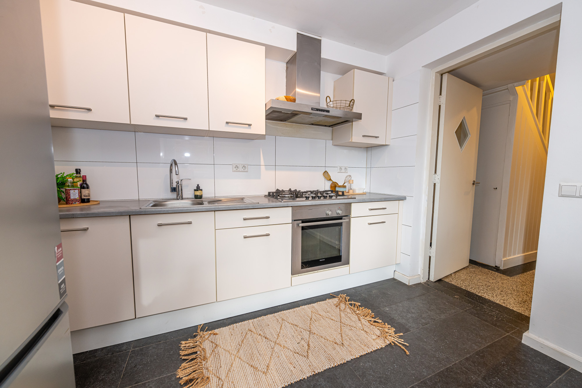 In de gesloten keuken (ca. 3.00 m x 3.3 m) v.v. een plavuizenvloer treft u een in 2013 geïnstalleerde aanbouwkeuken incl. apparatuur aan te weten, 5-pits gaskookplaat, wasemkap, oven en losse koelkast.
