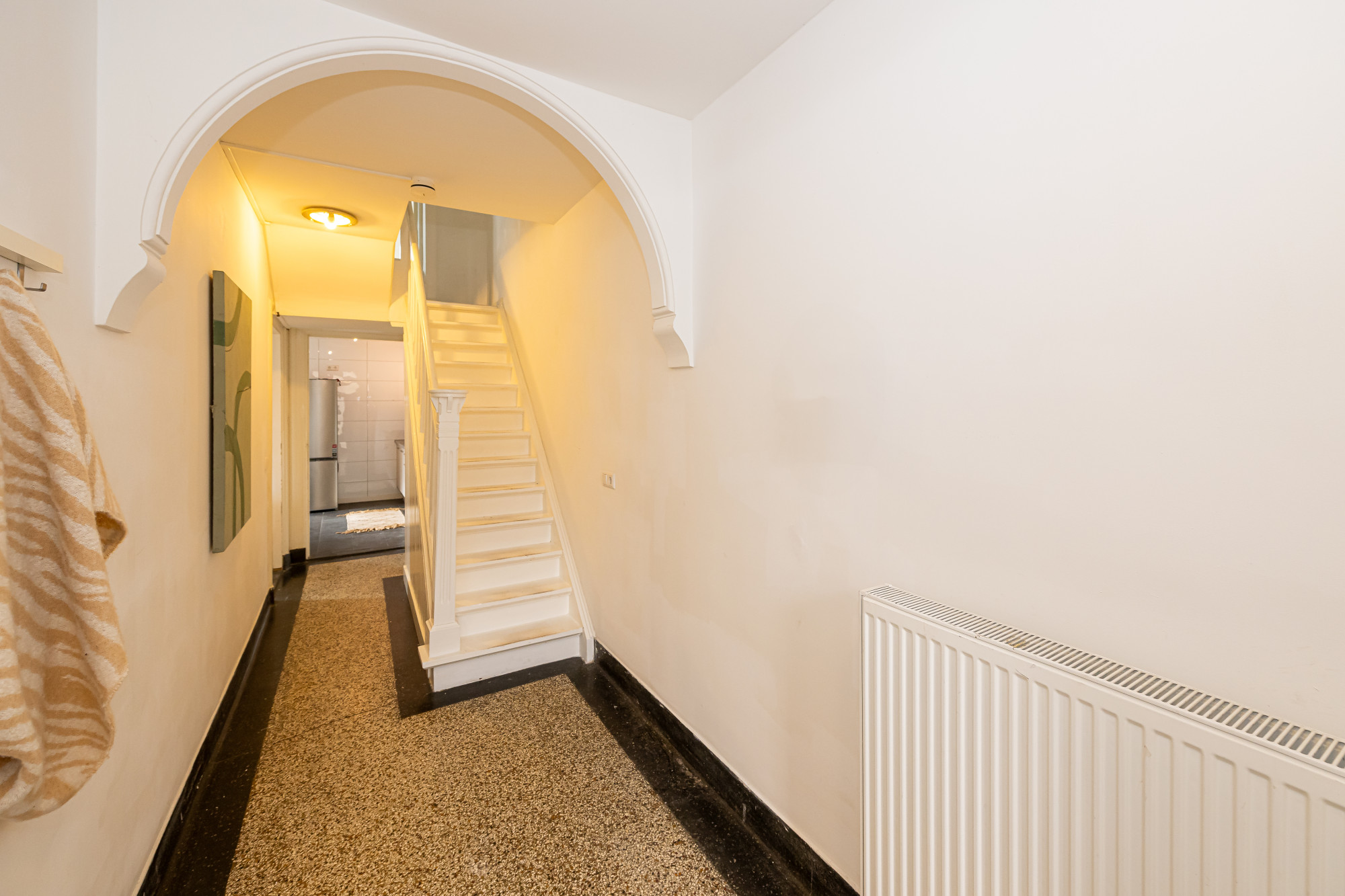 De ruime hal (1.69 m x 8.13 m) v.v. terrazzo vloer en fraaie dubbele steektrap met tussenbordes leidt naar de eerste verdieping, de woonkamer en de kelder. Hier bevindt zich ook de moderne meterkast (2013) met slimme meter. De hal, met voldoende ruimte voor een garderobe, geeft direct de sfeer weer die deze fijne woning biedt.