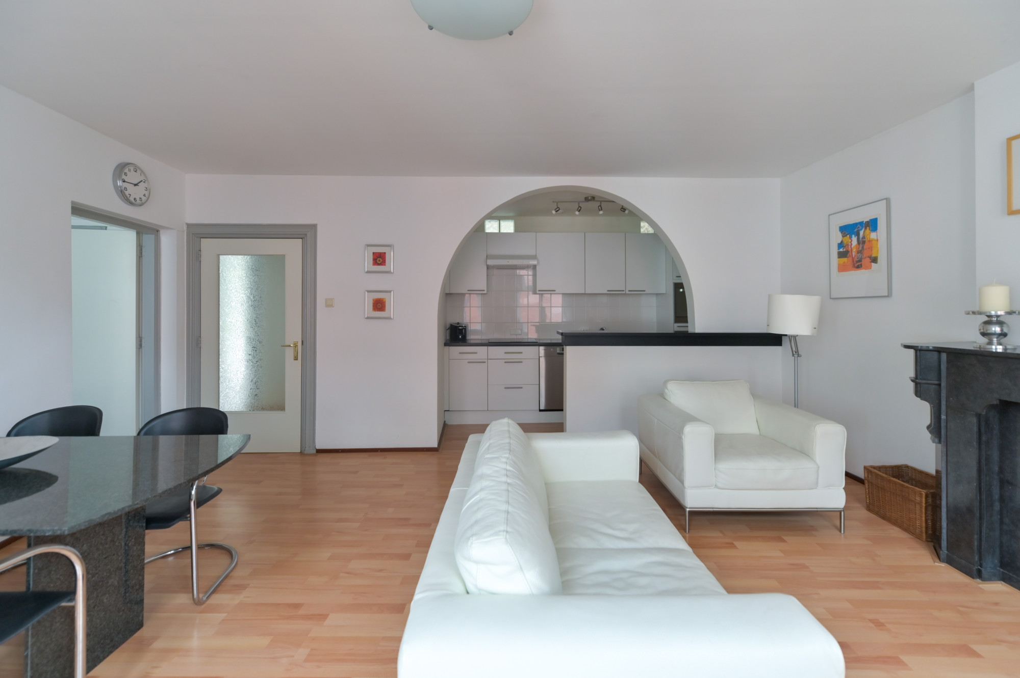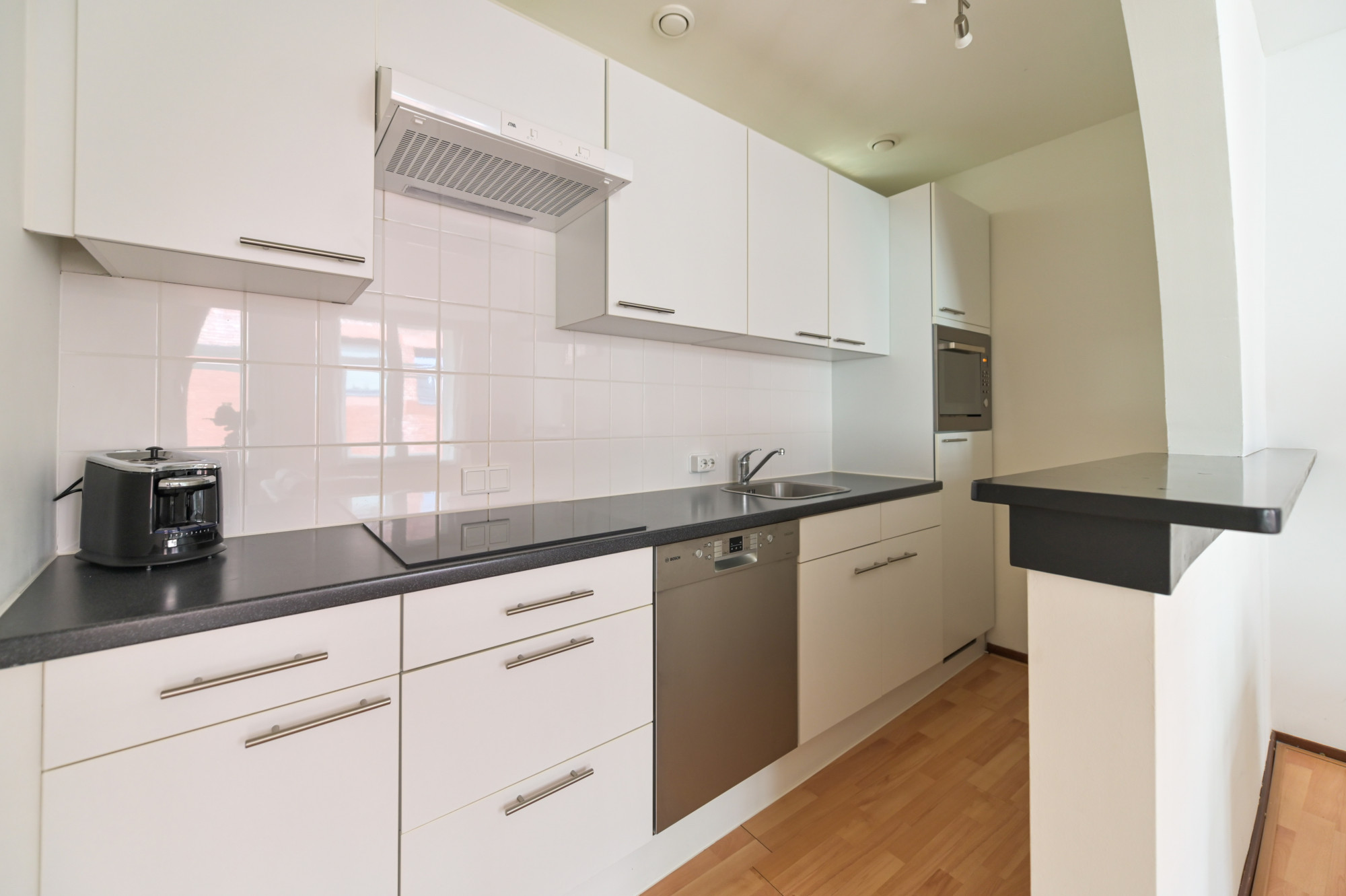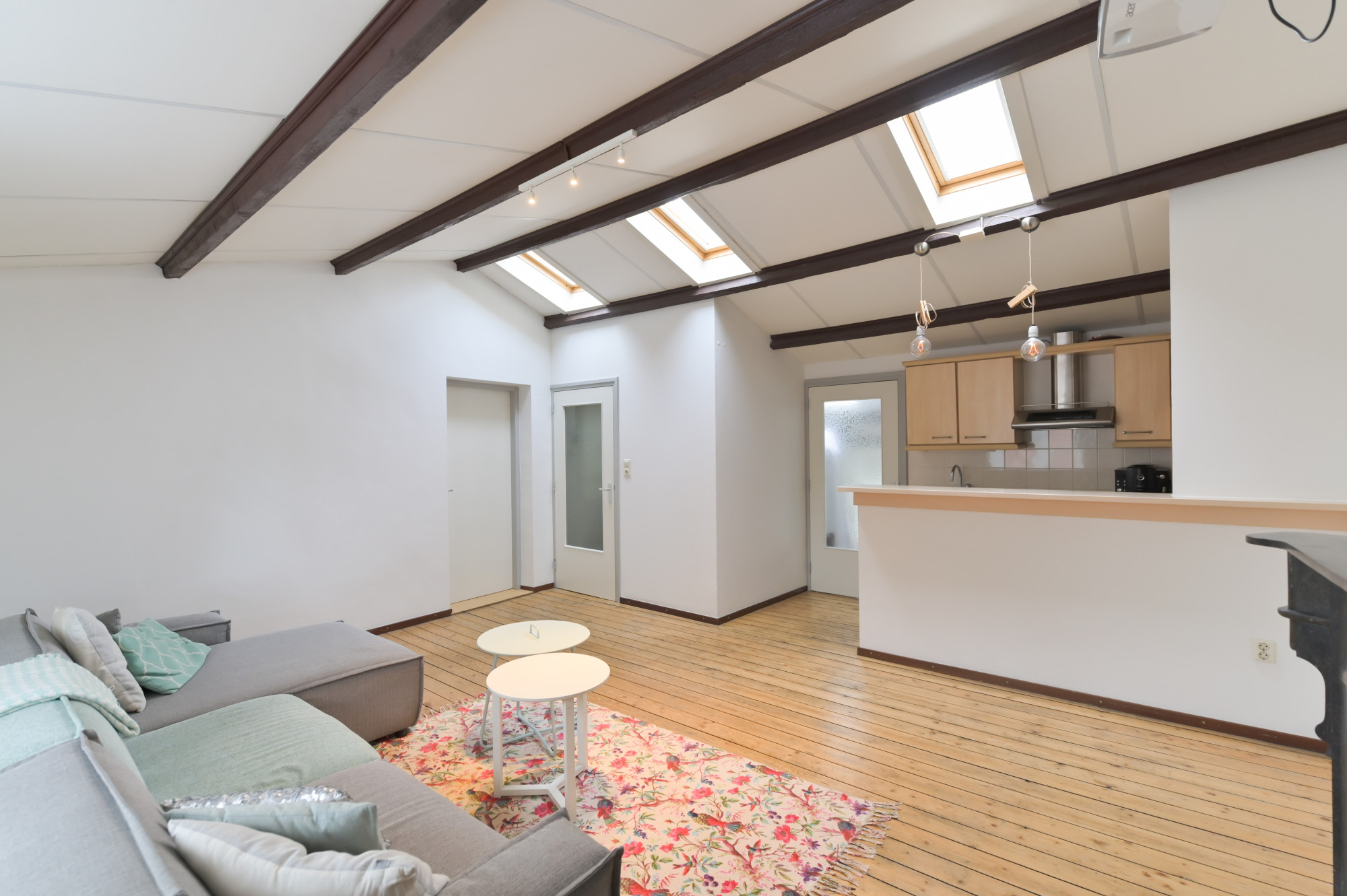 Hier vind je een royale woonkamer met open keuken, twee slaapkamers, een badkamer met ligbad en witgoedaansluitingen, een separaat toilet en toegang tot een tweede dakterras. Een extra kast biedt ruimte aan twee HR-ketels en een boiler.