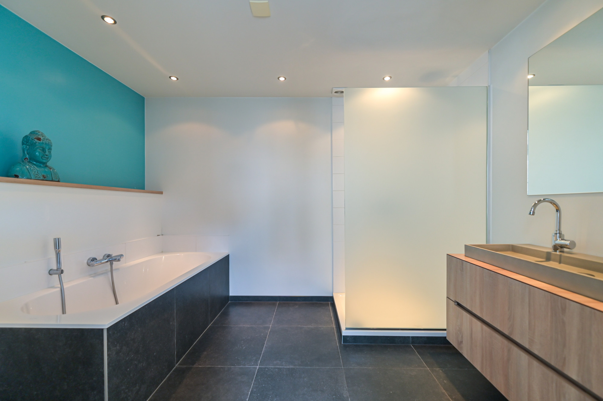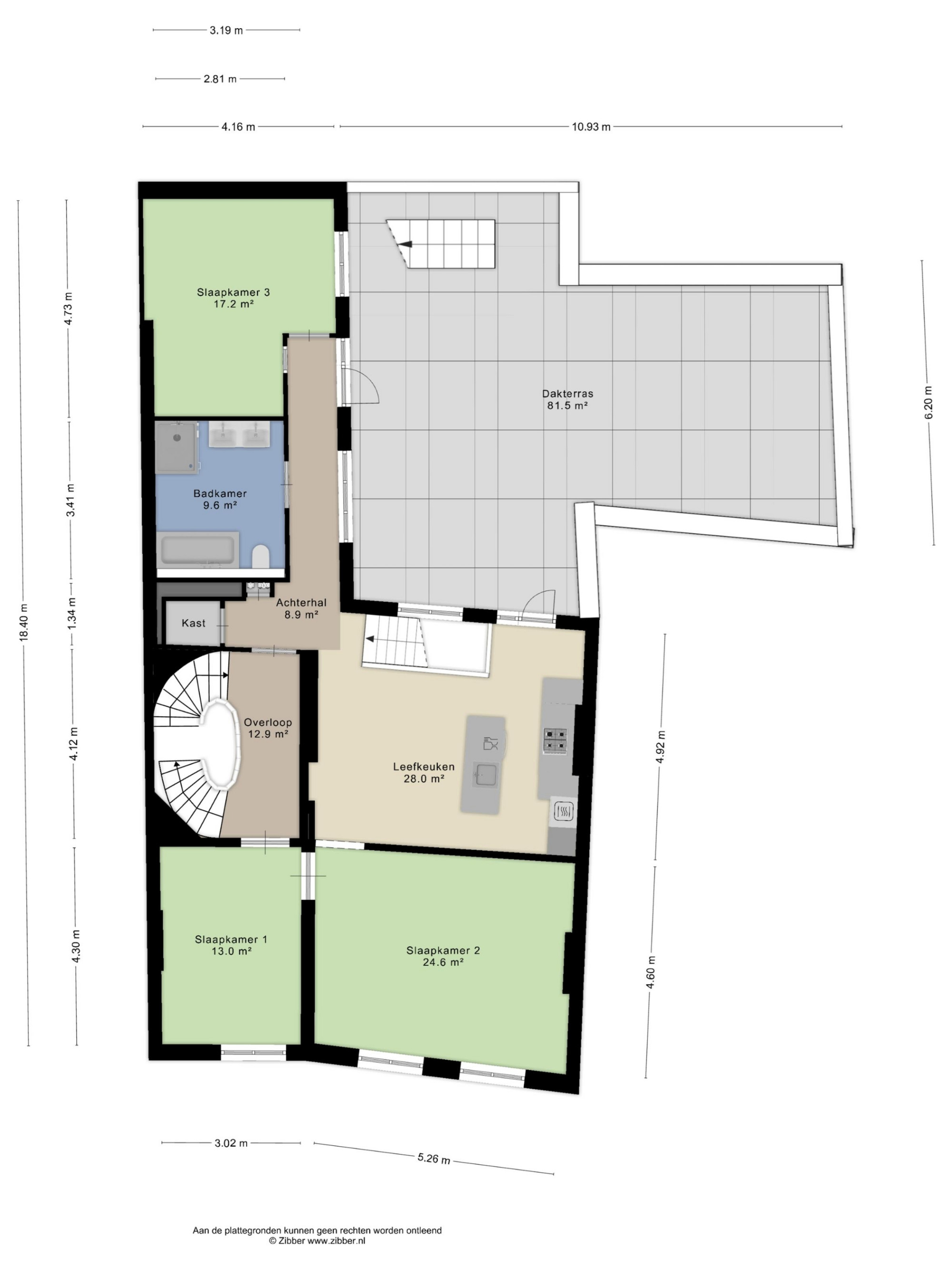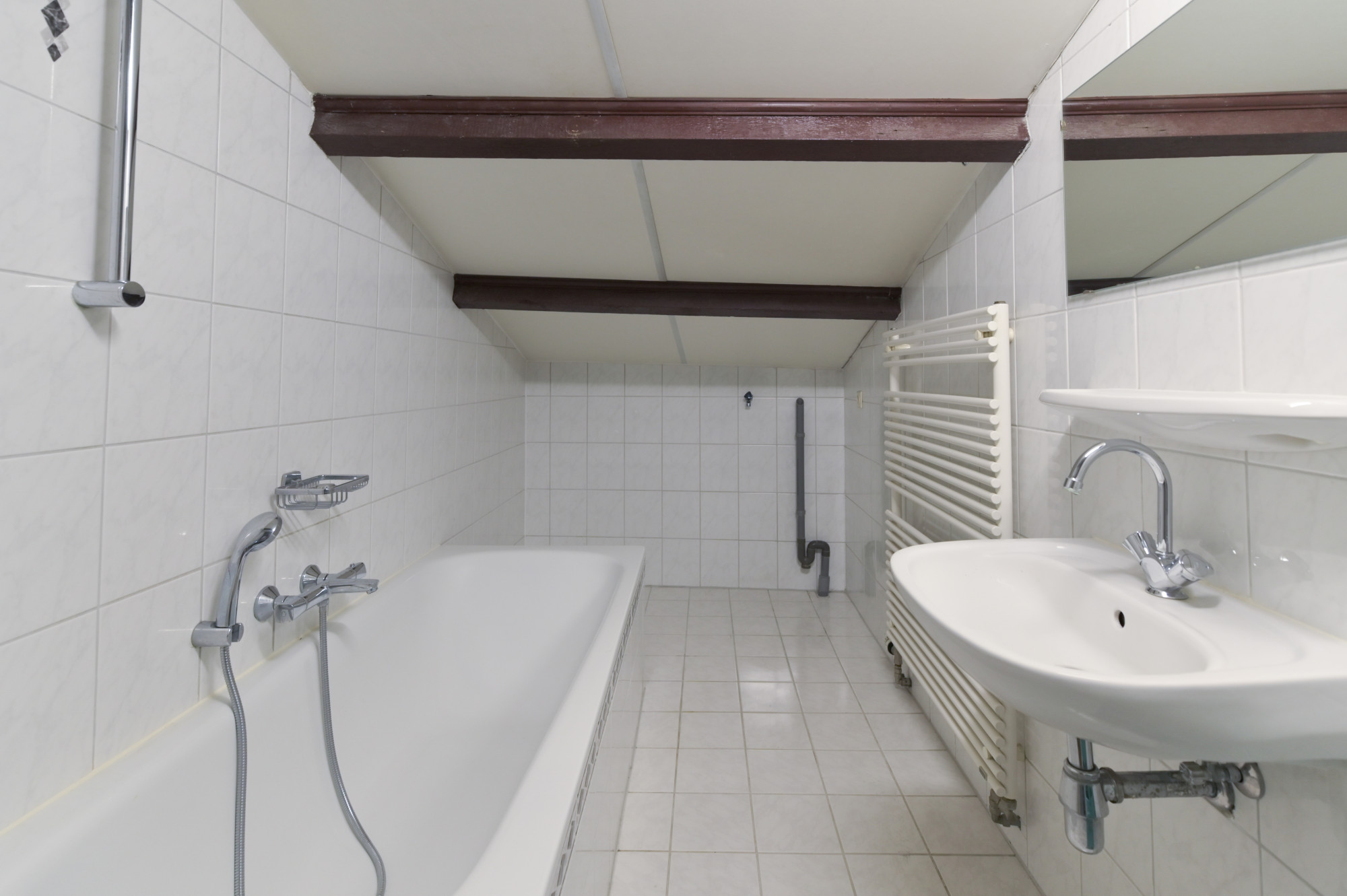 Hier vind je een royale woonkamer met open keuken, twee slaapkamers, een badkamer met ligbad en witgoedaansluitingen, een separaat toilet en toegang tot een tweede dakterras. Een extra kast biedt ruimte aan twee HR-ketels en een boiler.