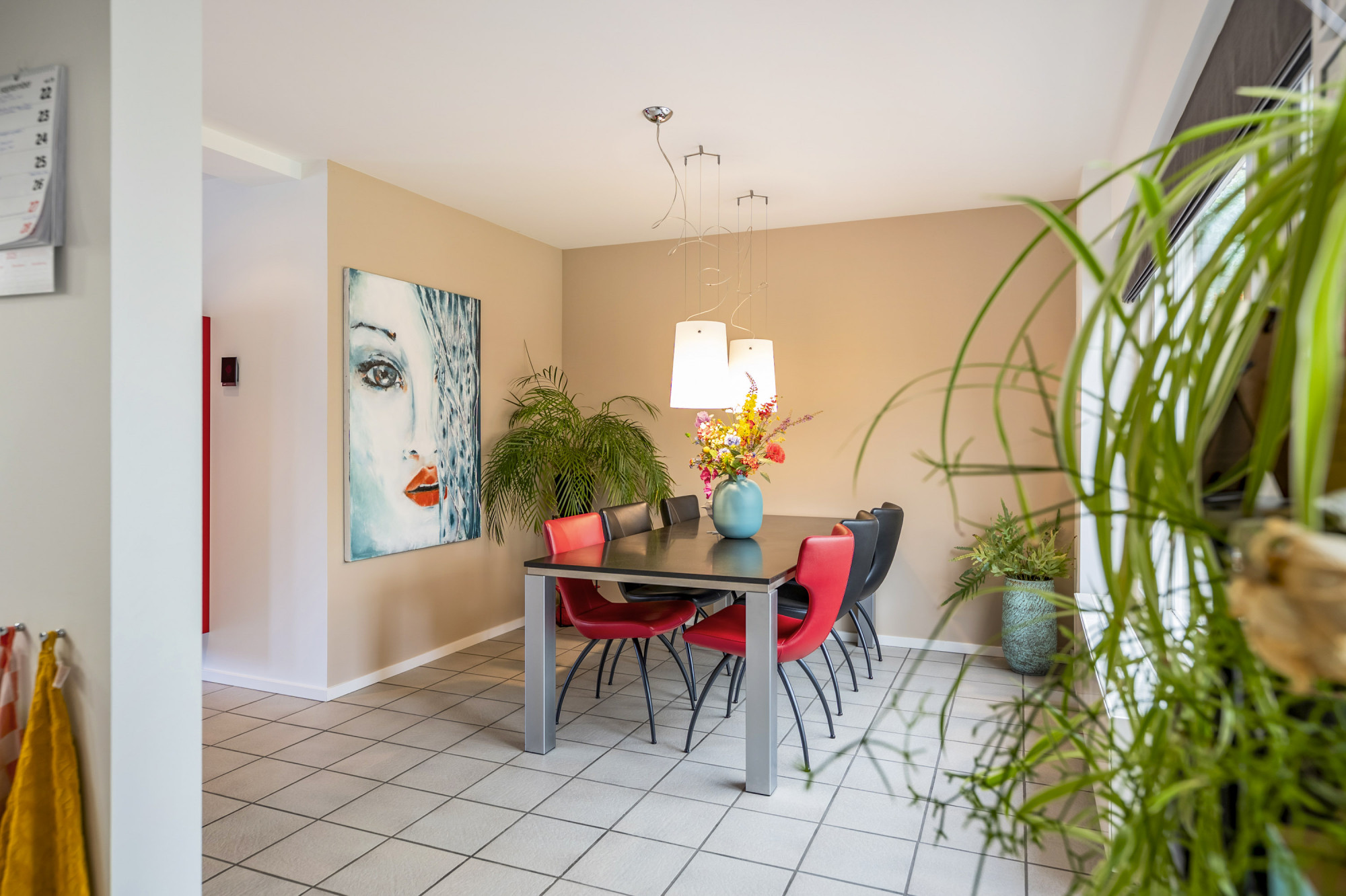Eetkamer (4.10 x 3.50 m) voorzien van tegelvloer en dubbele openslaande tuindeuren naar de overkapping en achtertuin.