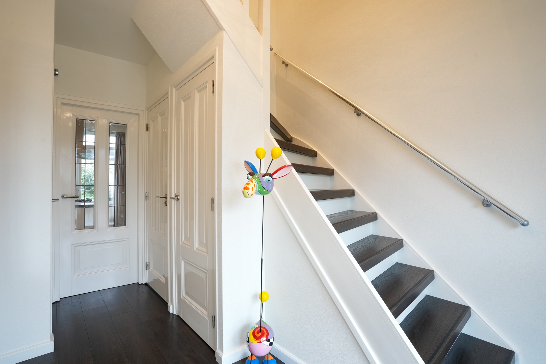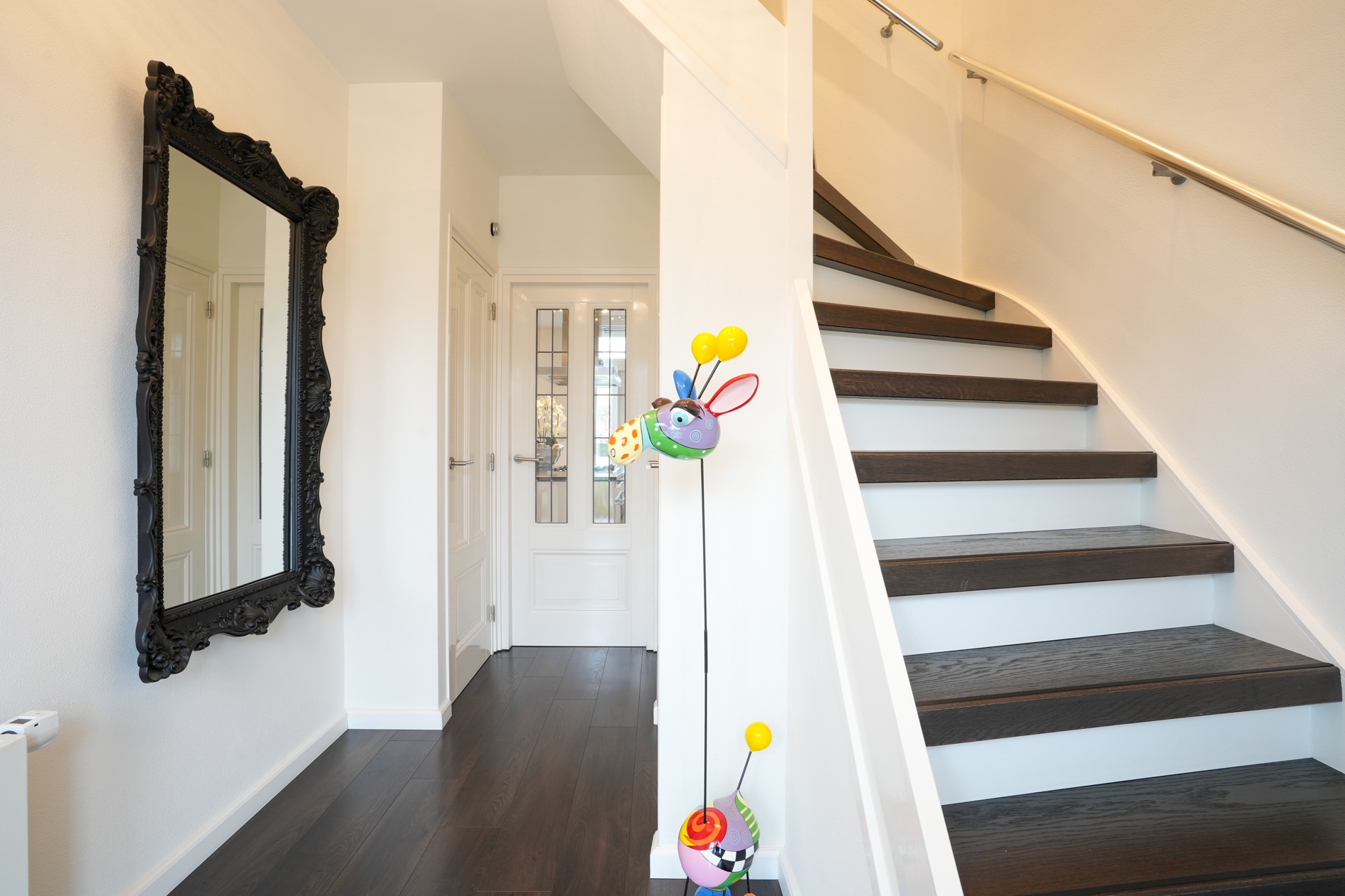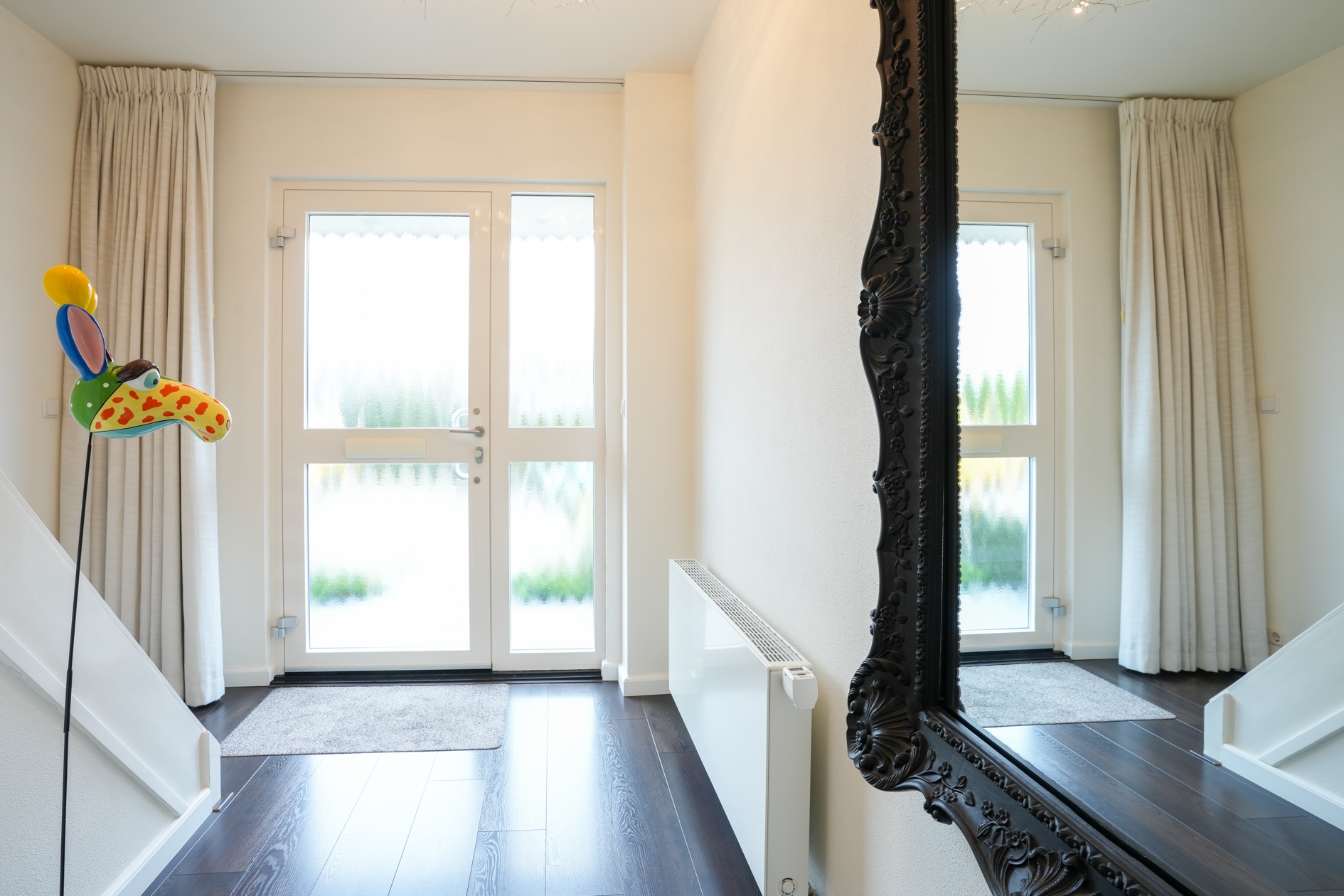 Via de fraai aangelegde voortuin met natuurstenen pad en stijlvolle beplanting bereikt u de entree. Binnen treft u een stijfvolle hal met garderobe, een moderne meterkast en een toilet met natuurstenen vloer.