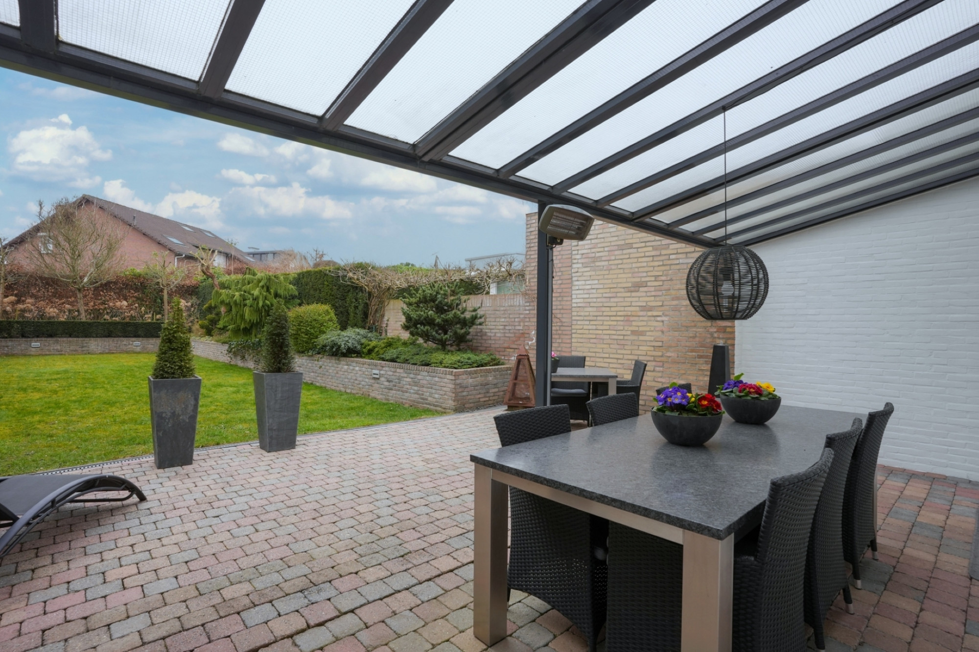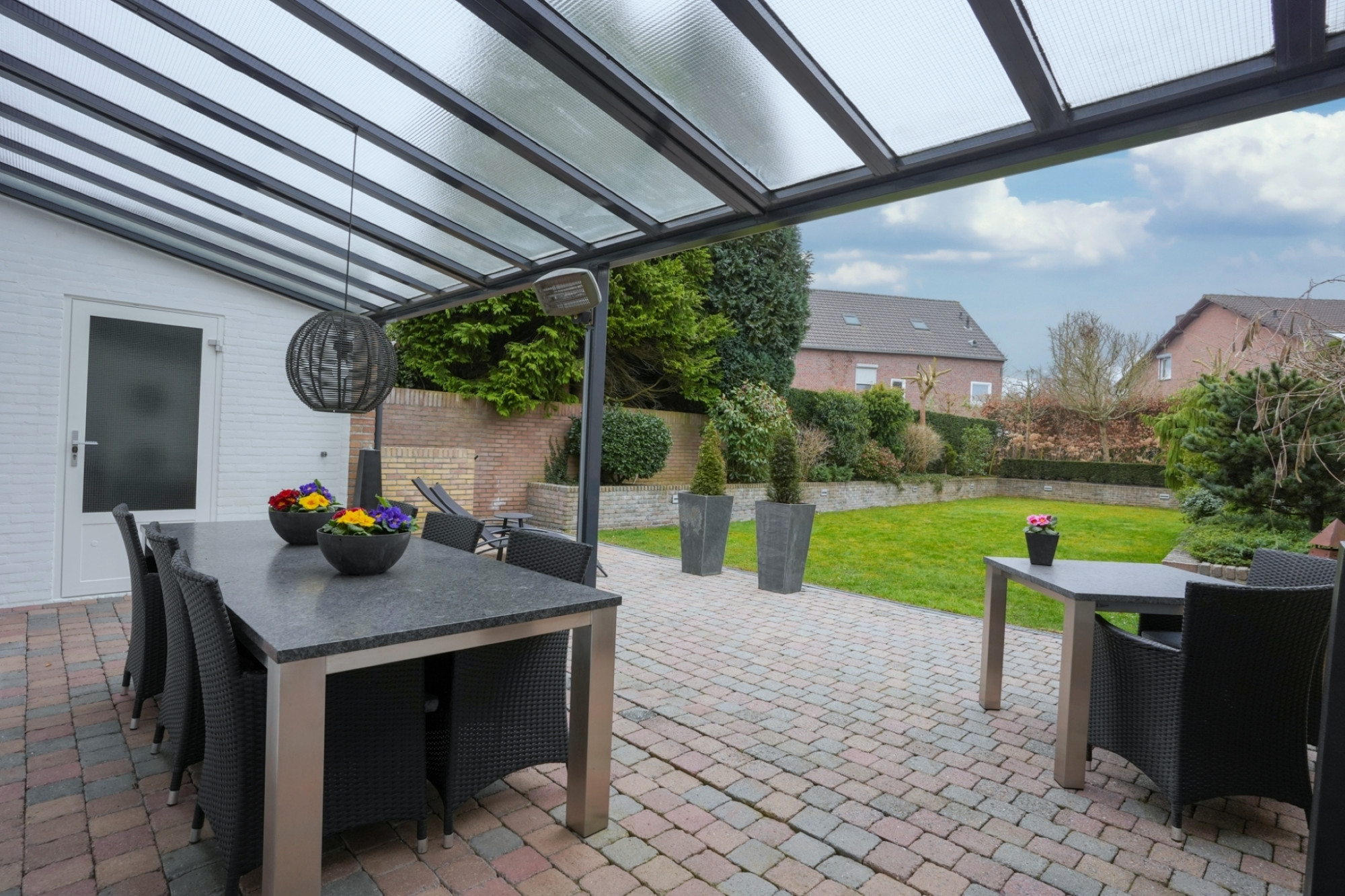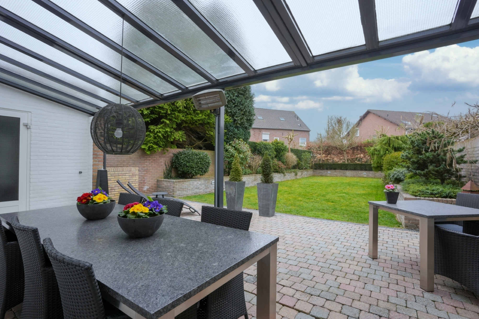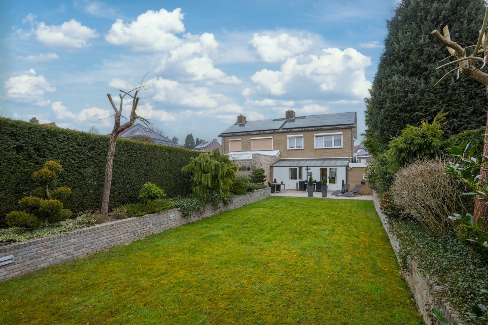 Via openslaande deuren stapt u de ruime en zonnige, zuidelijk gelegen tuin in, waar u geniet van volledige privacy. Het grote terras met veranda en het geïntegreerde irrigatiesysteem maken het buitenleven hier extra aangenaam.