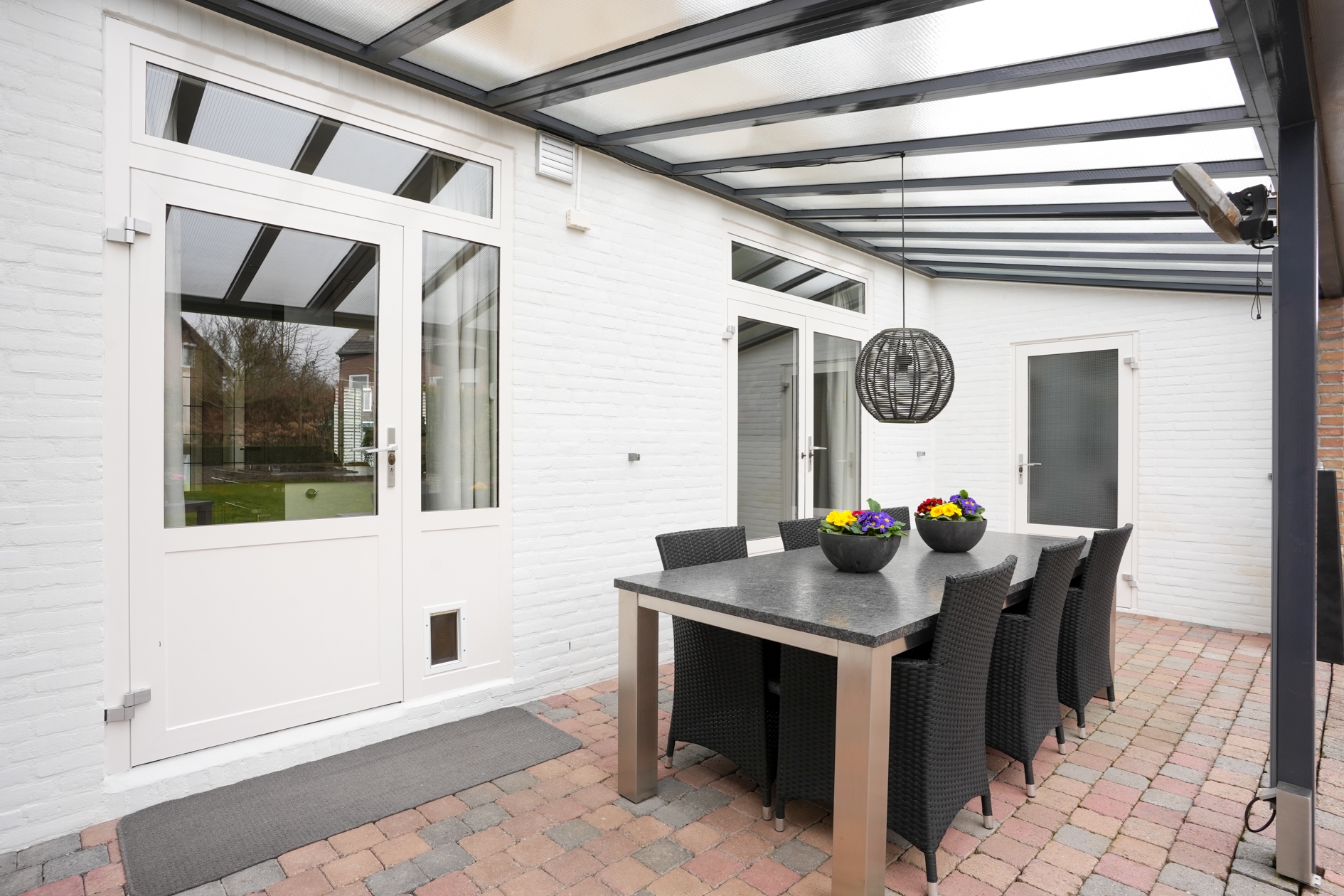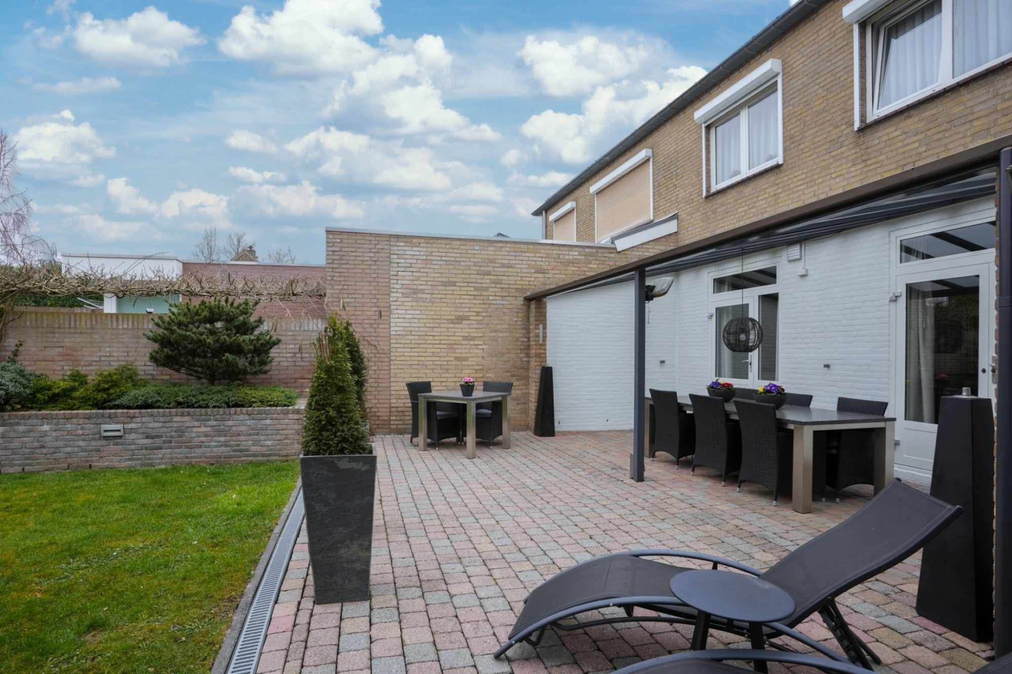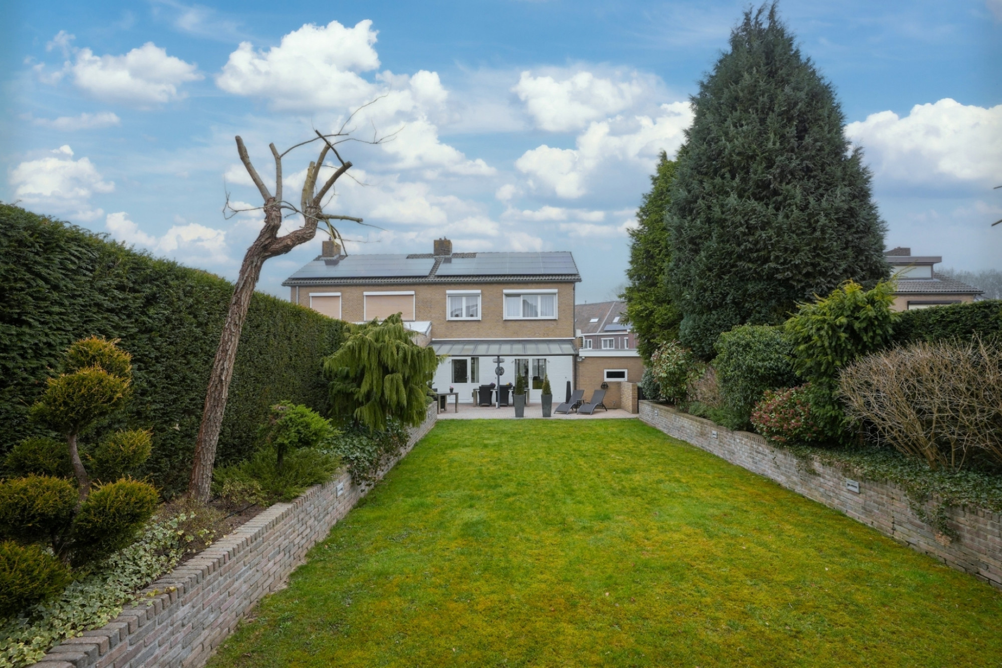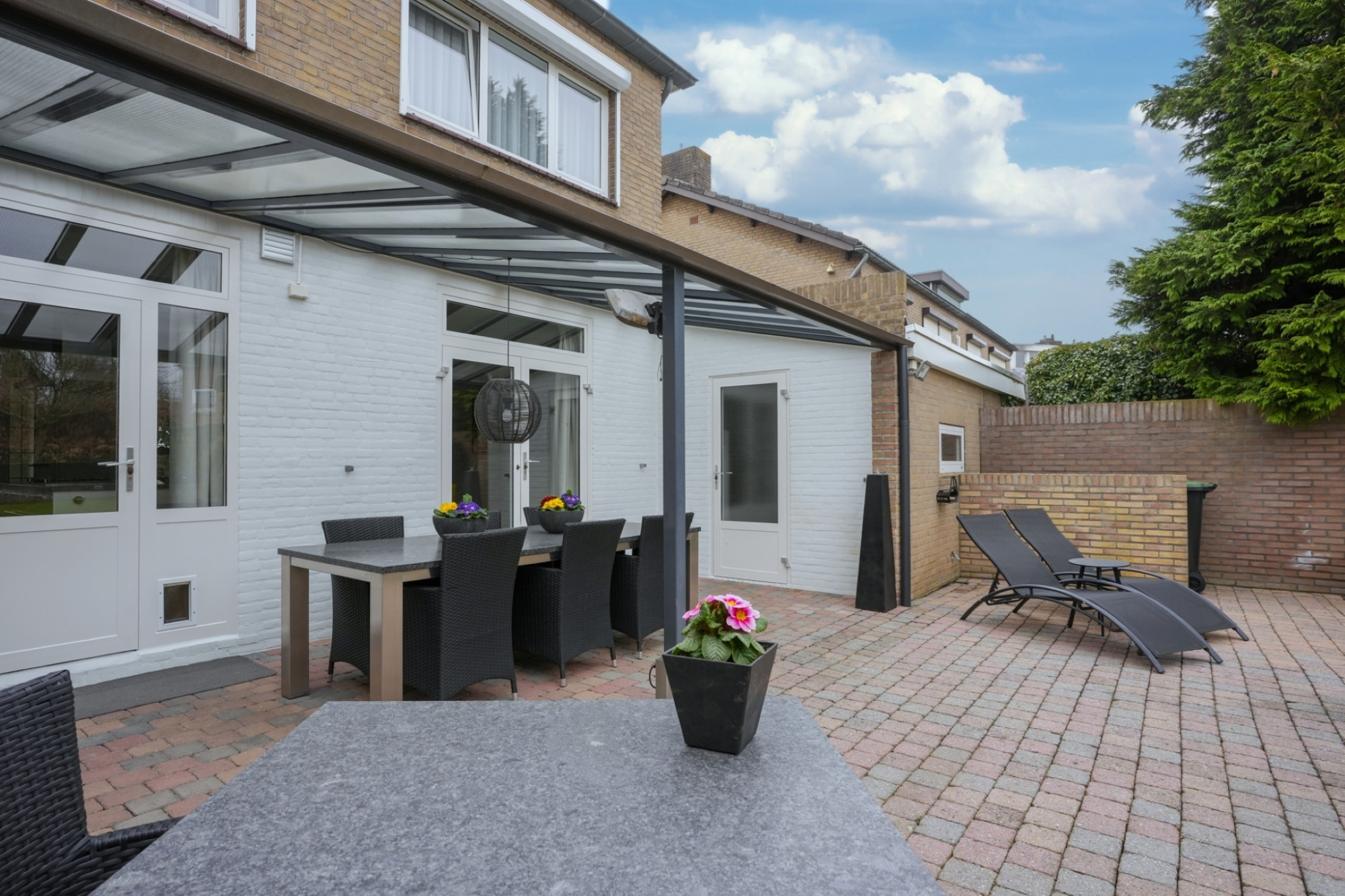 Via openslaande deuren stapt u de ruime en zonnige, zuidelijk gelegen tuin in, waar u geniet van volledige privacy. Het grote terras met veranda en het geïntegreerde irrigatiesysteem maken het buitenleven hier extra aangenaam.