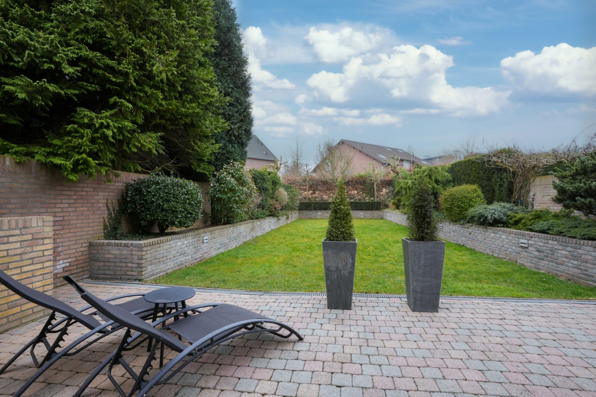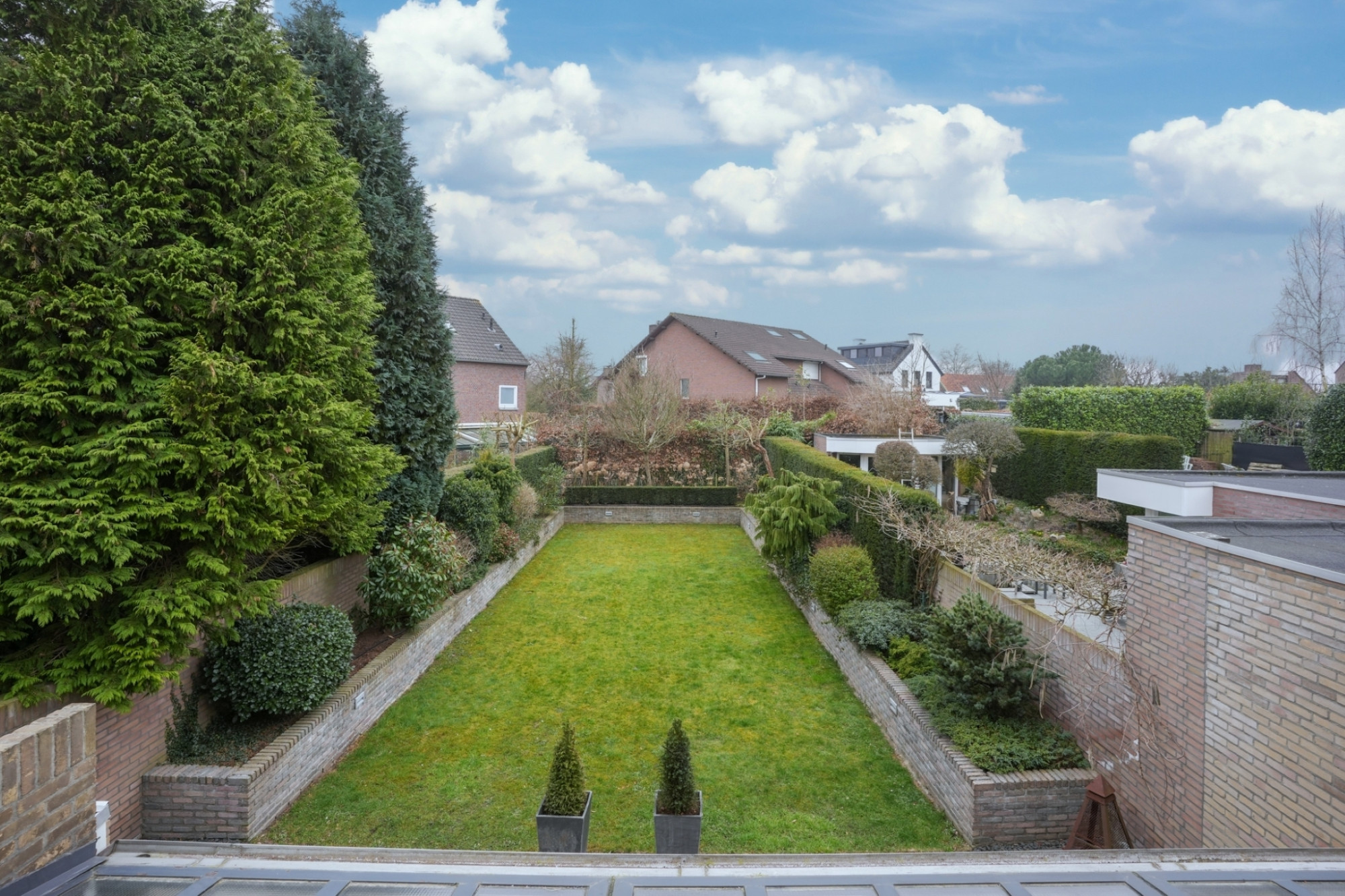- Irrigatiesysteem: dankzij het automatische irrigatiesysteem blijven zowel het gazon als de plantenborders altijd groen en gezond