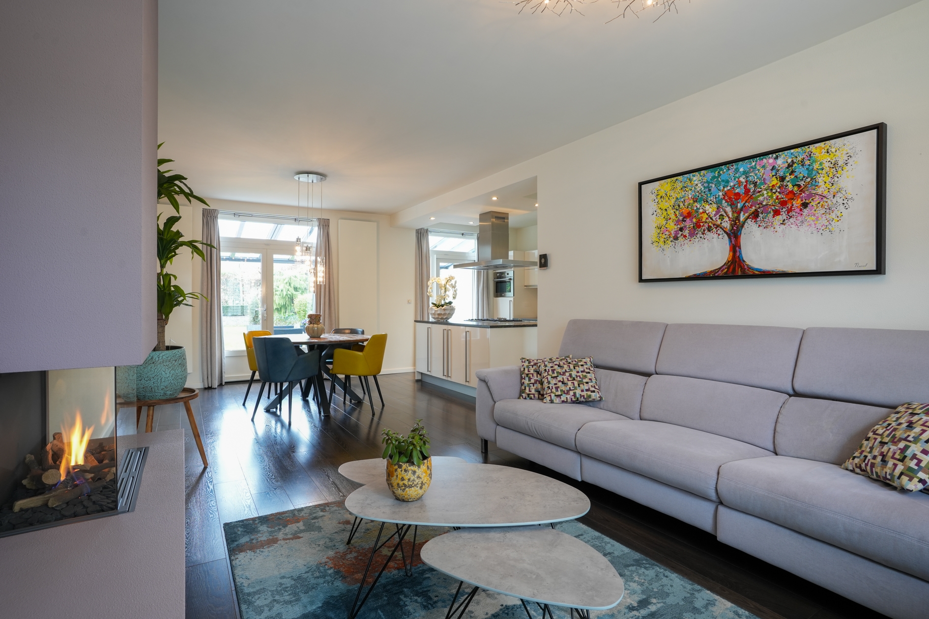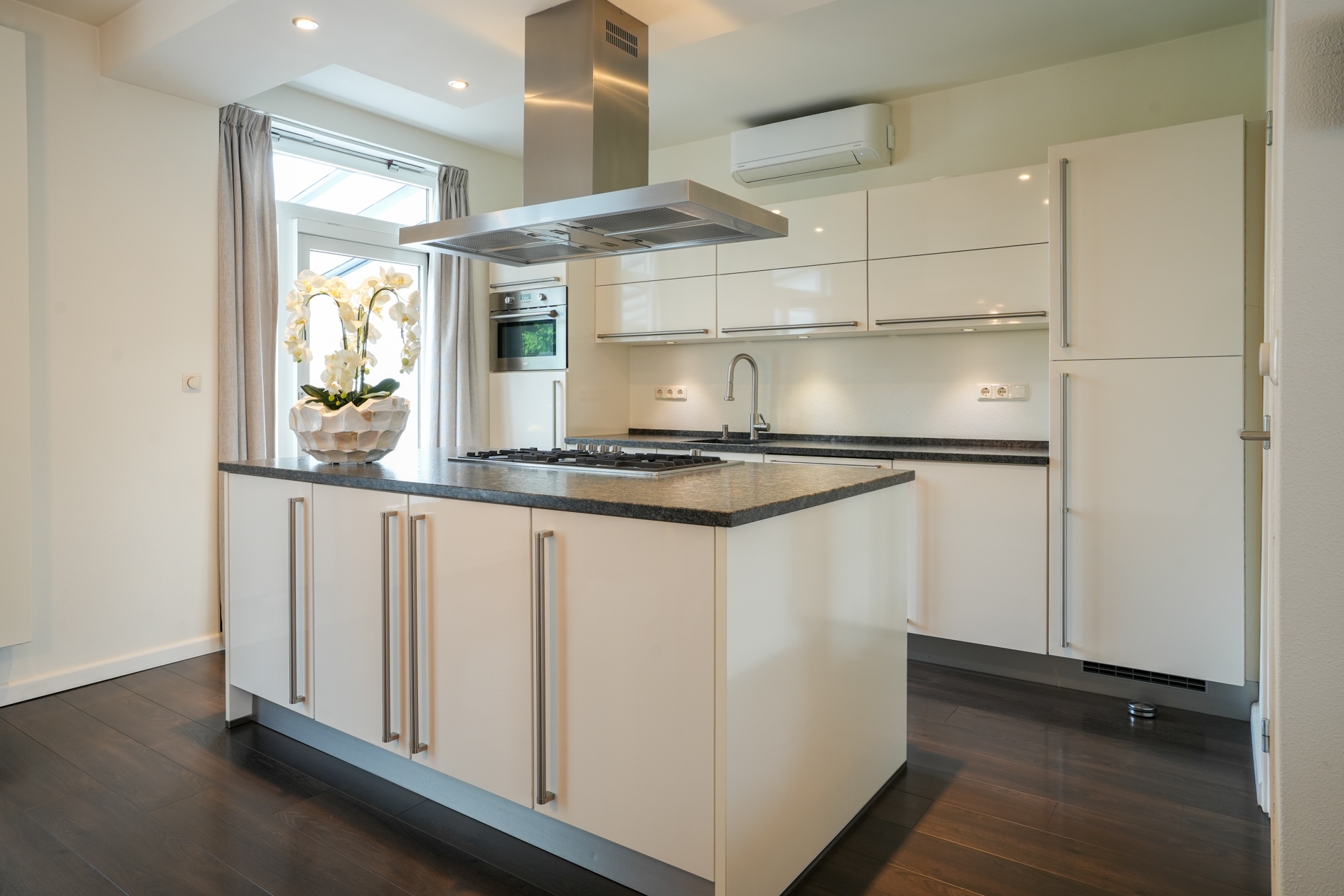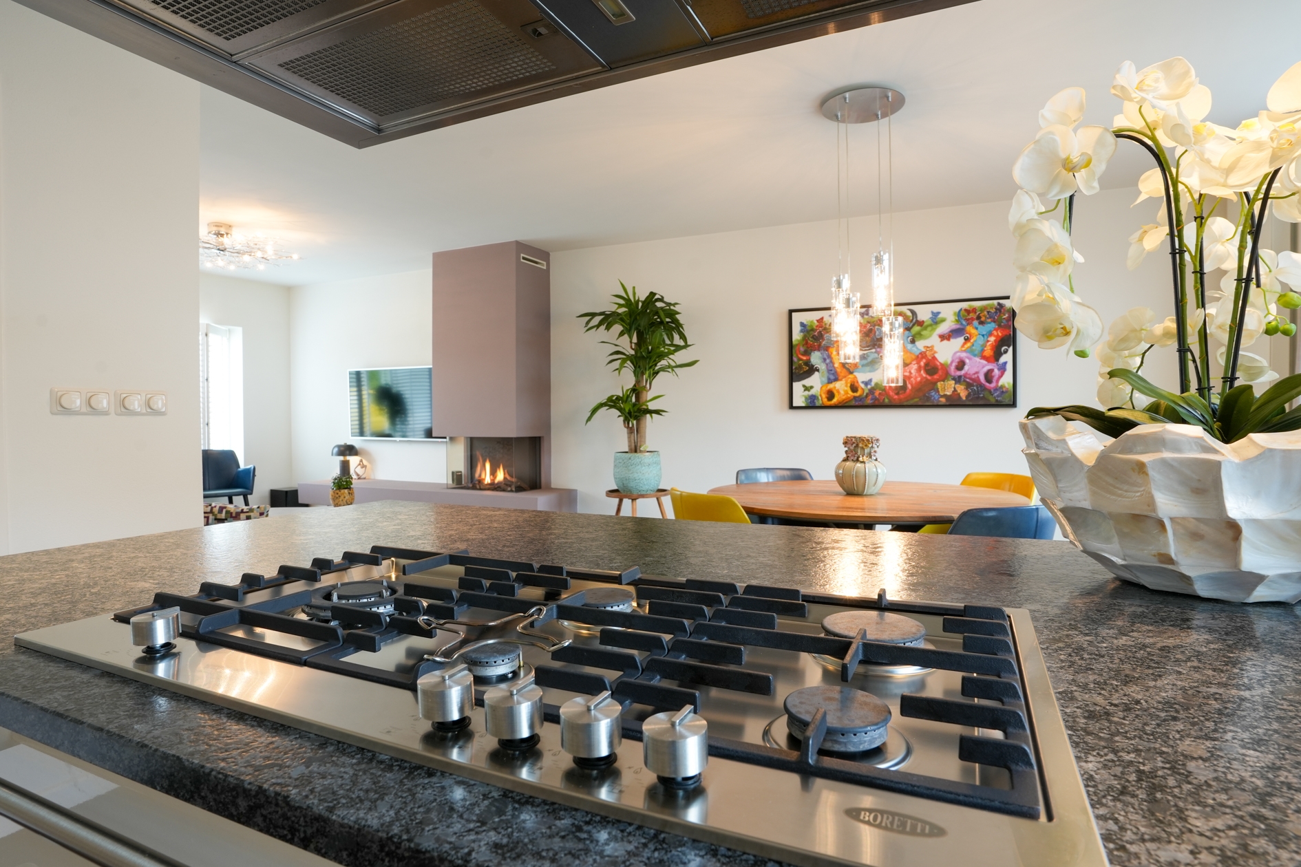 De lichte en ruimtelijke woonkamer is voorzien van een sfeervol plateau met Dru haard, houten shutters aan de voorzijde en een hoogwaardige laminaatvloer. De open keuken met een natuurstenen aanrechtblad is een droom voor kookliefhebbers en uitgerust met Boretti inbouwapparatuur, een ruim kookeiland met 5-pits gasfornuis en afzuigkap, een combi-heteluchtoven, vaatwasser, koelkast en een grote vriezer. Dankzij de efficiënte boiler heeft u direct warm water.