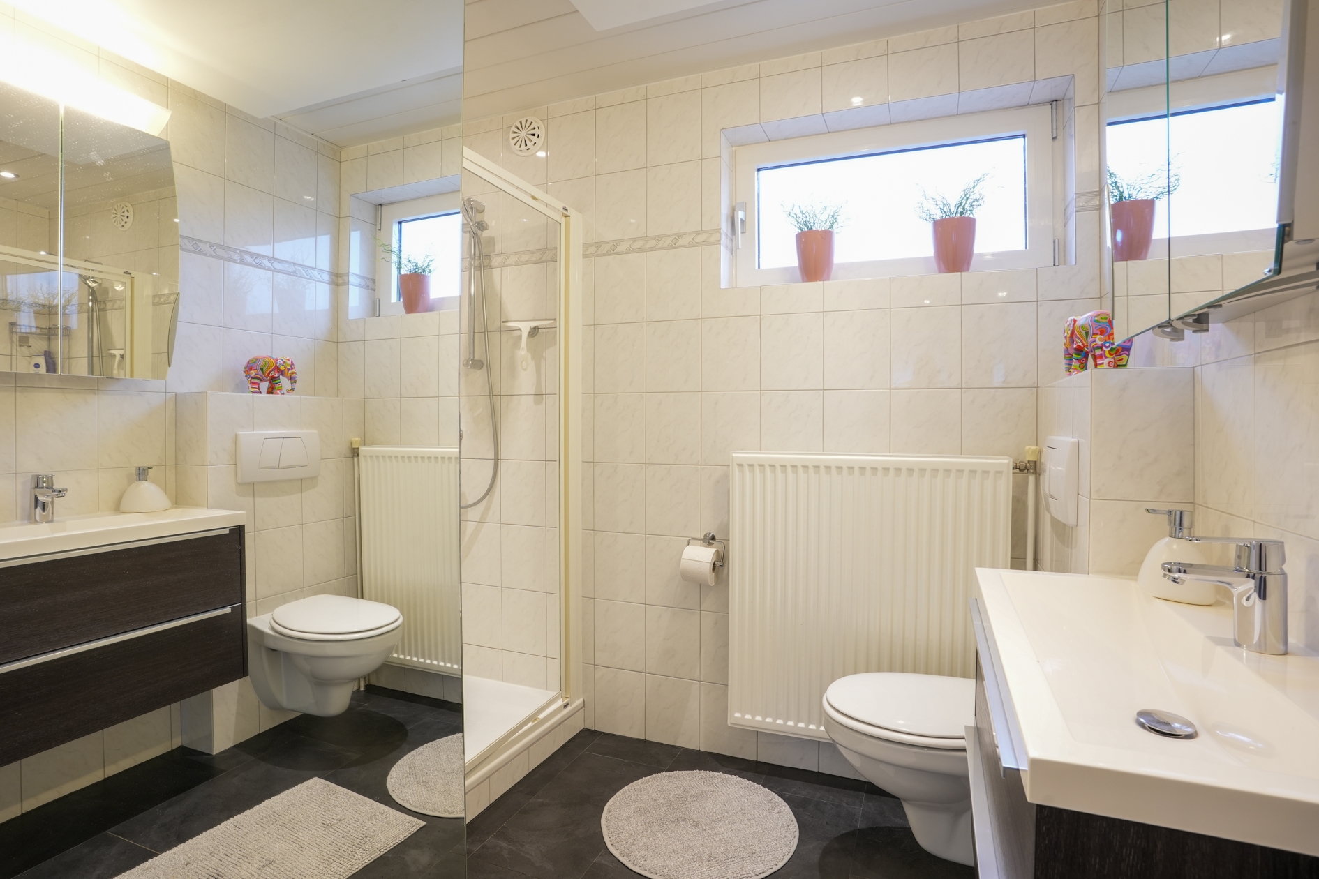De badkamer is slim ingedeeld en voorzien van een douche, zwevend toilet, wastafel met grote spiegelwand en verwarming via zowel CV als infraroodpaneel.