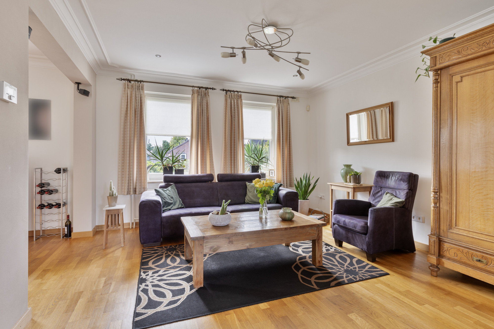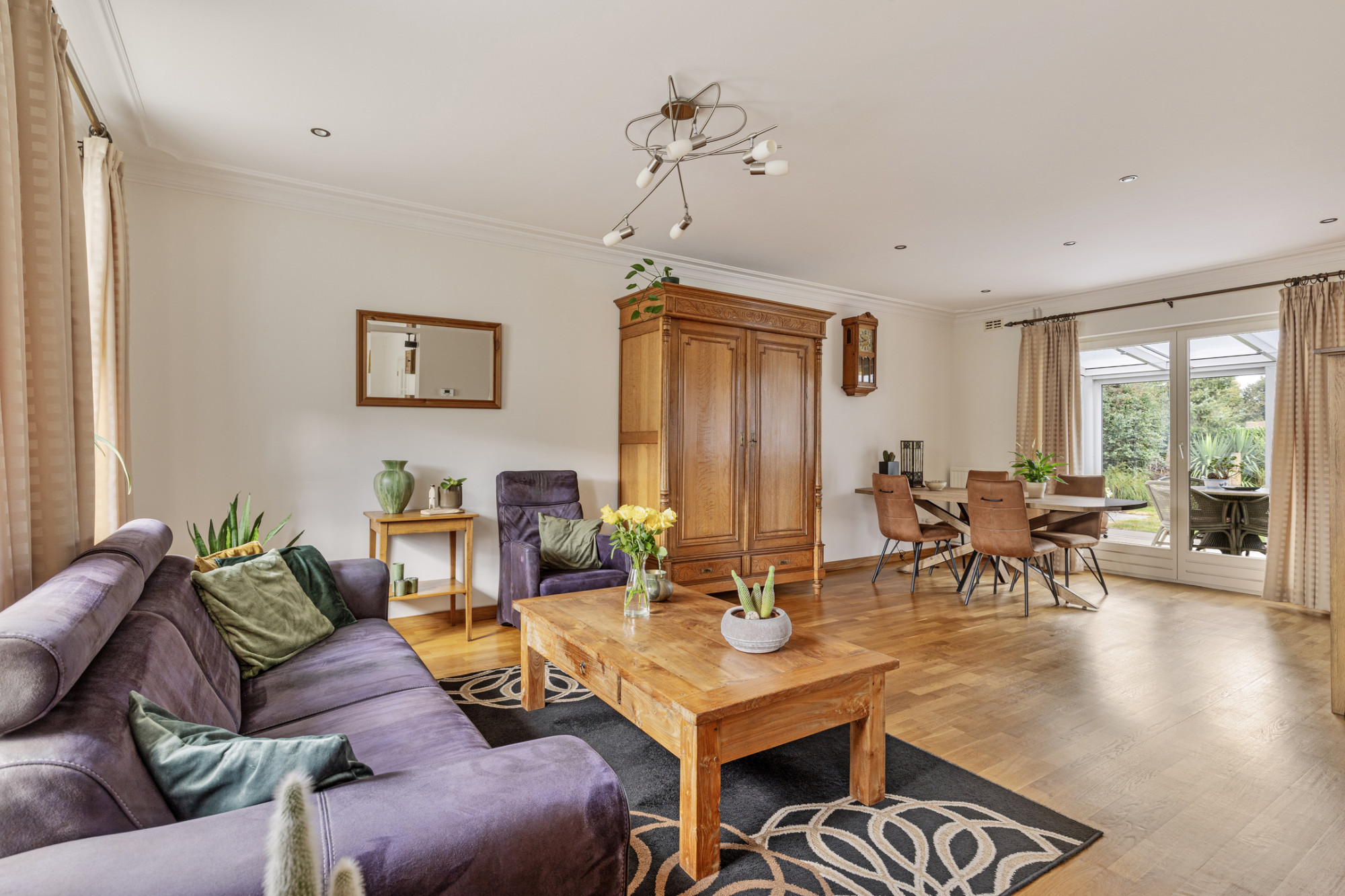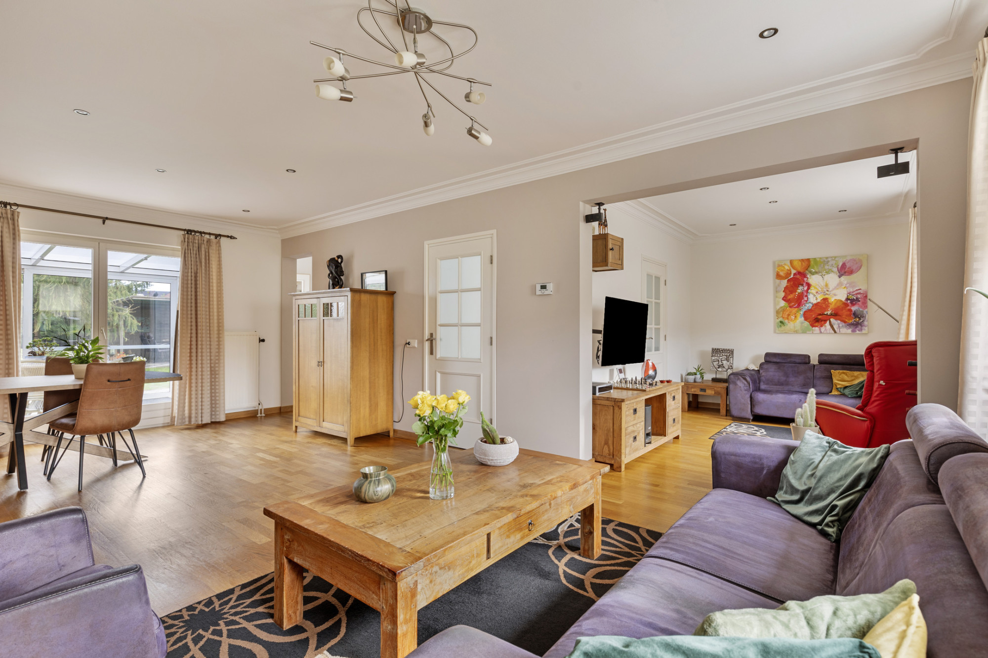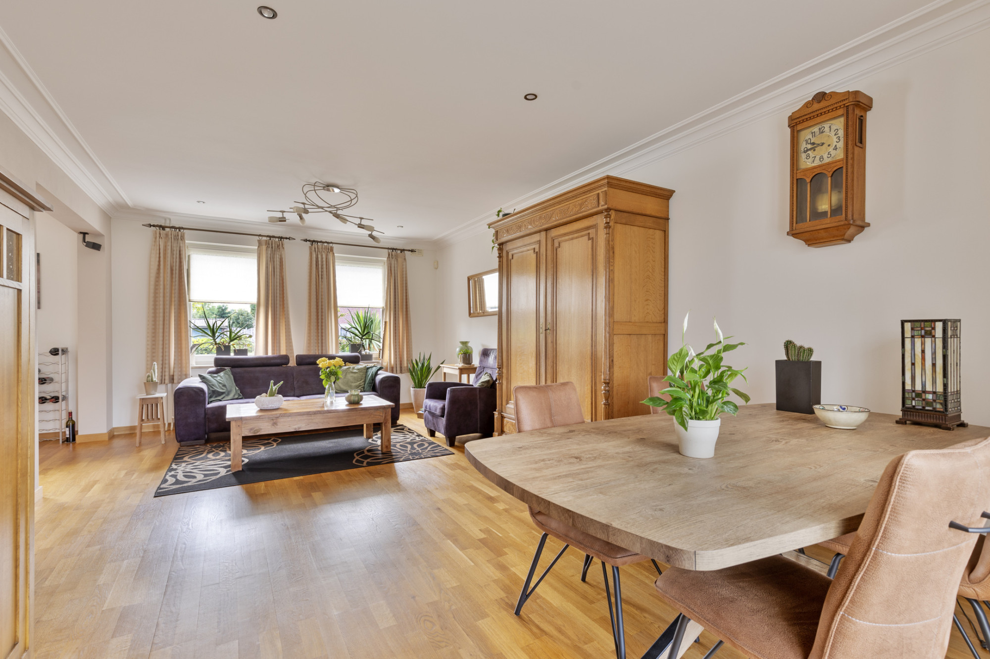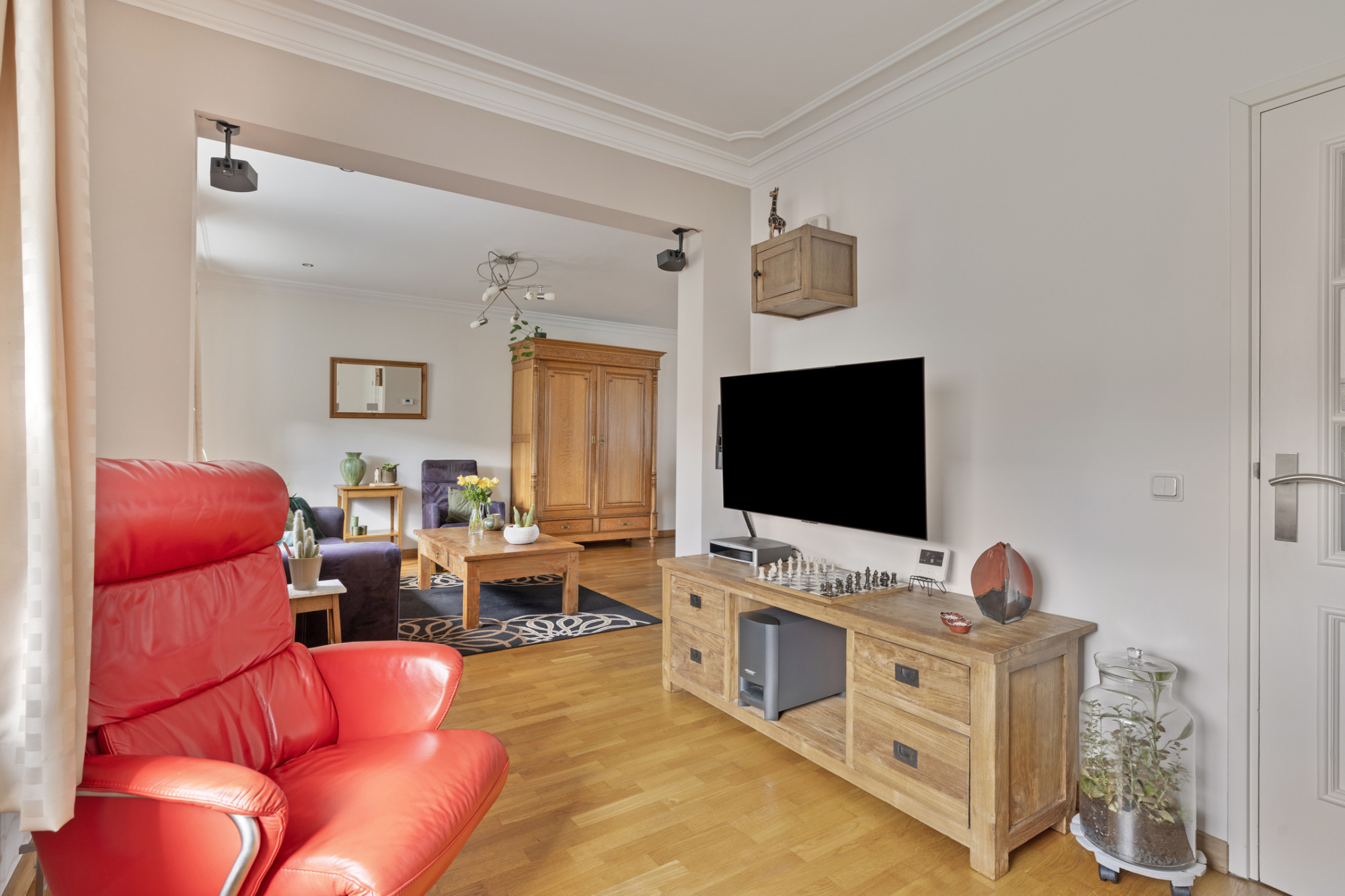 De woonkamer bevindt zich aan de voorzijde en de zijkant van de woning waardoor deze beschikt over veel natuurlijke lichtinval. Deze kamer heeft een oppervlakte van 38 m² en is afgewerkt met een stroken parketvloer en stucwerk wand- en plafondafwerking met inbouwspots.