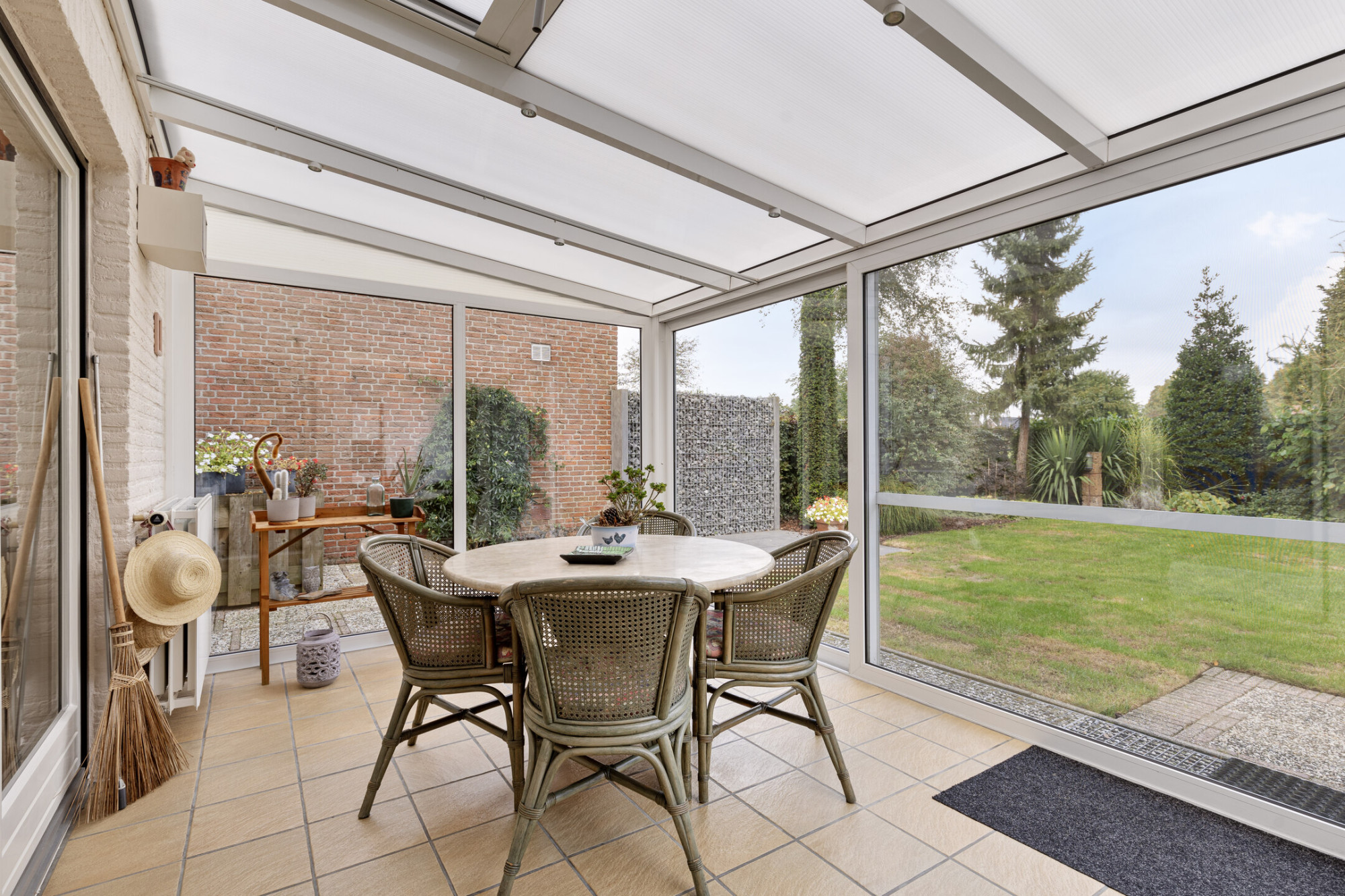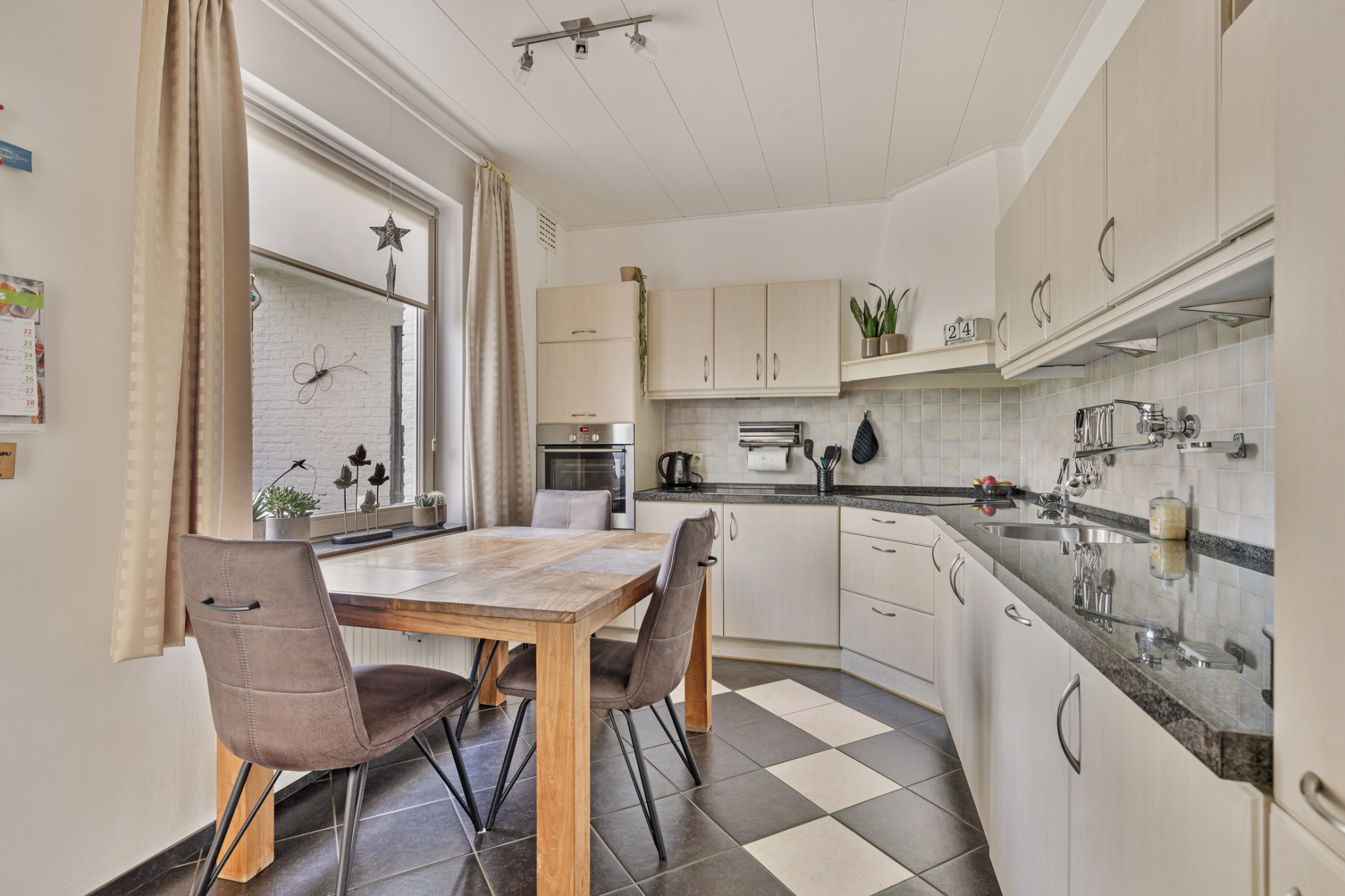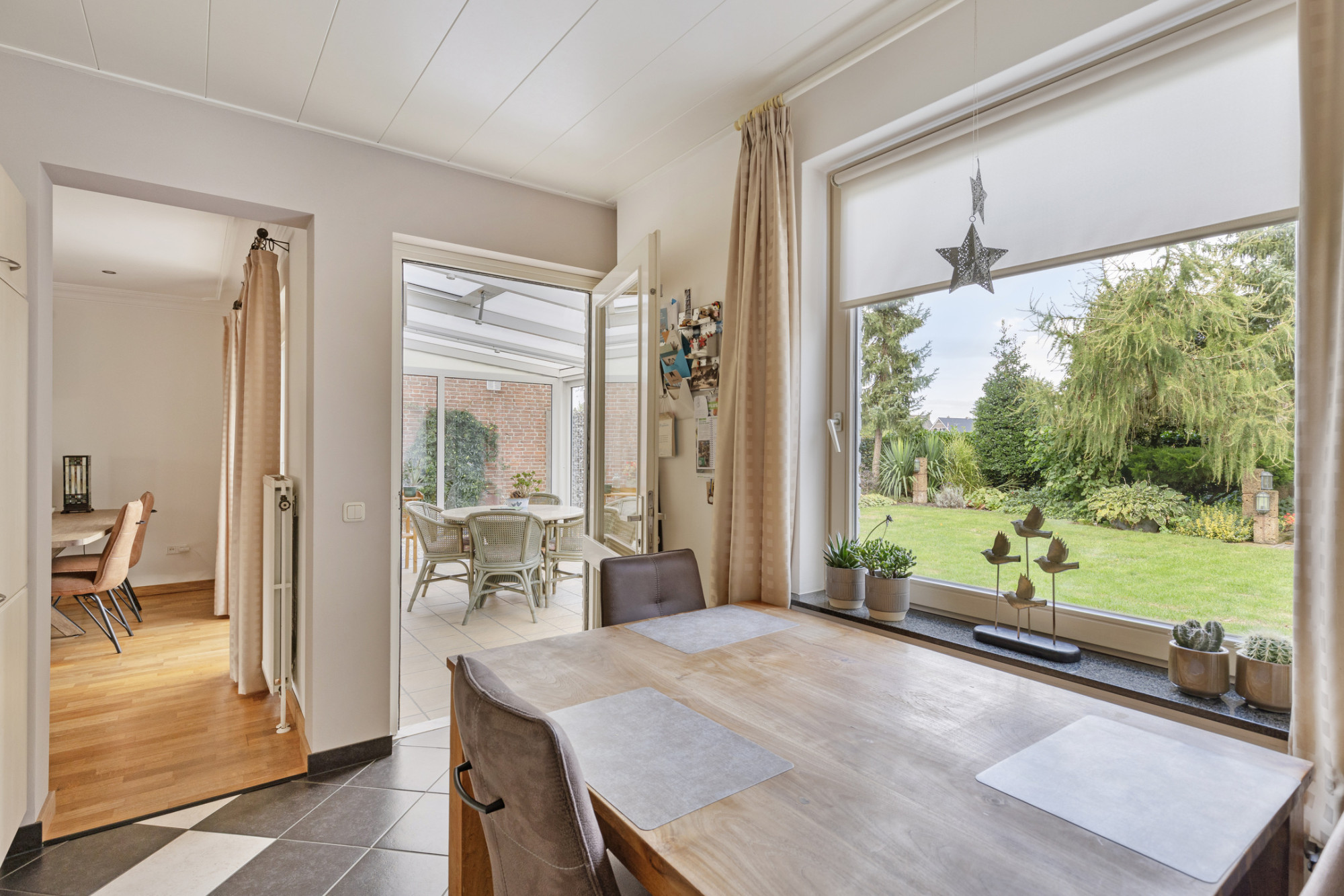 Vanuit de woonkamer is de half open keuken bereikbaar welke is voorzien van een oven, keramische kookplaat, koelkast, vaatwasser en een tal aan opbergkastjes. Aansluitend bevindt zich de serre die middels een schuifpui in verbinding staat met de achtertuin. Daarbij is er ook een directe toegang naar de serre met tuindeuren vanuit de woonkamer.