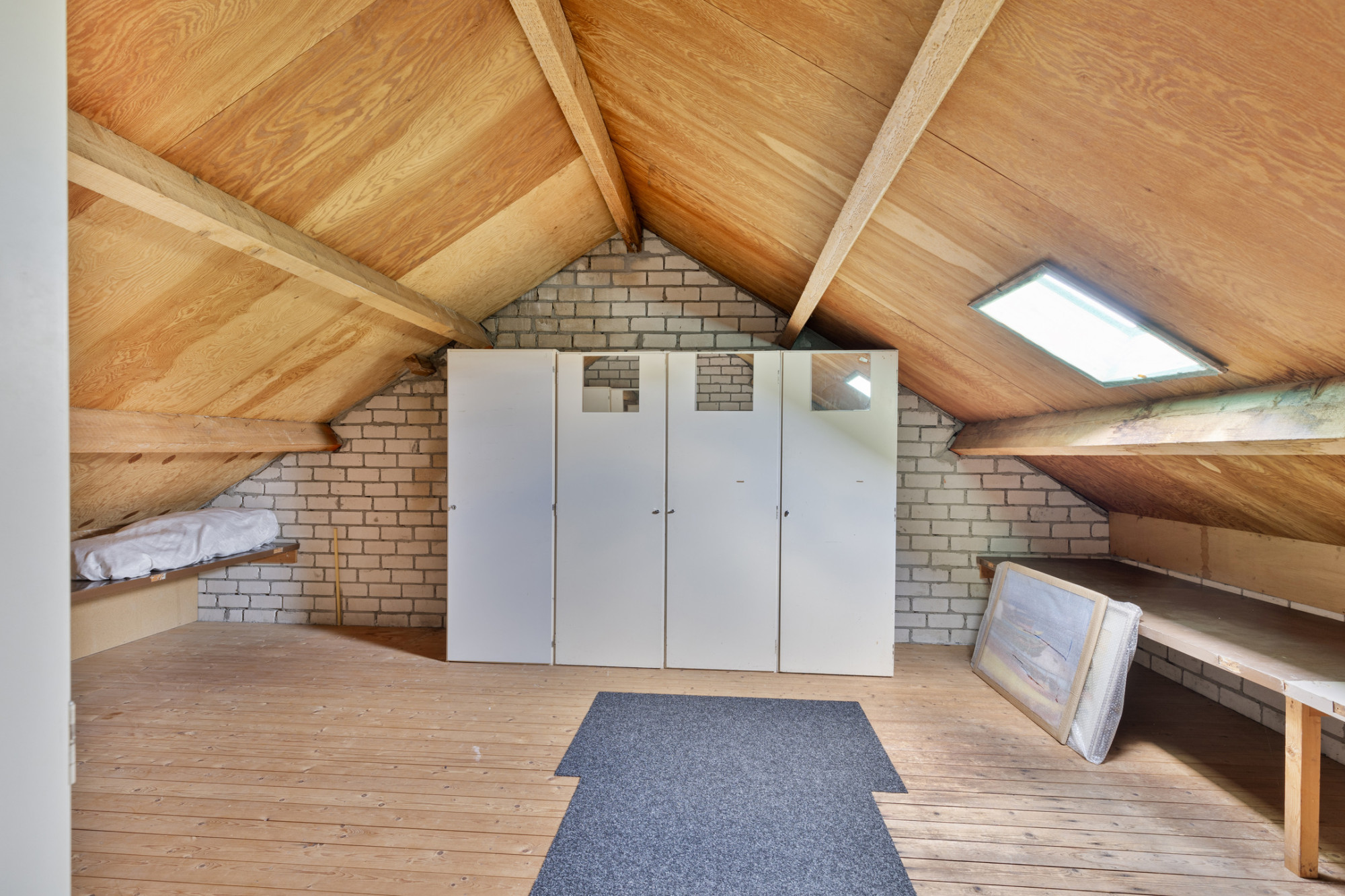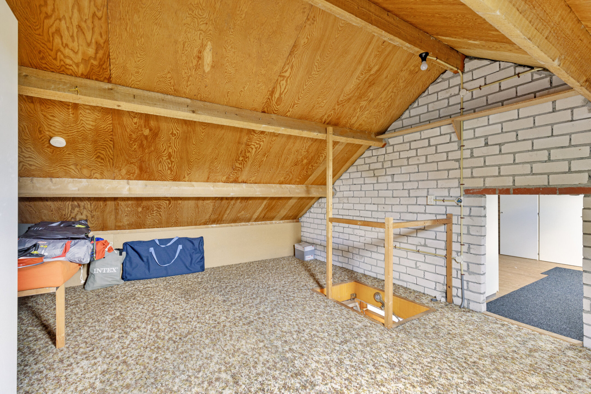 Vlizotrap naar ruime bergzolder waar zich de omvormer van de zonnepanelen bevindt. Het dak is geïsoleerd.