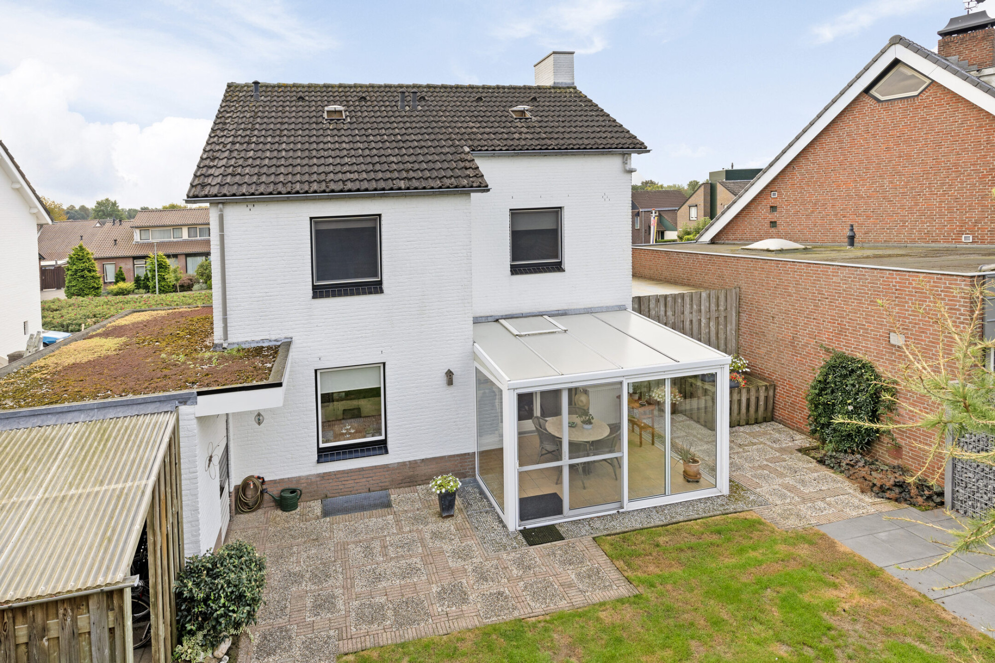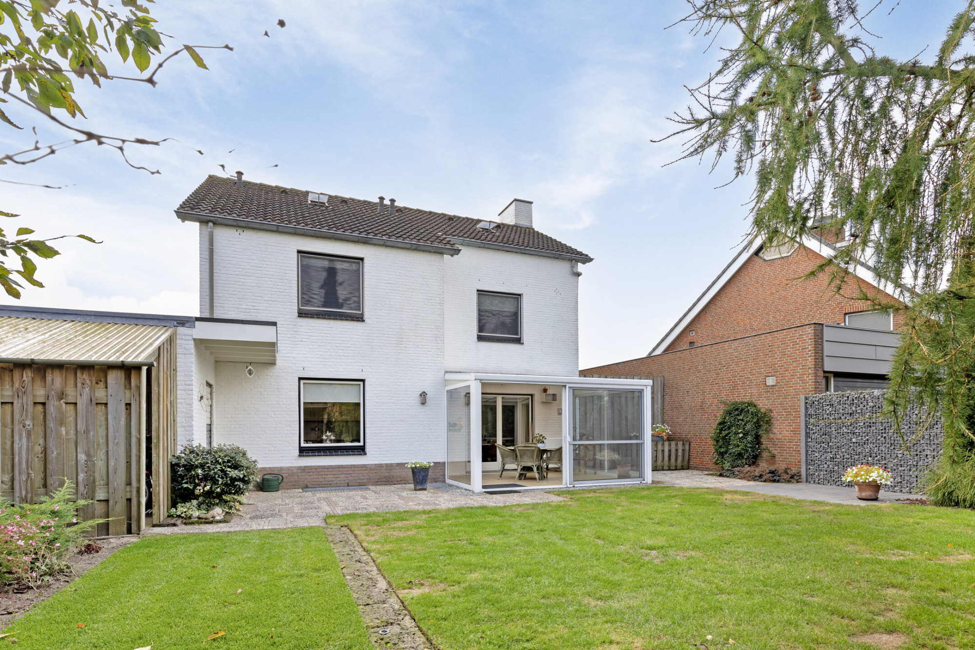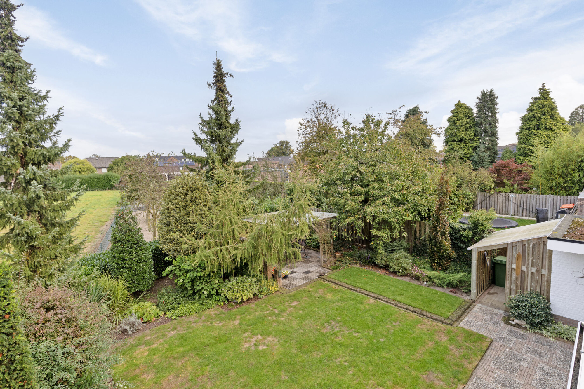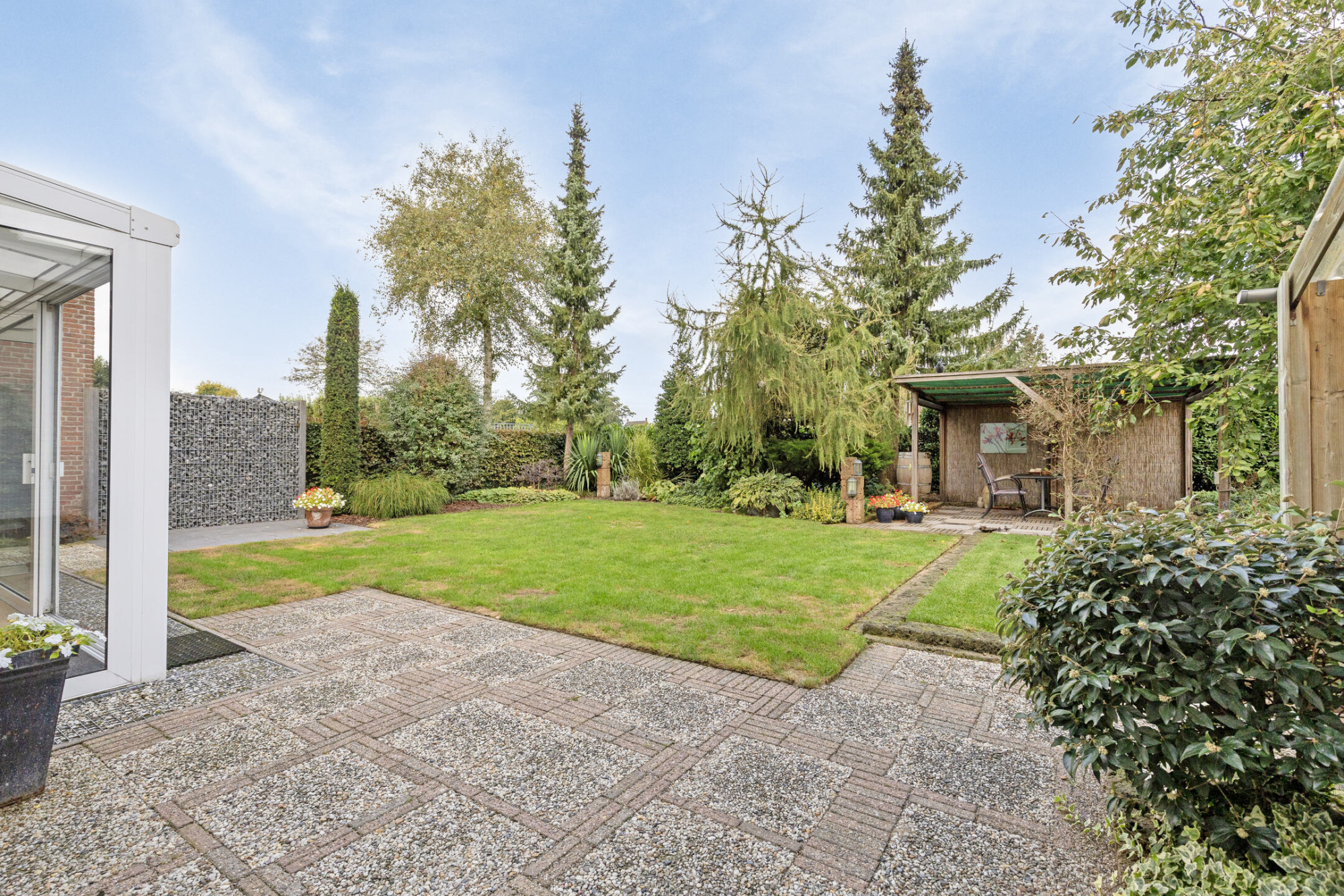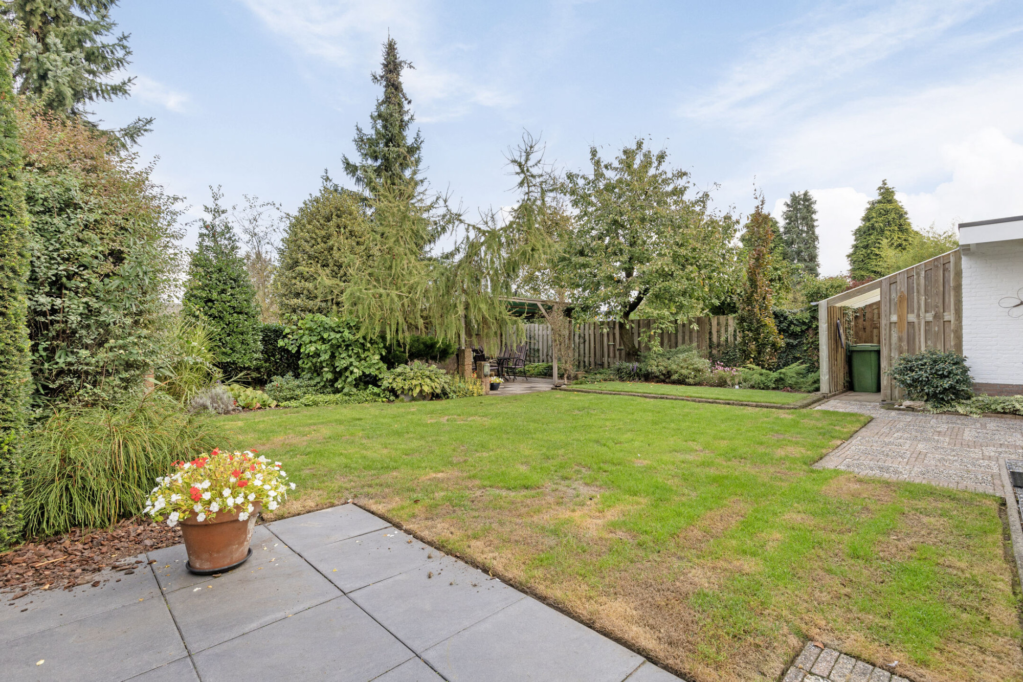 De achtertuin is gelegen op het noordwesten en biedt veel privacy. Er is een overdekt prieel achter in de tuin en rechts naast de woning ligt de fietsenberging en de carport met lange oprit ervoor. Links van de woning is nog de mogelijkheid voor het stallen van een kleine caravan.