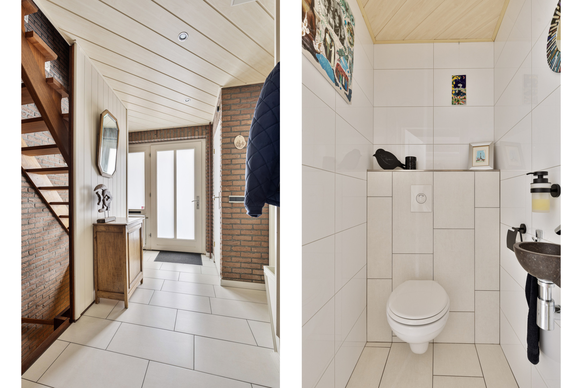 Hal/entree voorzien van een houten trap die leidt naar de bovenverdieping, alsmede de kelder. Daarnaast bevindt zich in de hal de vernieuwde meterkast, toiletruimte met fonteintje en 2 deuren met toegang tot de woonkamer.