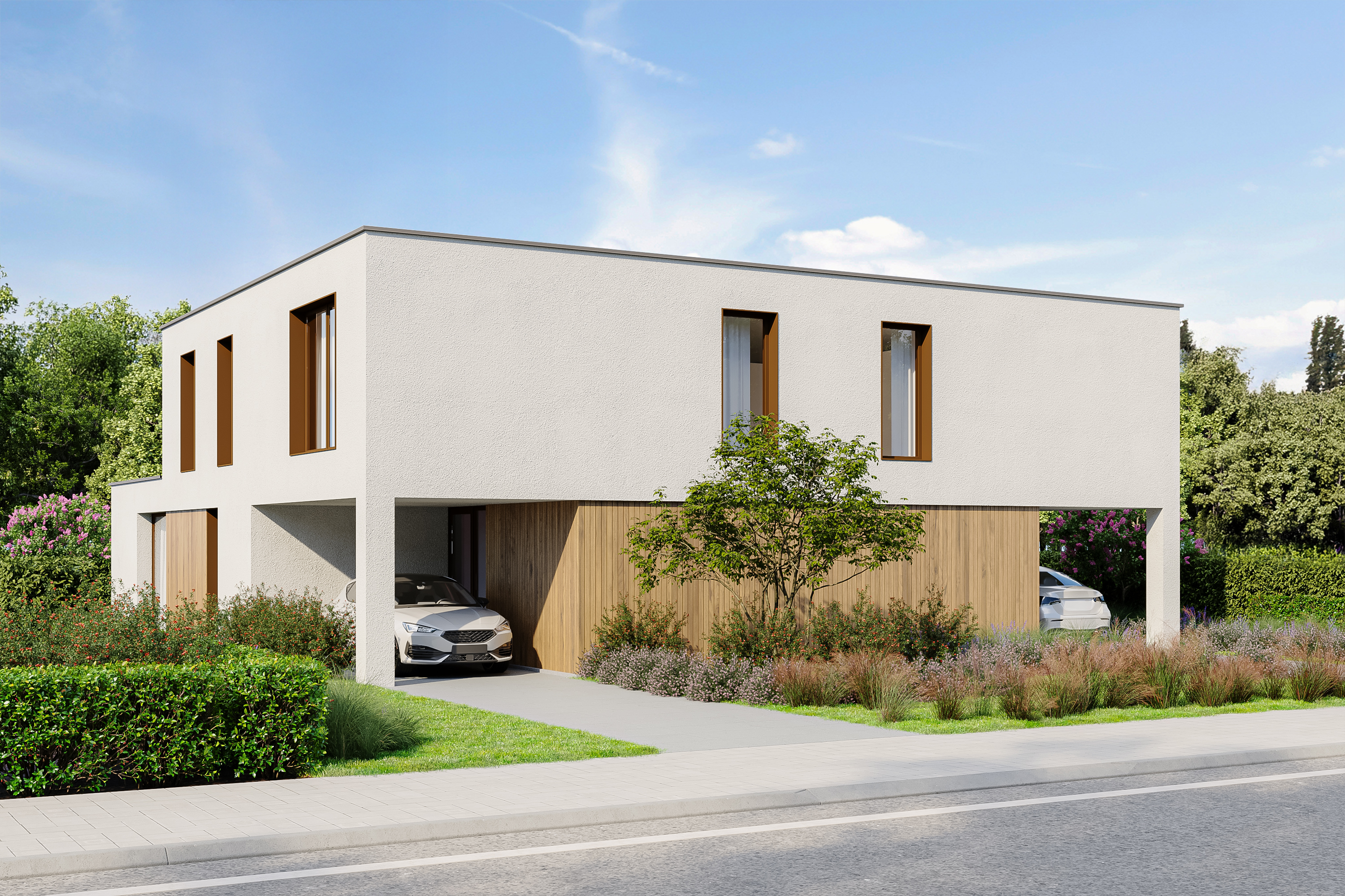 Gelijkvloers: inkomhal met apart toilet, ruime leefruimte met toegang tot terras, praktische berging en carport.