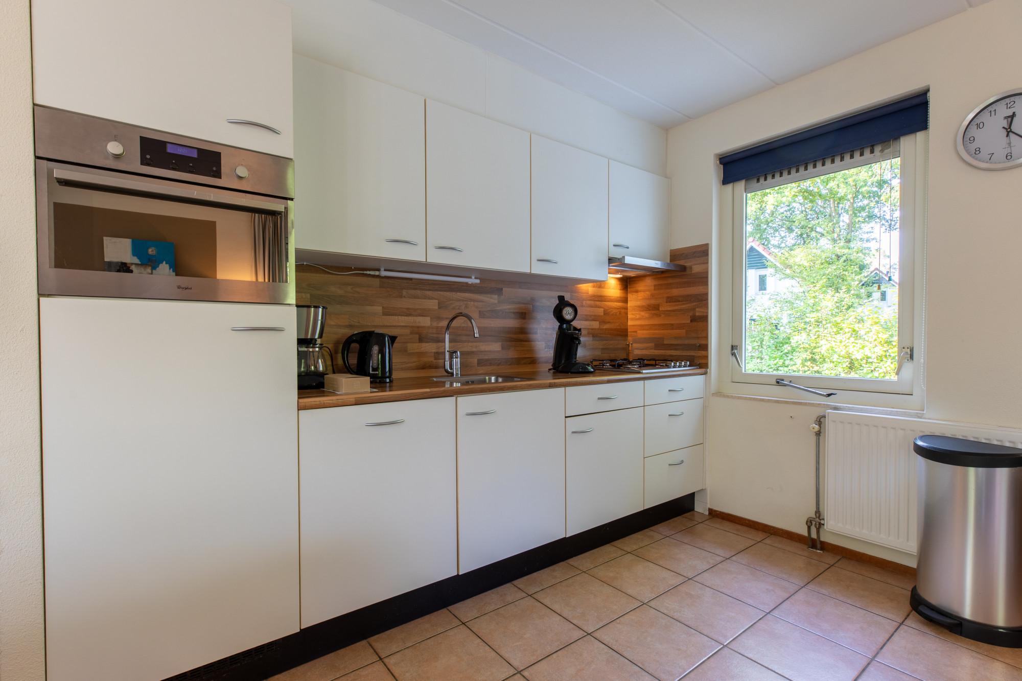 Hal, gastentoilet, slaapkamer en badkamer met ligbad en vaste wastafel. Ruime woonkamer met open haard en zithoek waarvan men uitzicht op de tuin, op het zuidoosten gelegen. Vanuit de woonkamer kan men via de schuifpui direct het terras en de ruime tuin bereiken. De vernieuwde open keuken is voorzien van diverse apparatuur zoals:, gascomfort, afzuigkap, vaatwasser, koelkast en combimagnetron. Tevens bevindt zich bij de voordeur de buitenberging waar tevens de CV installatie is ondergebracht.