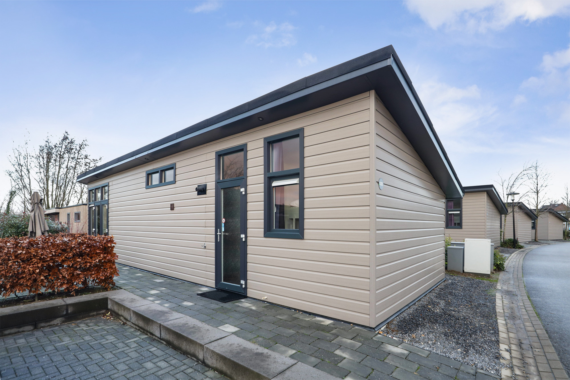 Deze recreatiewoning nr.533 is gemakkelijk te bereiken en is voorzien van een eigen parkeerplaats voor de deur. De recreatiewoning beschikt over 3 slaapkamers en is geschikt voor maar liefst 6 personen. Vanaf het ruime terras dat aan de zijkant ligt kom je direct in de ruime woonkamer met grote raampartijen hier vindt men het gezellige zit- en eetgedeelte. Bij de woonkamer ligt de moderne openkeuken met diverse apparatuur: o.a. gascomfort, koelkast met vriesvak, vaatwasser en combimagnetron met hete lucht ovenfunctie.