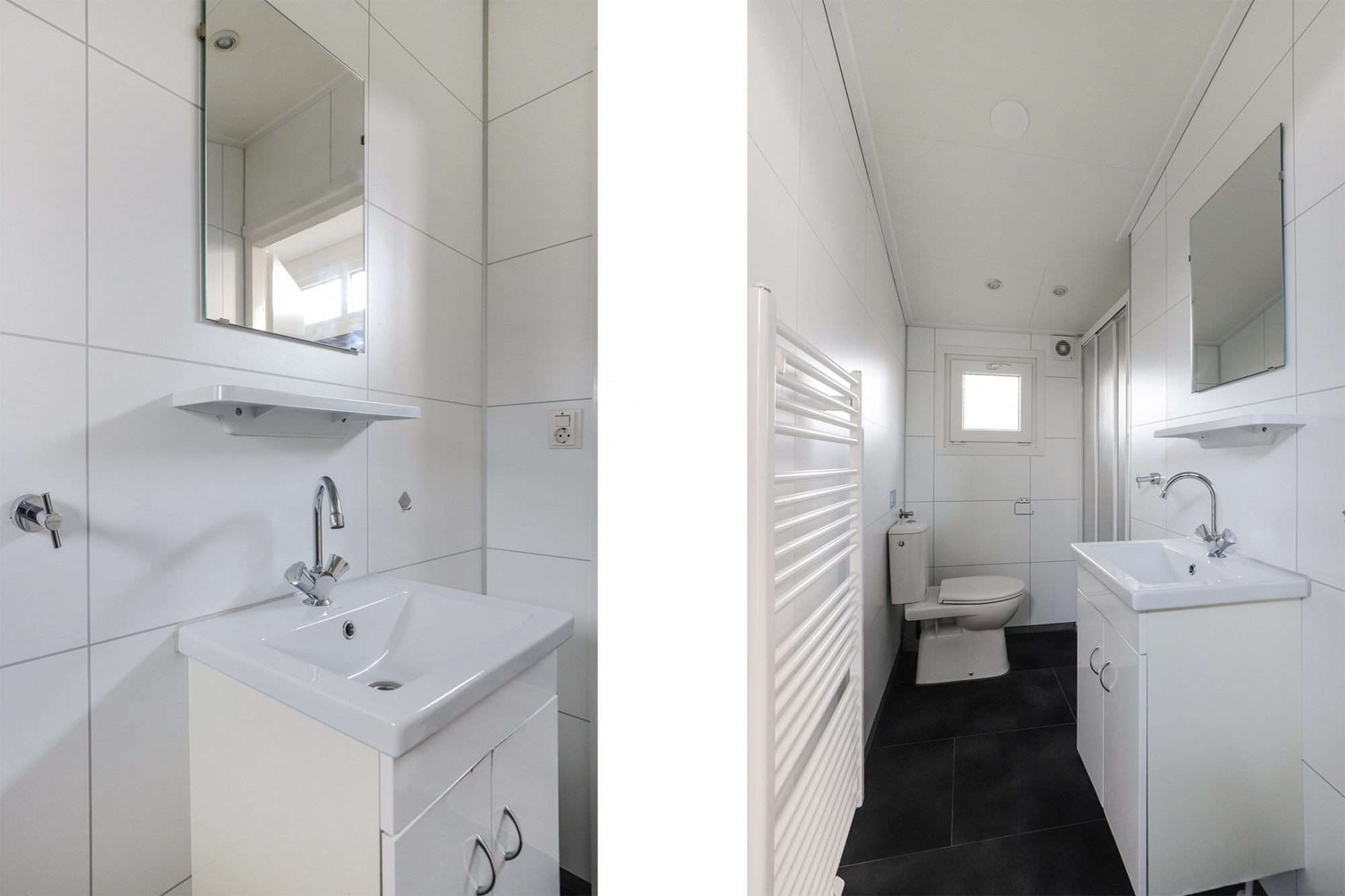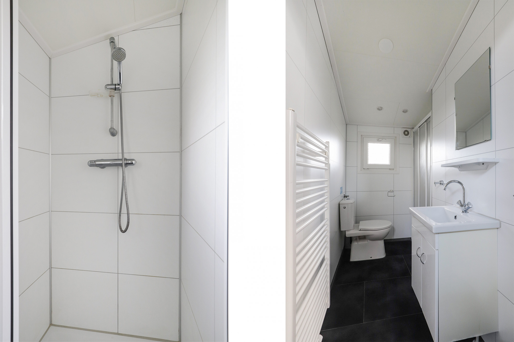 Tussen twee slaapkamers is de moderne badkamer voorzien van een glazen inloopdouche, een toilet, een badkamermeubel voorzien van wastafel en een designradiator.
