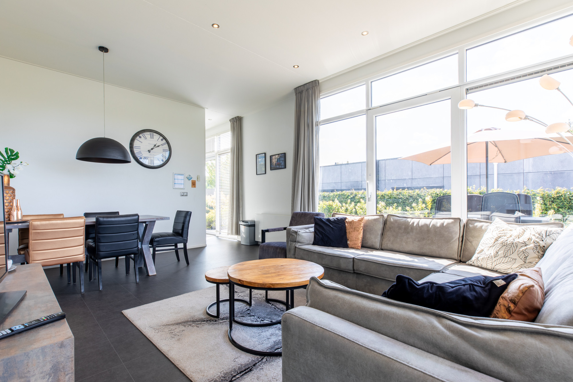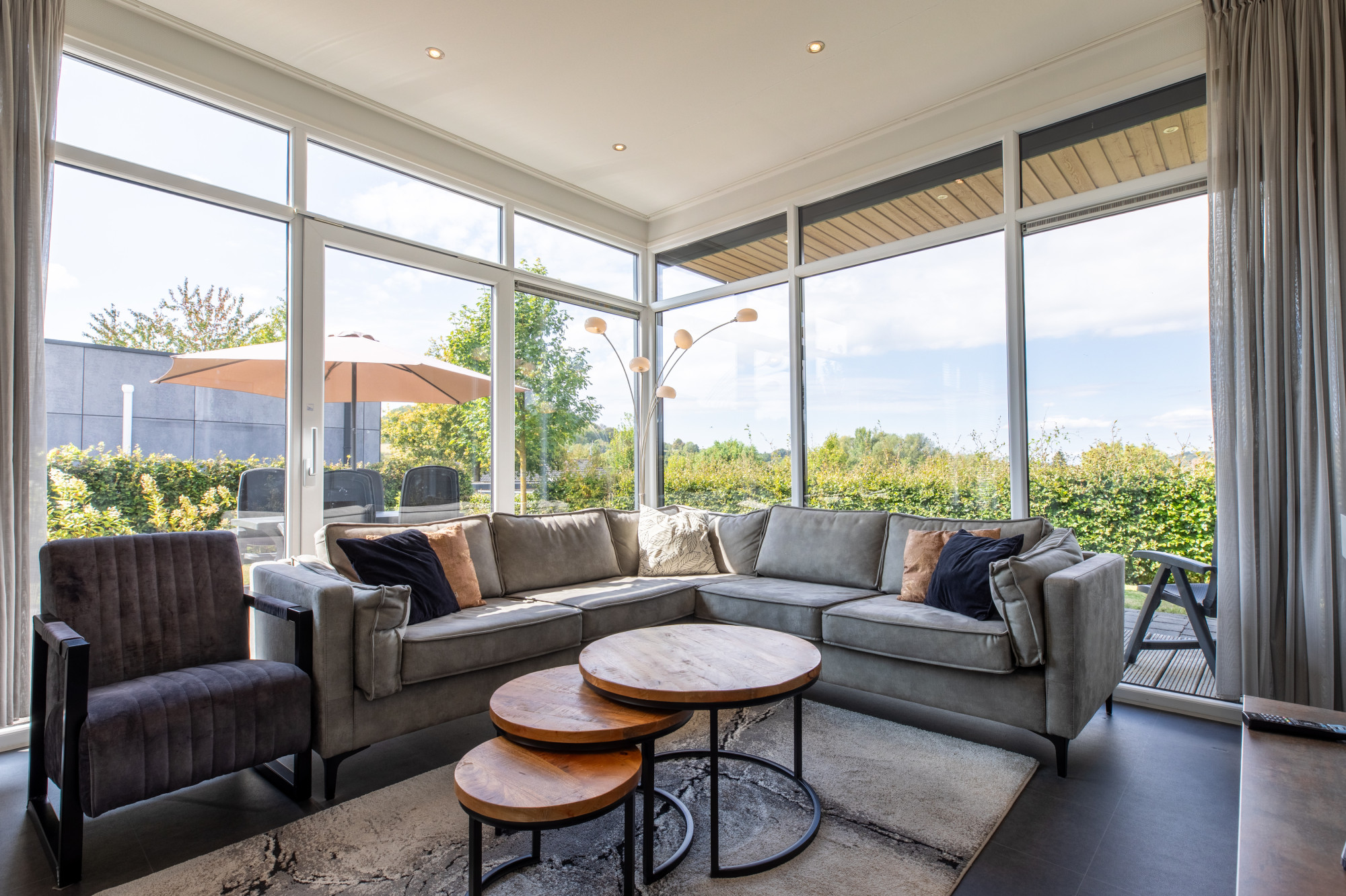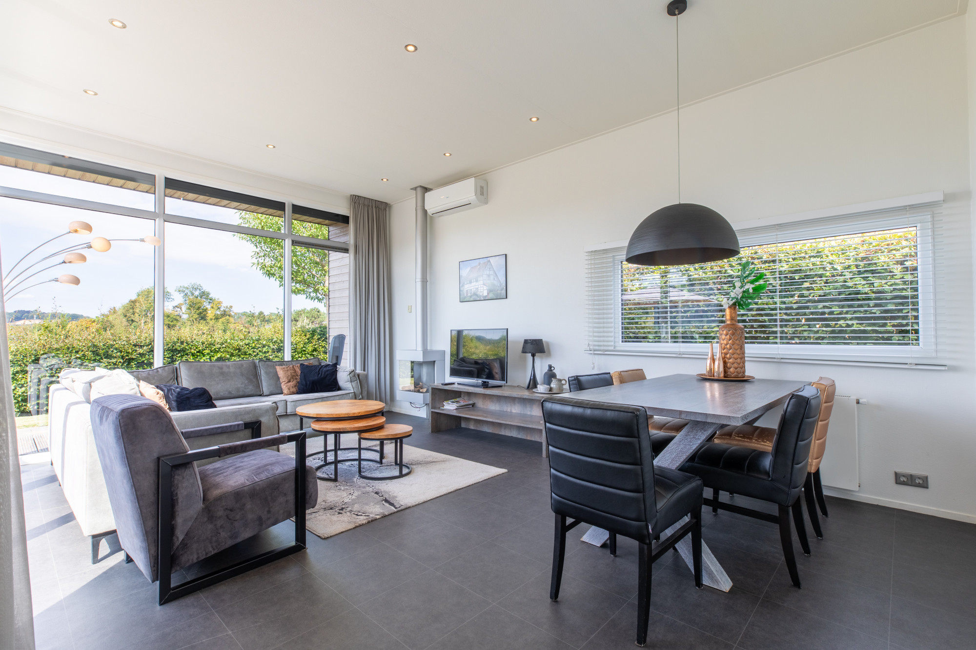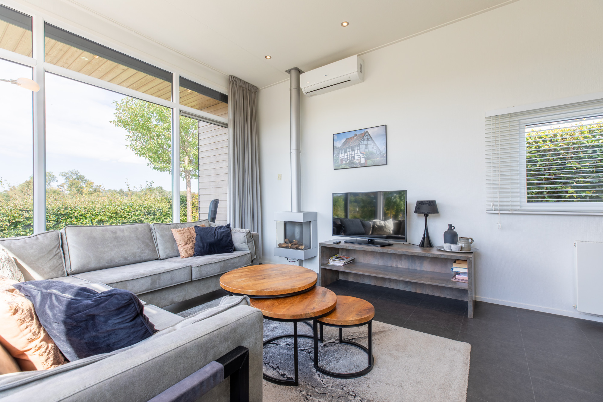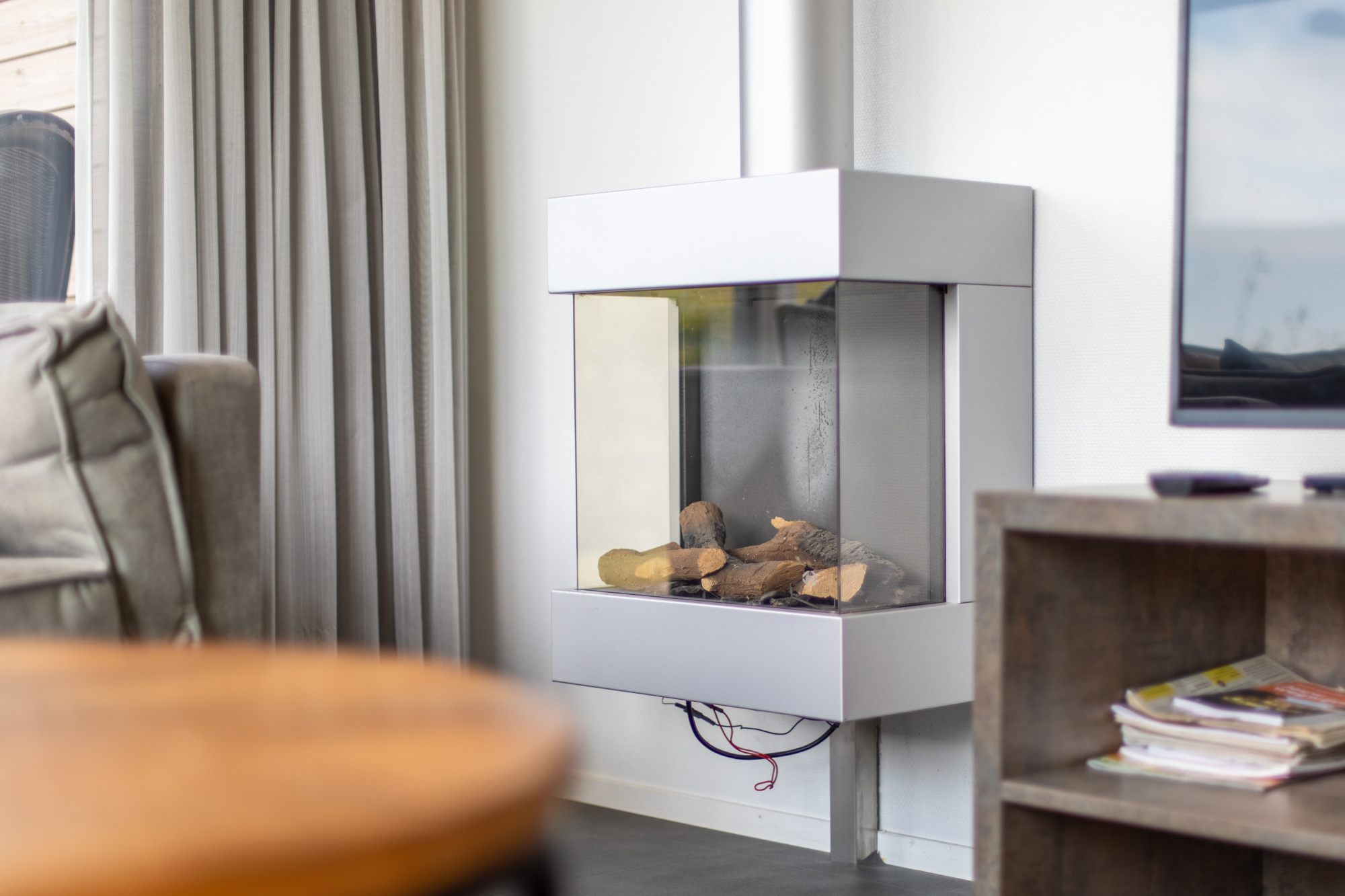 Deze recreatiewoning heeft luxe afwerking en in de woonkamer nog een gashaard, airconditioning en screens.