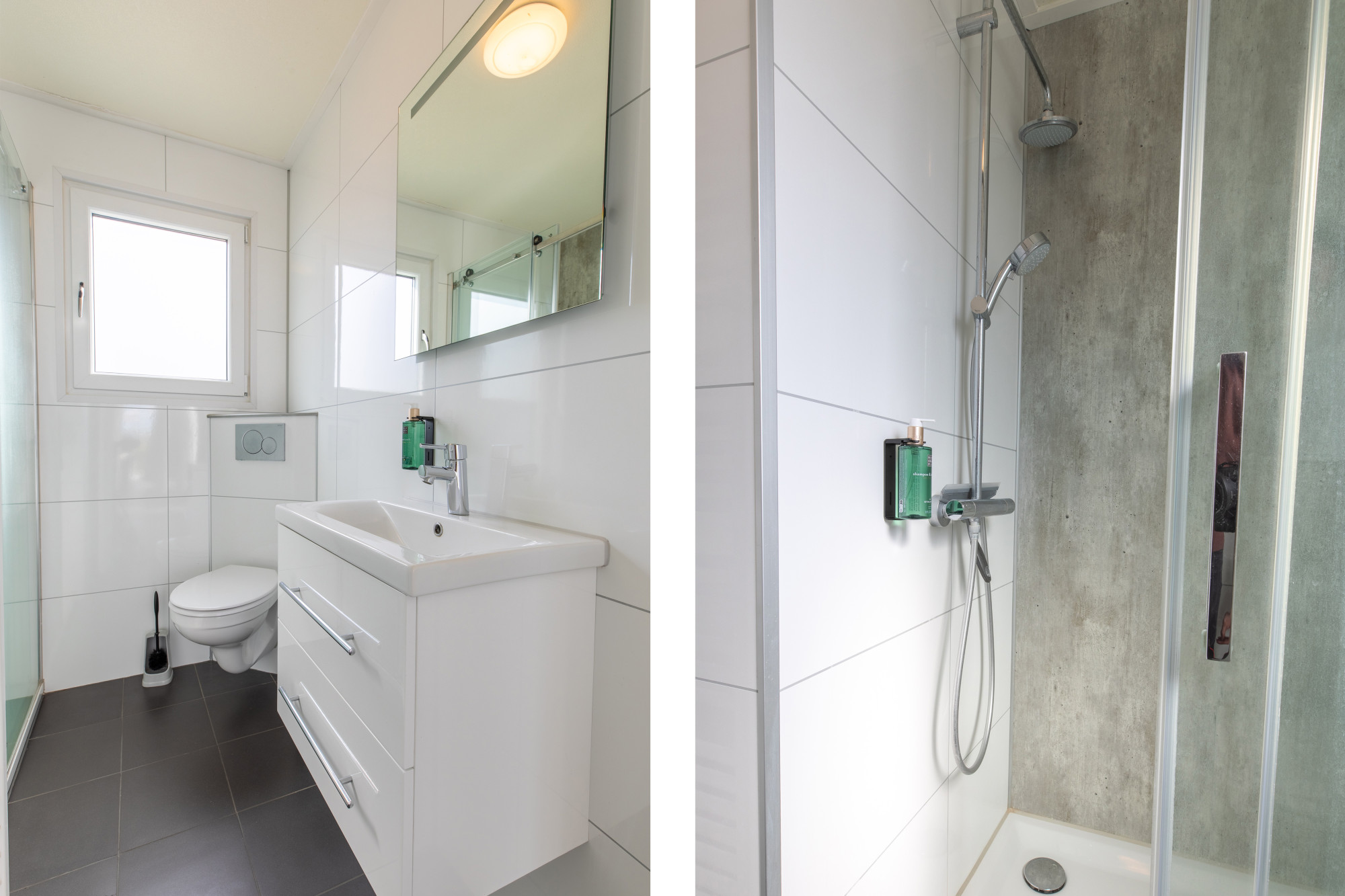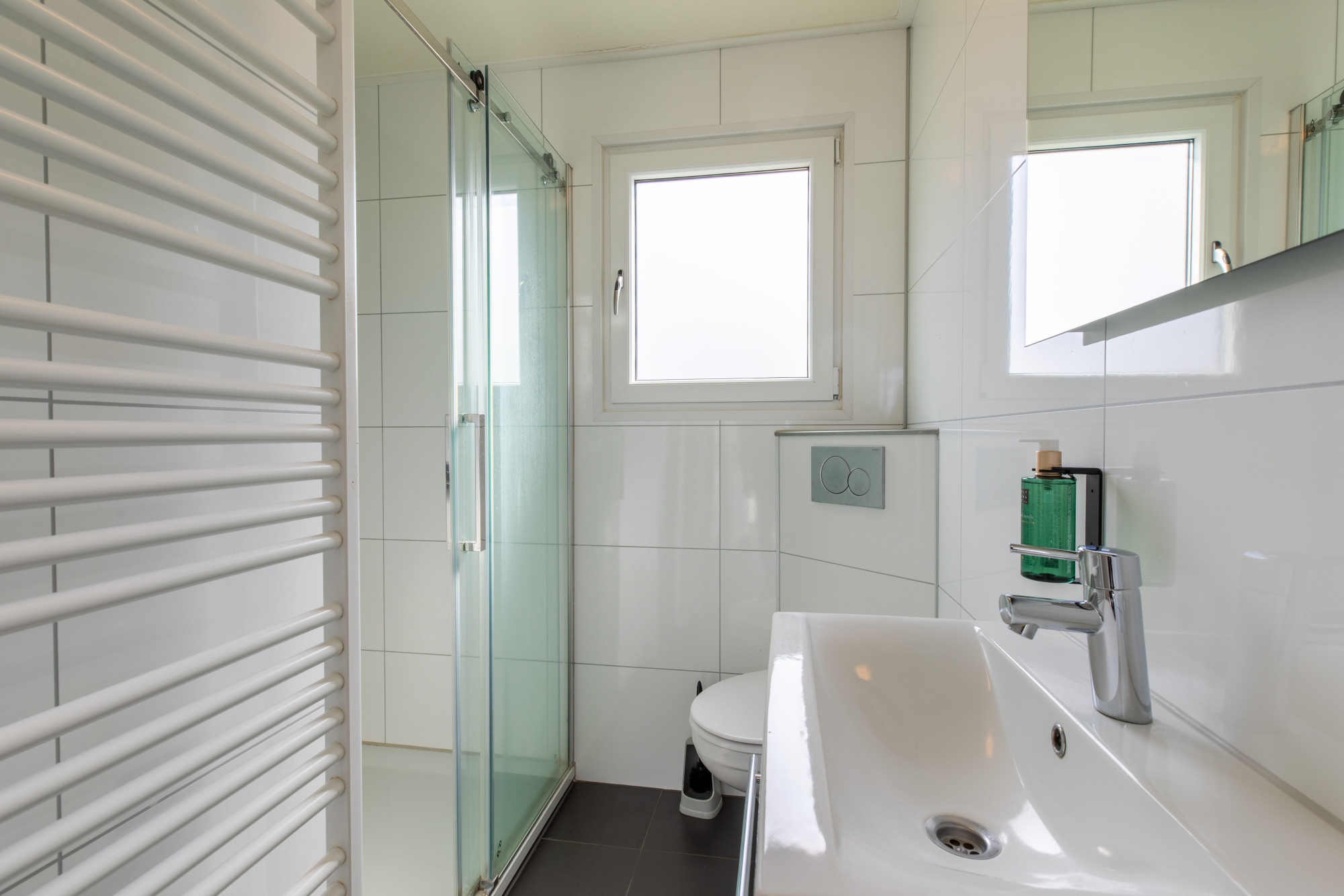 Tussen de twee slaapkamers is de moderne badkamer voorzien van een glazen inloopdouche, een toilet, een badkamermeubel voorzien van wastafel en een designradiator..