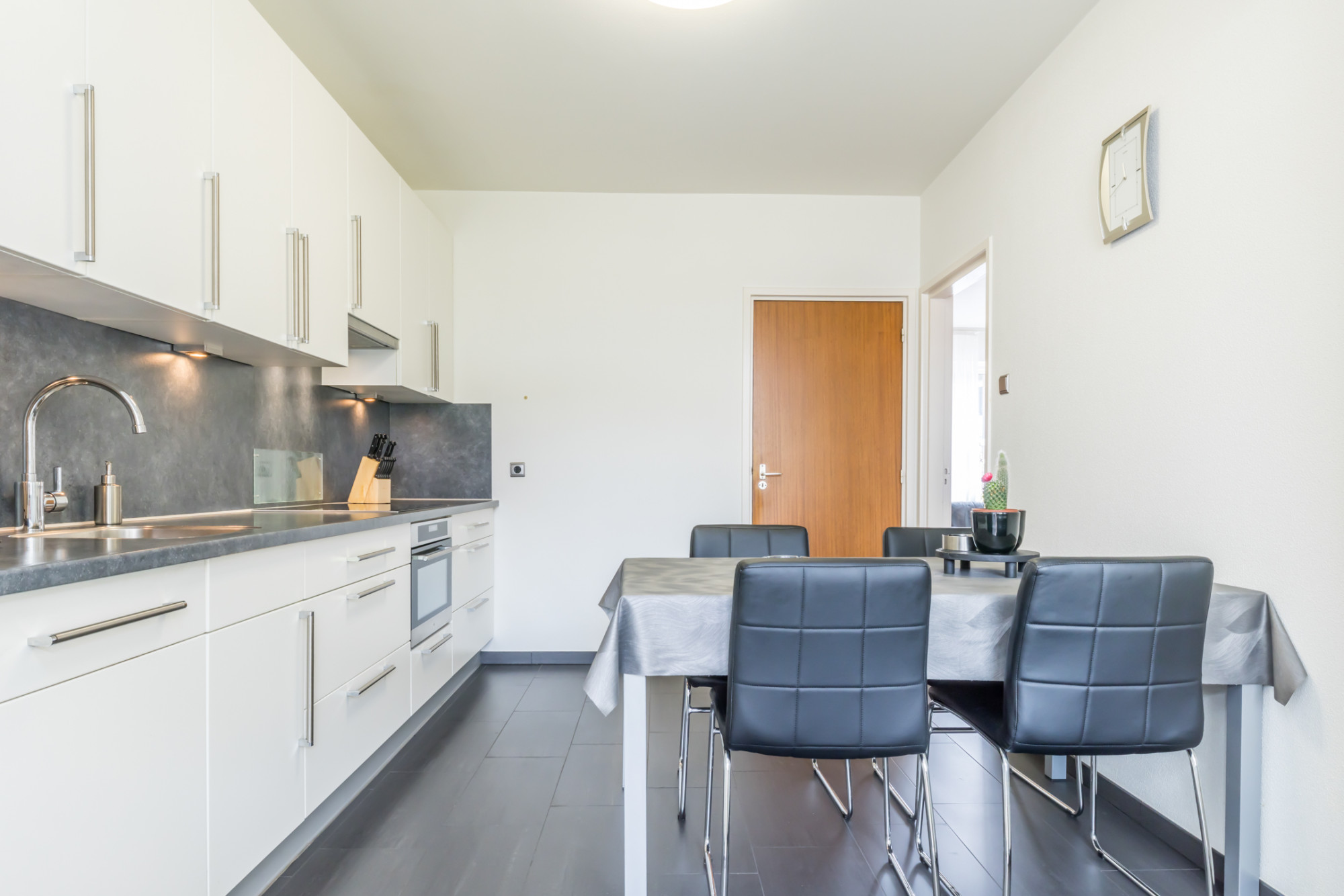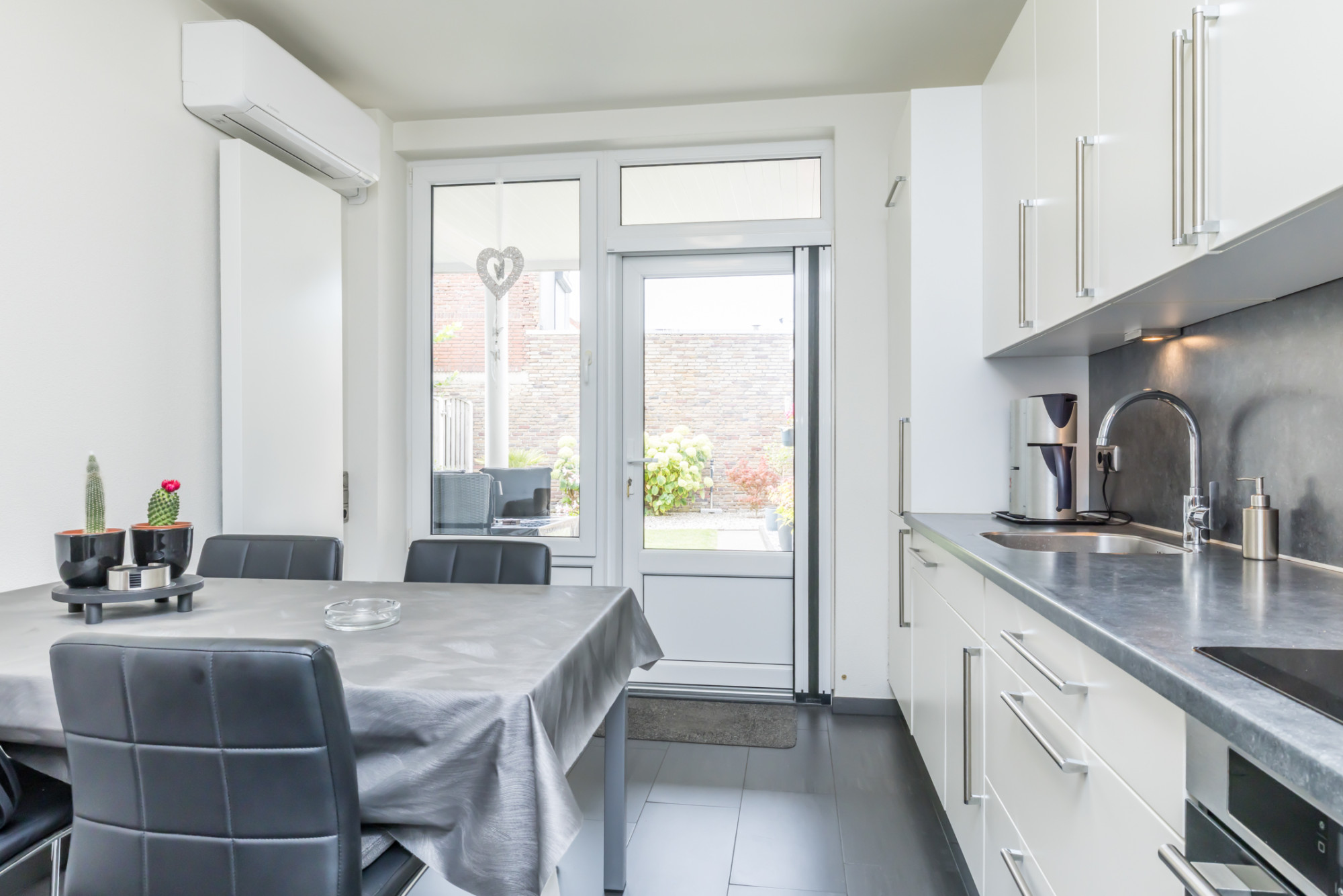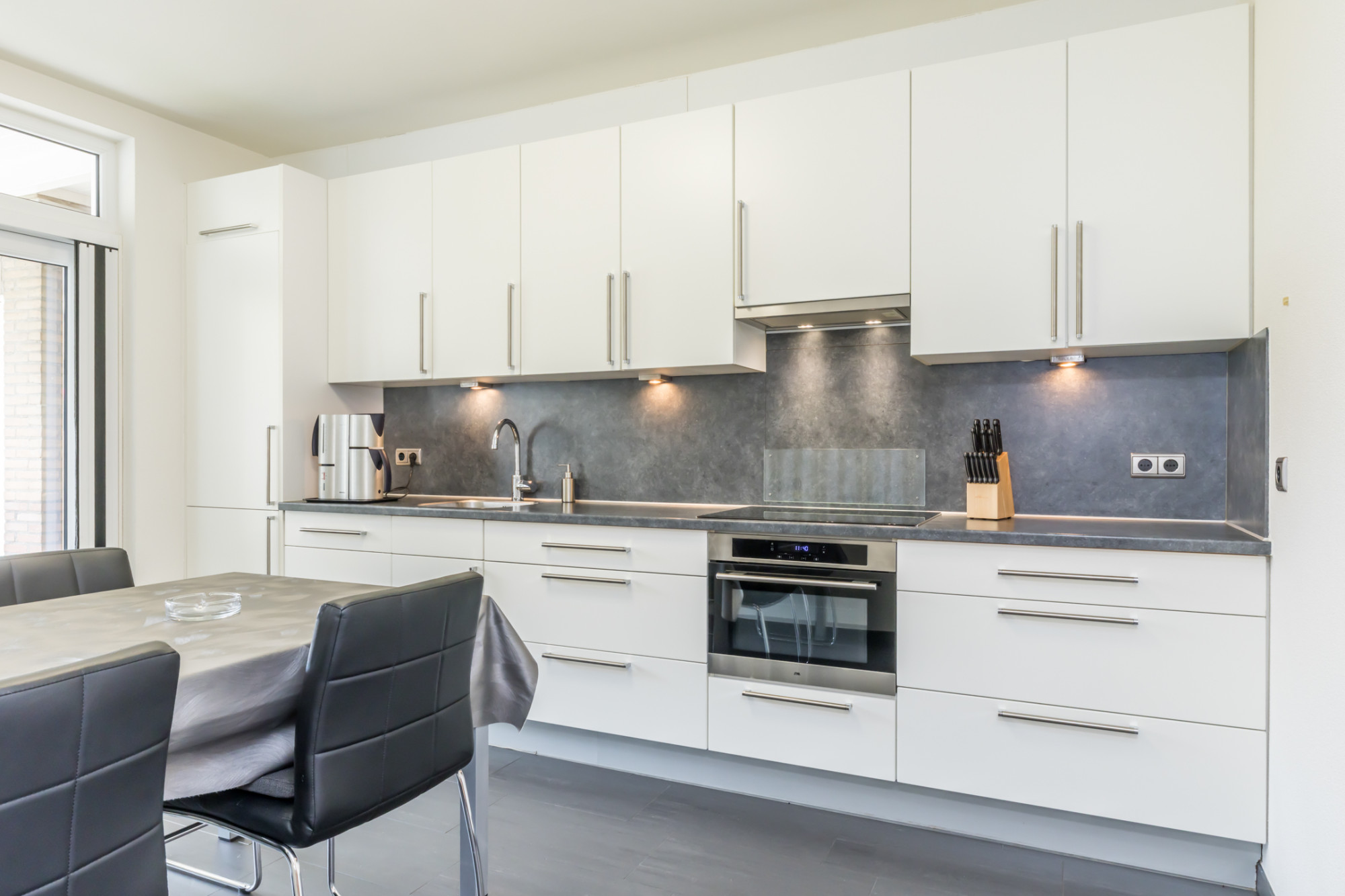 Een keukenruimte voorzien van airco en een eigentijdse inbouwkeuken, uitgevoerd in wit met RVS-grepen en voorzien van apparatuur, te weten: 4 zones inductie kookplaat / afzuigkap / wasbak / combimagnetron / koelkast en vaatwasmachine. Loopdeur met rol-hor naar het overdekte terras en de achtertuin.