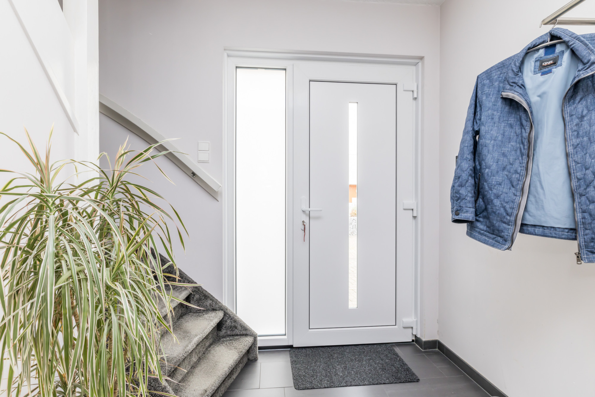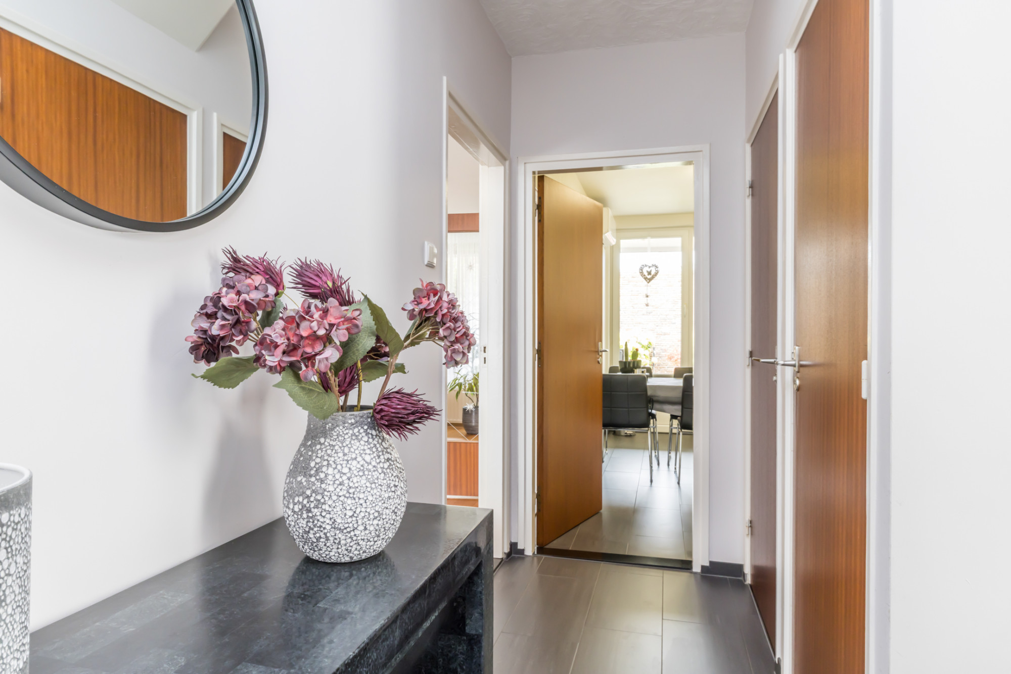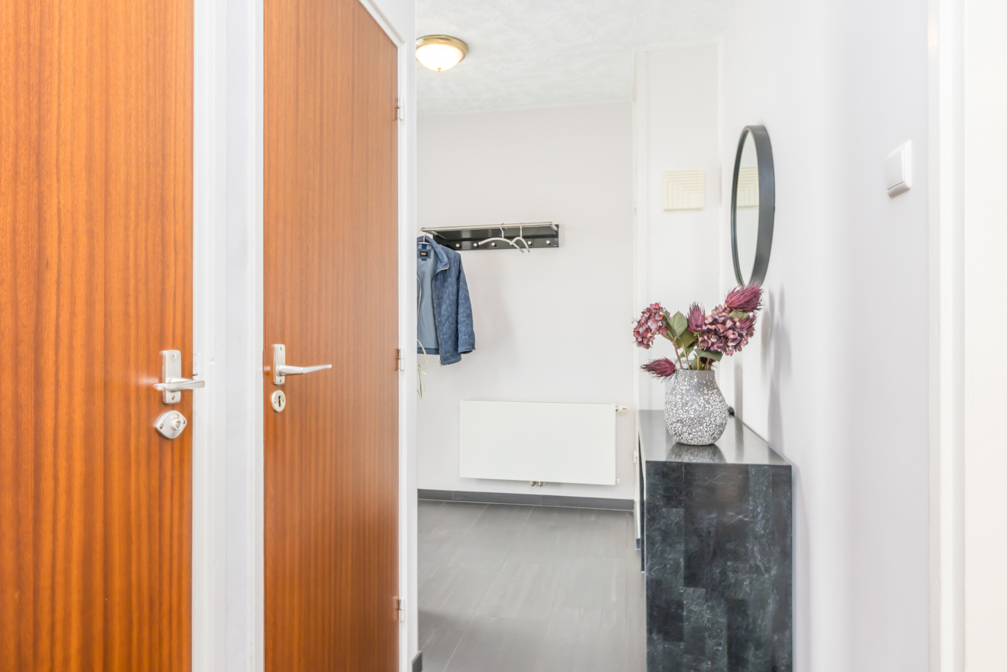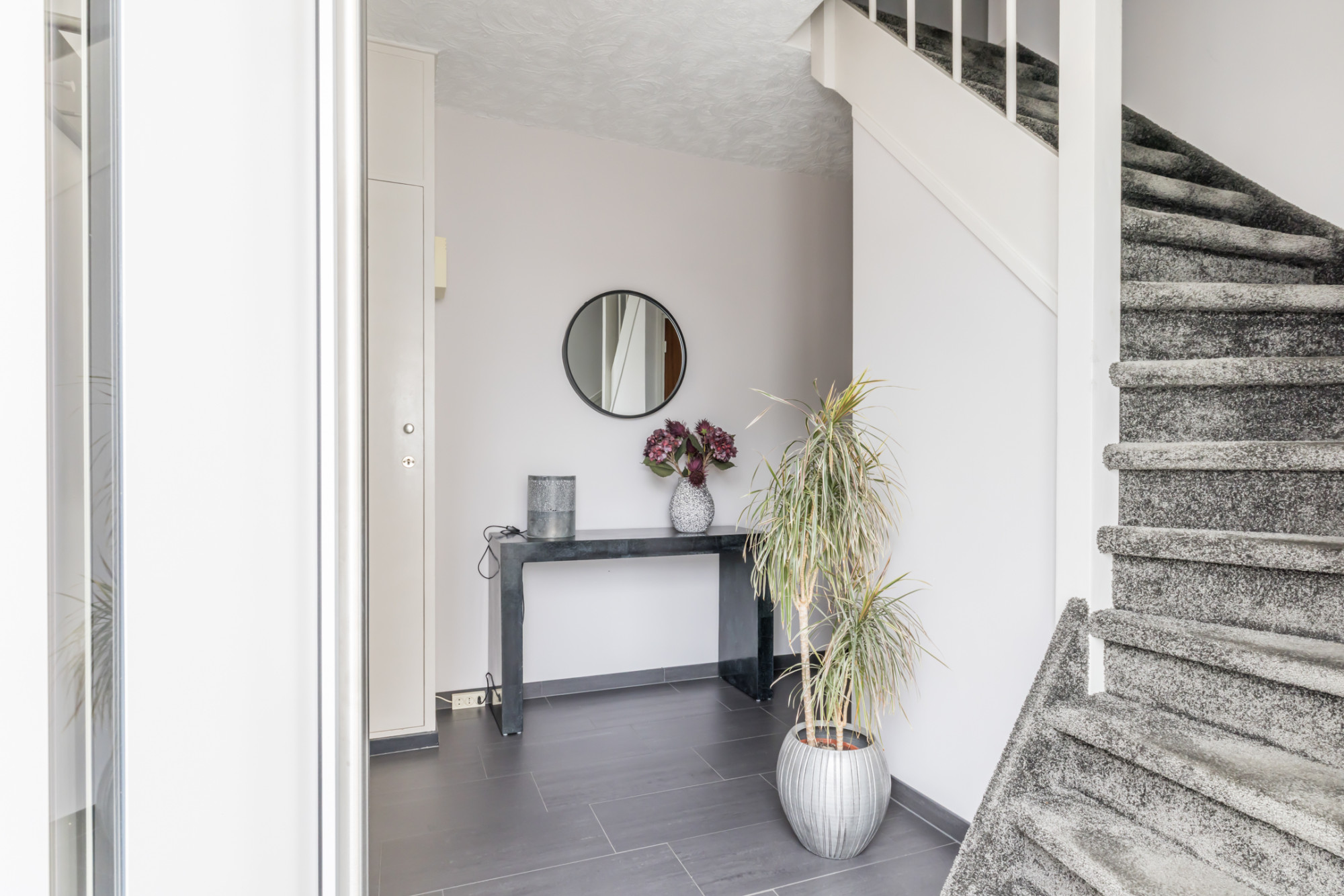 Hal / Entree, garderobehoek en trappenhuis naar de verdieping. Meterkast voorzien van 8 groepsinstallatie / kookgroep / aparte groep voor de zonnepanelen / 2x aardlekschakelaar / digitale meters met dag- en nachtstroomaansluiting. Modern geheel betegeld gastentoilet met zwevend wandcloset en fonteintje. Trapkast voor provisie en opslag. Loopdeur naar de woonkamer en keuken.