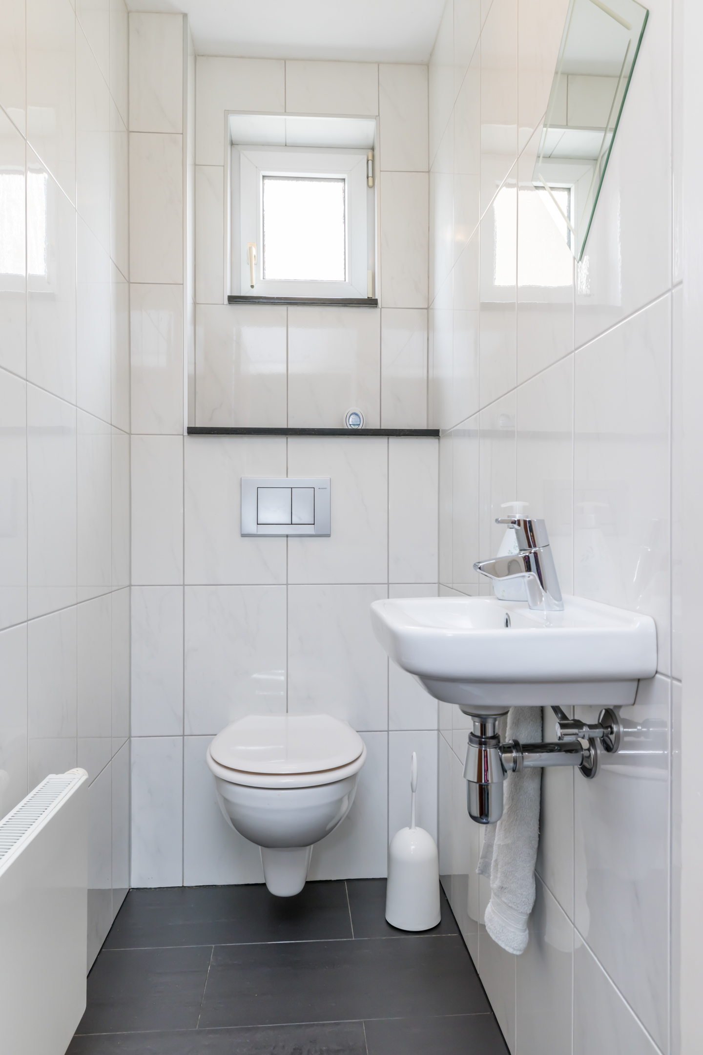 Het moderne gastentoilet met zwevend wandcloset en fonteintje, evenals de praktische trapkast, zorgen voor extra comfort en gebruiksgemak.