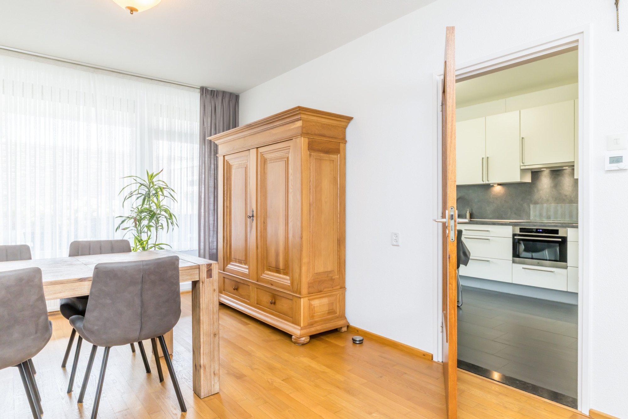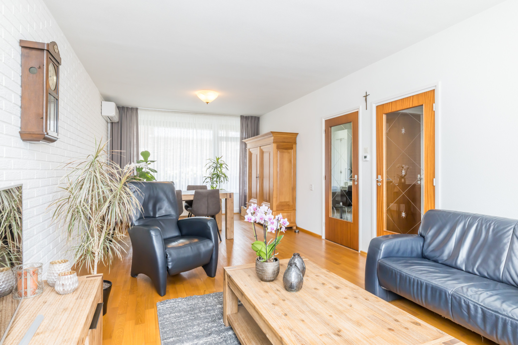 Ruime lichte woonkamer met aan de voorzijde de zithoek voorzien van audio-/visuele aansluitingen en achtergelegen eetkamer met airconditioningsinstallatie en grote raampartij. Deze is afgewerkt met een parketvloer. Doorgang naar de gesloten keuken