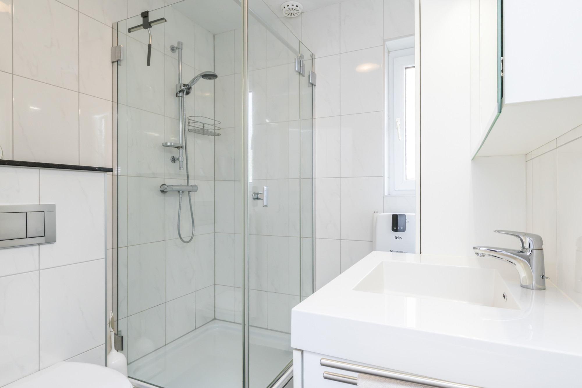 * STRAKKE BADKAMER MET INLOOPDOUCHE/ VASTE WASTAFEL IN EEN MEUBEL EN TWEEDE TOILET
