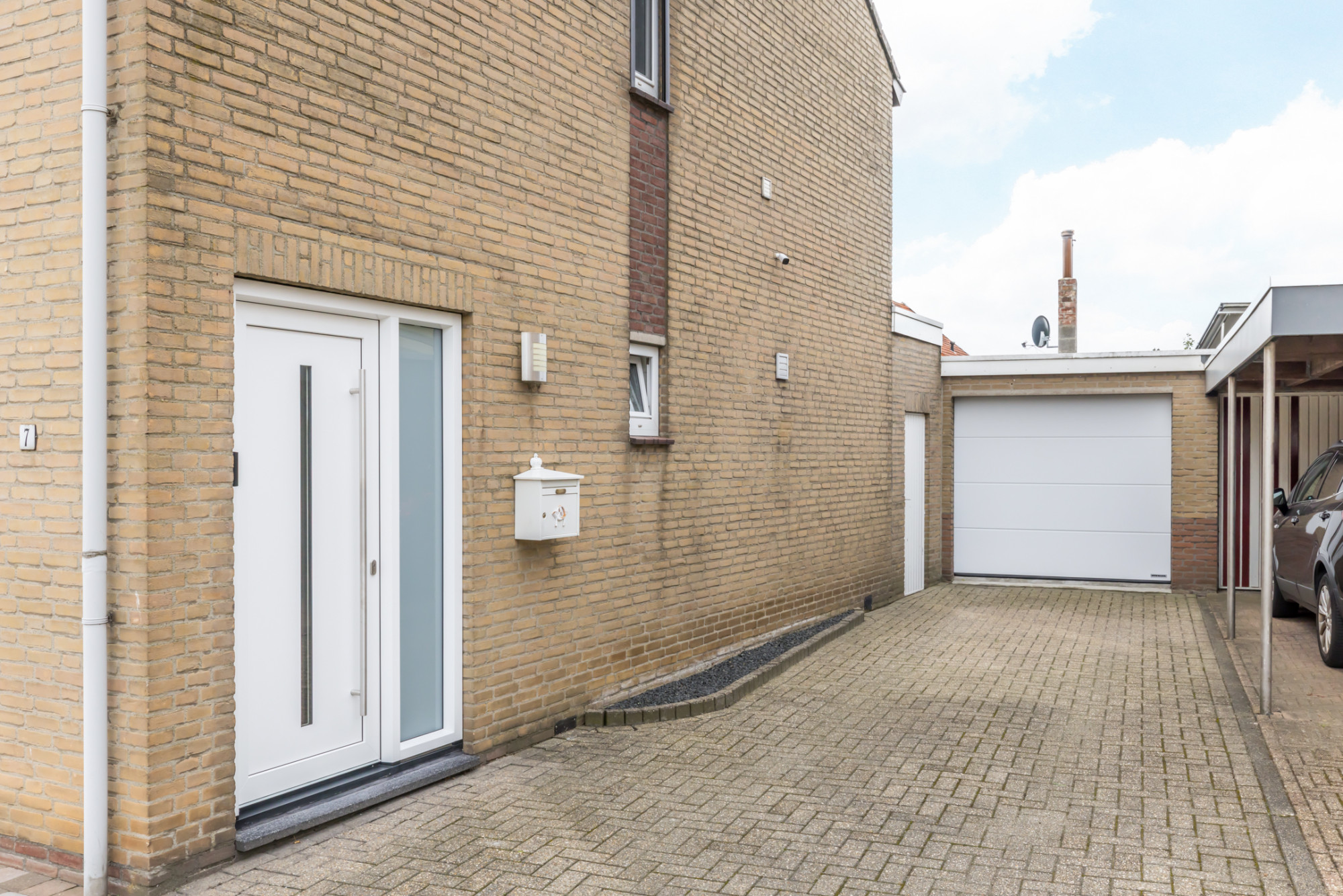 Naastgelegen vrijstaande stenen garage voorzien van een elektrisch bedienbare sectionaal poort met opslagmogelijkheden en oprit met parkeergelegenheid voor meerdere voertuigen op eigen terrein.