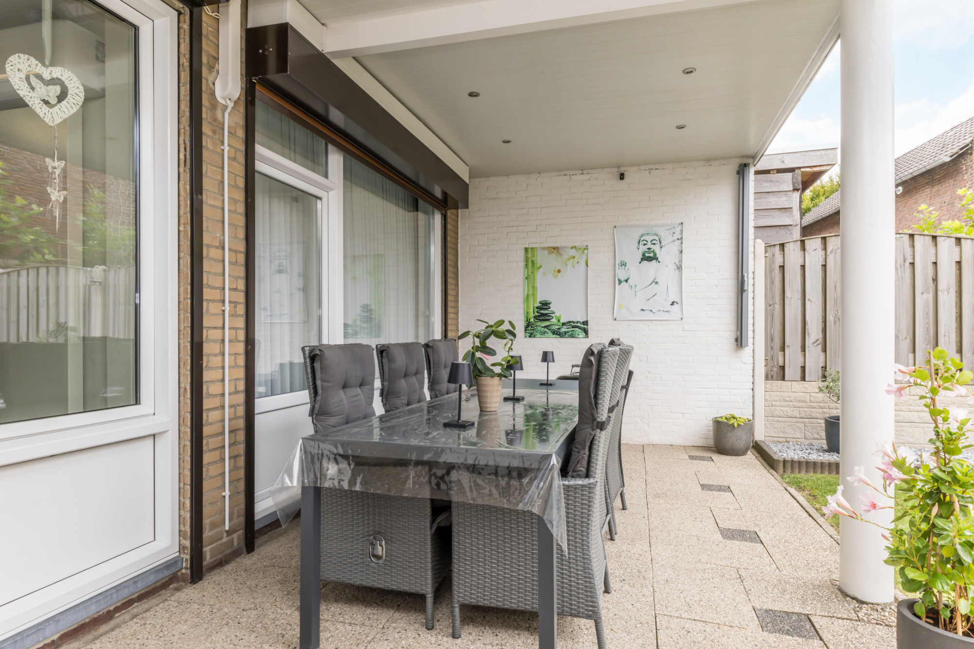 Geheel omsloten onderhoudsvriendelijke achtertuin voorzien van een beklinkerd overdekt terras, gazon, borders met aanplanting, zijingang, toegang tot de garage en veel privacy.