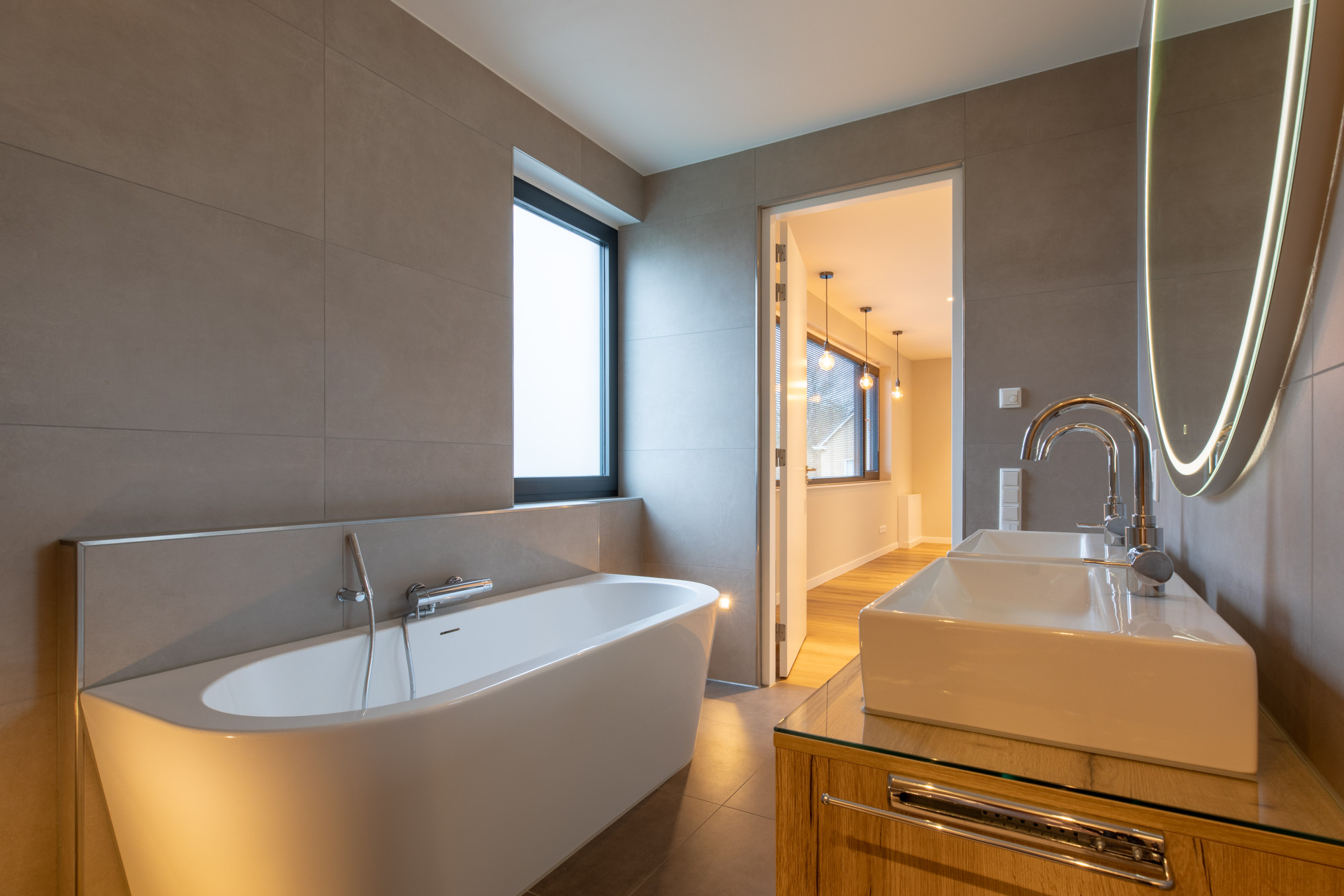 Ruime en luxe afgewerkte badkamer 1 (3.95 x 2.24 m) geheel betegeld met vrijstaand ligbad, riante inloopdouche, dubbele vaste wastafel in badmeubel met zeer grote ronde spiegel en design radiator.