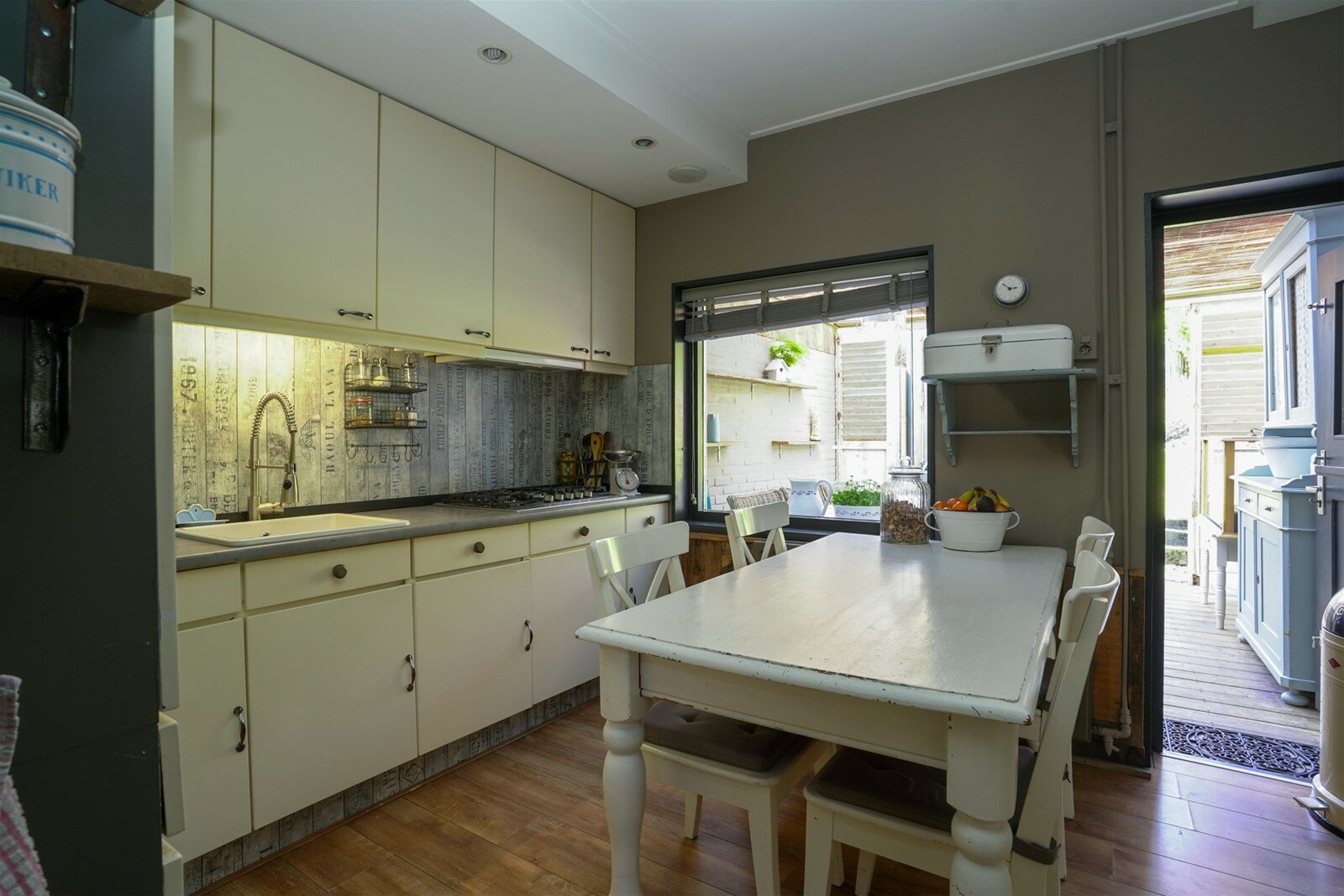 Keuken(10,2m2) voorzien van een inbouwkeuken met koelkast, combi magnetron, gasfornuis en afzuigkap. Toegang naar de tuin. Royale doorzon woonkamer(32m2). Entree, keuken en woonkamer zijn voorzien van een laminaatvloer. Vanuit de woonkamer biedt een portaal toegang naar de inpandige garage, bijkeuken en toilet. Bijkeuken(6,4m2) met wasmachine aansluiting, wasbak, CV (2010, eigendom, Bosch) en toegang naar de achtertuin.