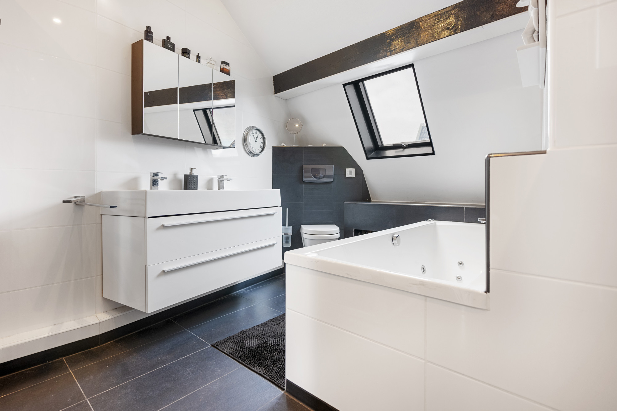 • Tweede verdieping: Twee ruime slaapkamers en een badkamer met whirlpool, inloopdouche en dubbele wastafel –