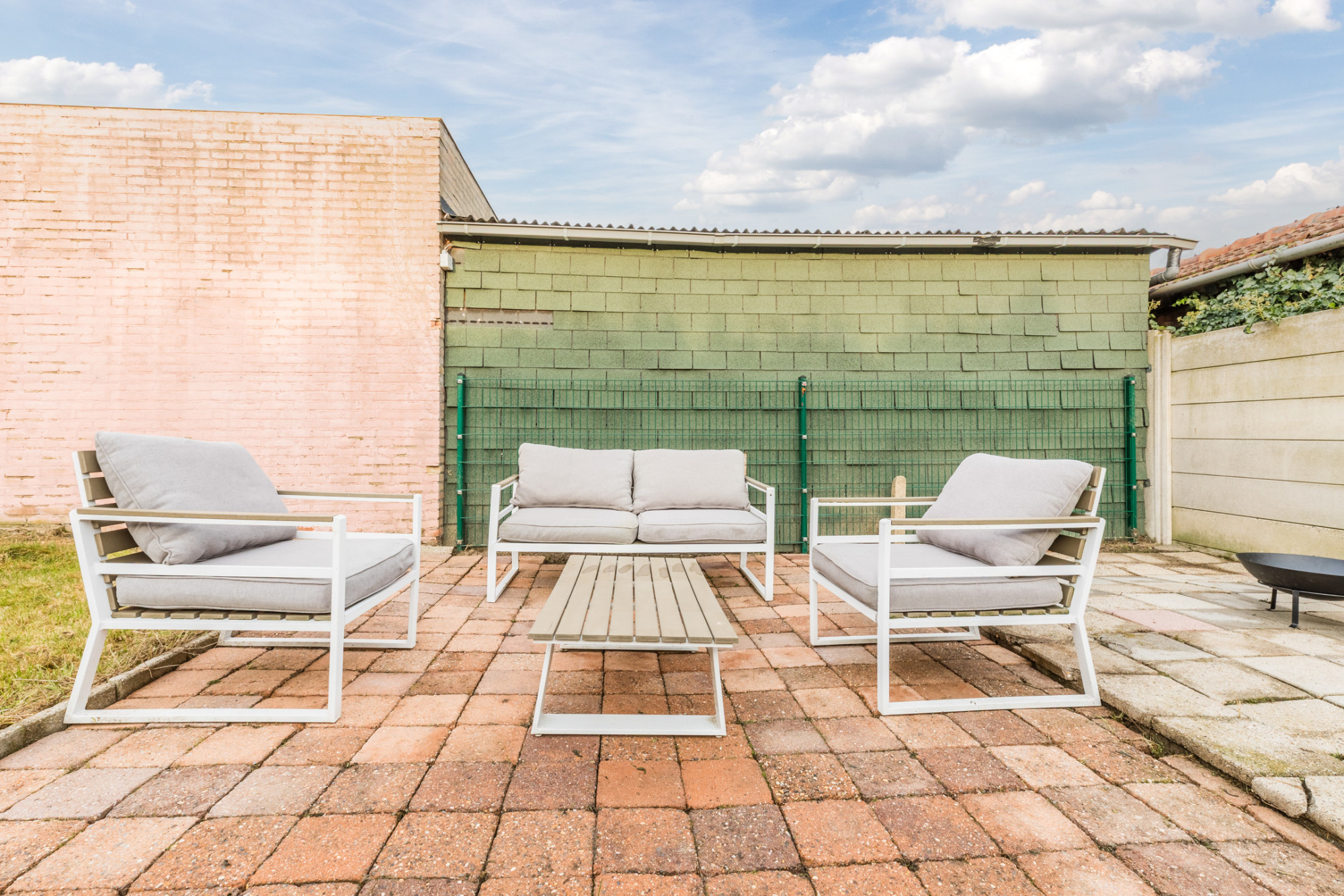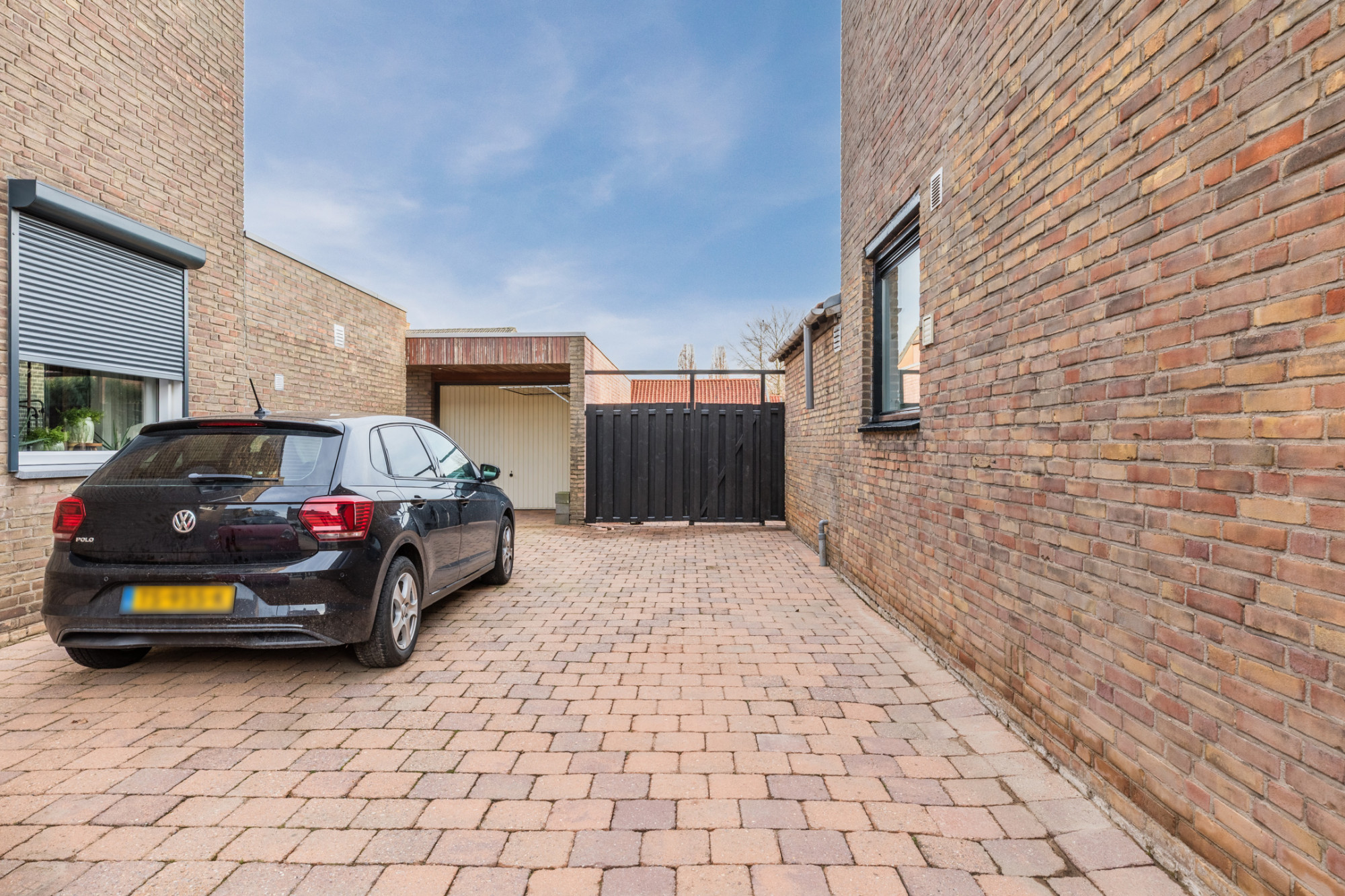 Eenvoudige, onderhoudsarme achterzijde met overkapping en berging, bereikbaar via achterom