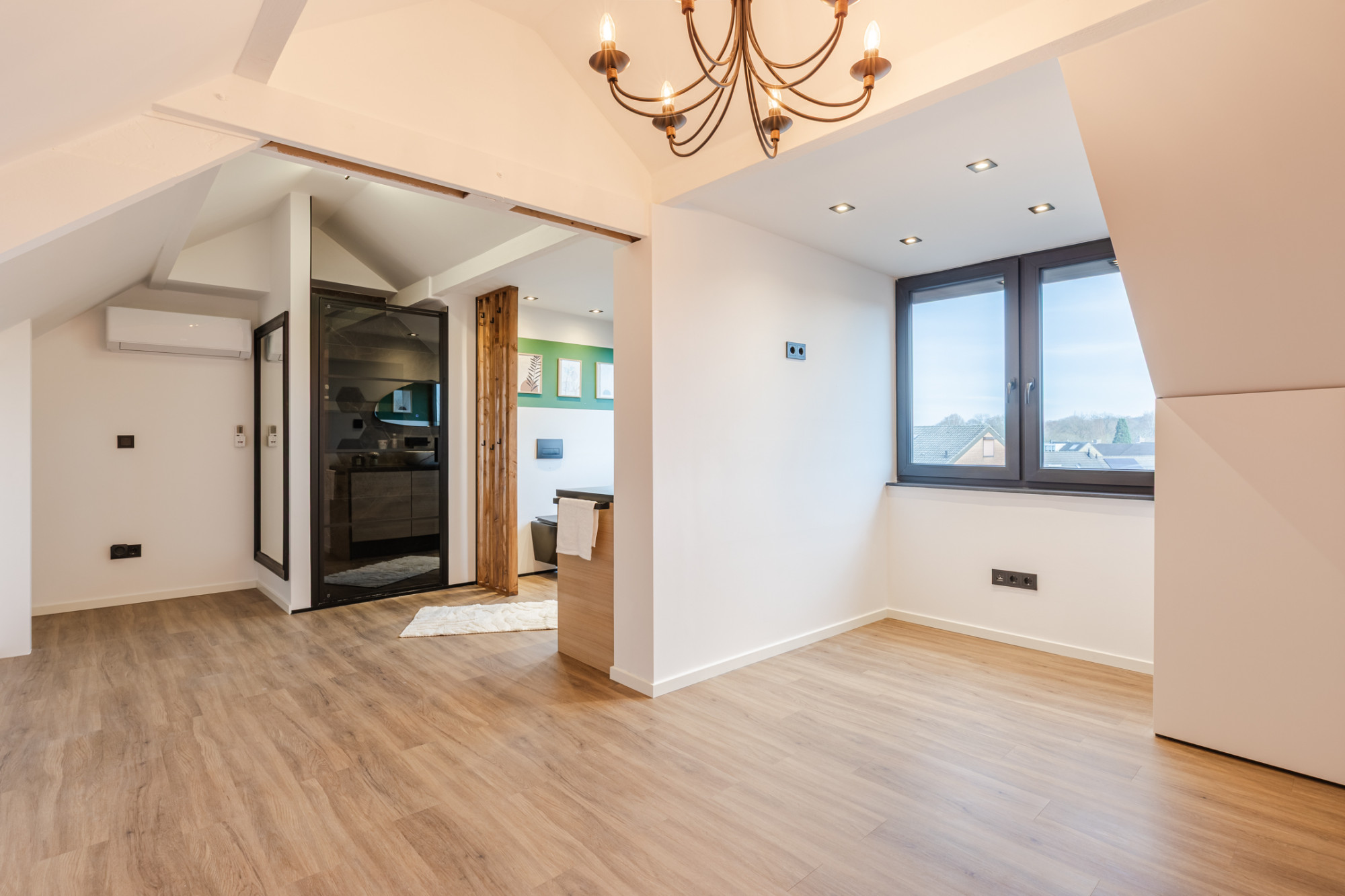 een compleet nieuwe woonzolder met luxe badkamer, grote dakkapel, vloerverwarming en strak stucwerk,