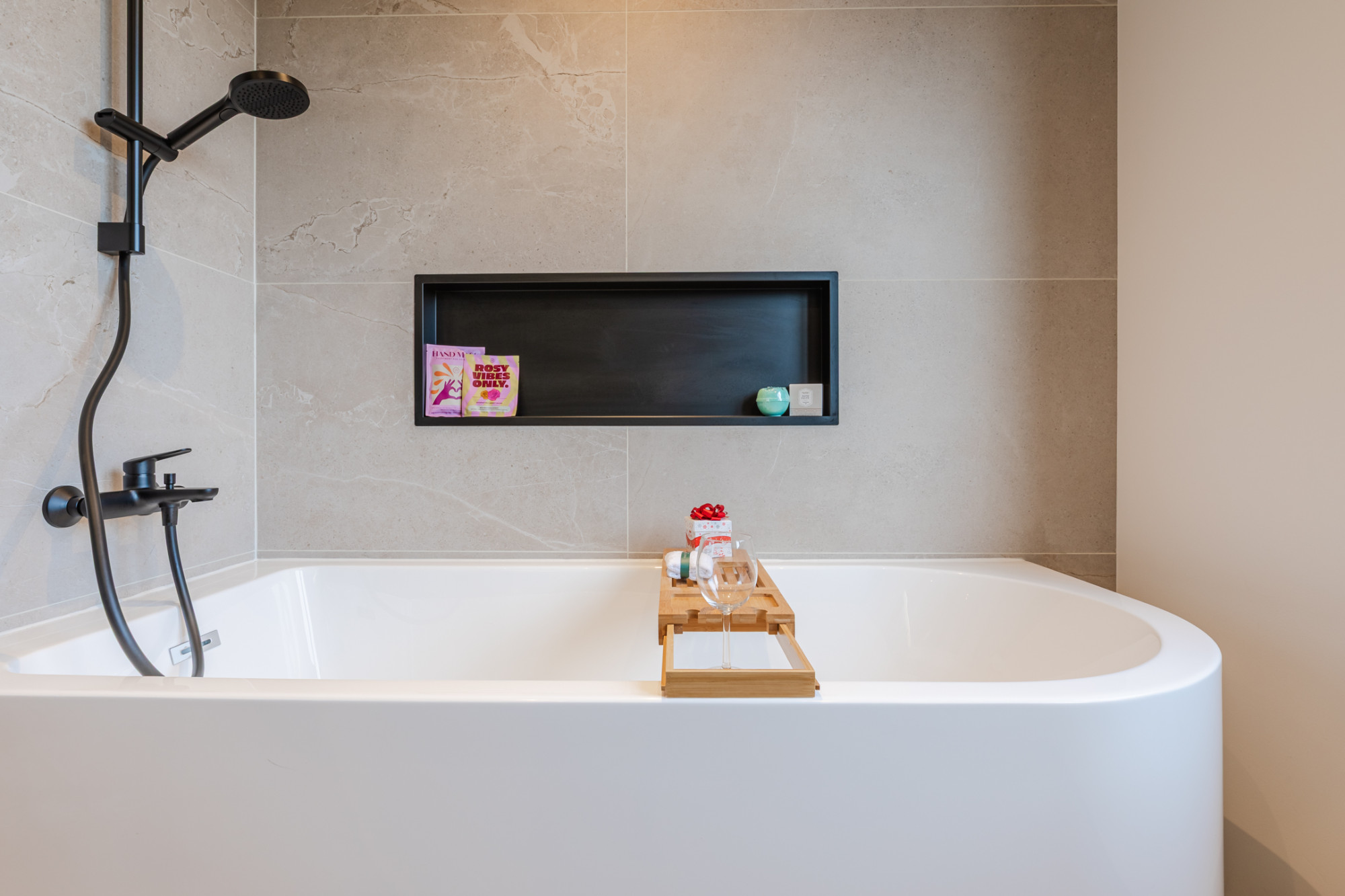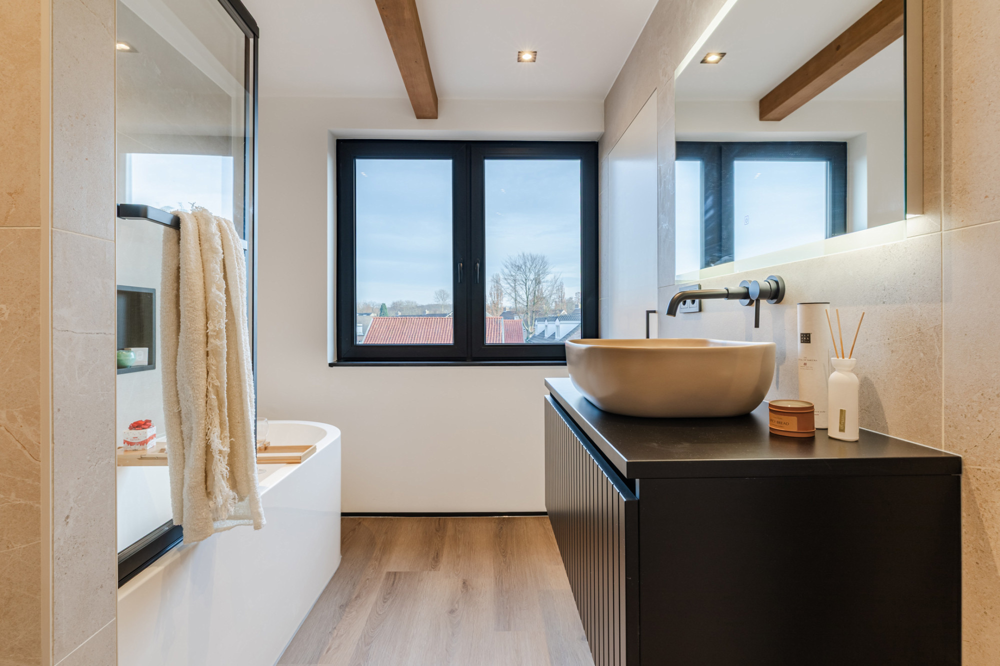 Luxe badkamer (ca. 2025) met ligbad, wastafelmeubel en zwevend toilet