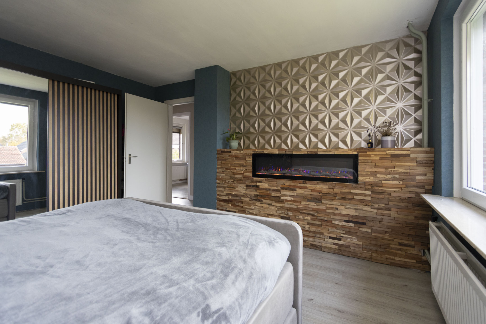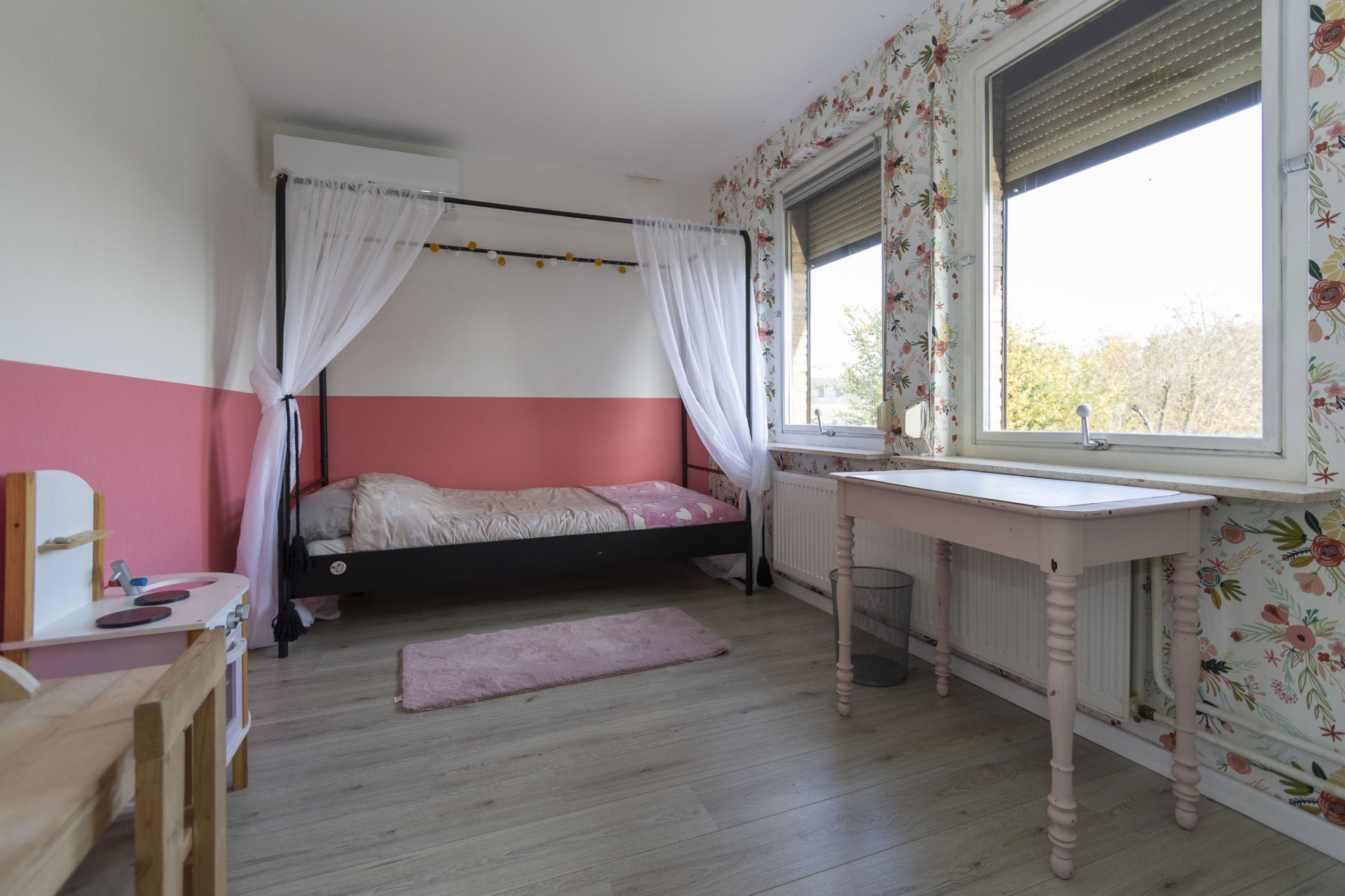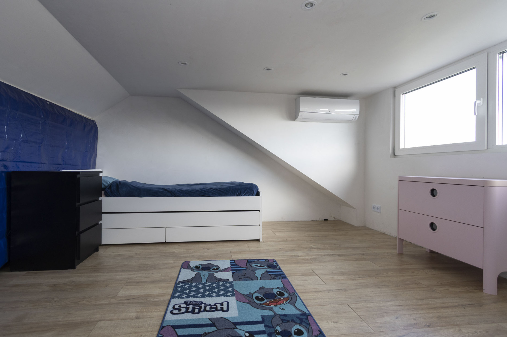Op de eerste verdieping bevinden zich drie slaapkamers, allen voorzien van dezelfde lichte laminaatvloer en nette afwerking. Een van de slaapkamers is uitgerust met een ingebouwde sfeerhaard. Twee van de drie slaapkamers hebben praktische muurkasten en een airco.