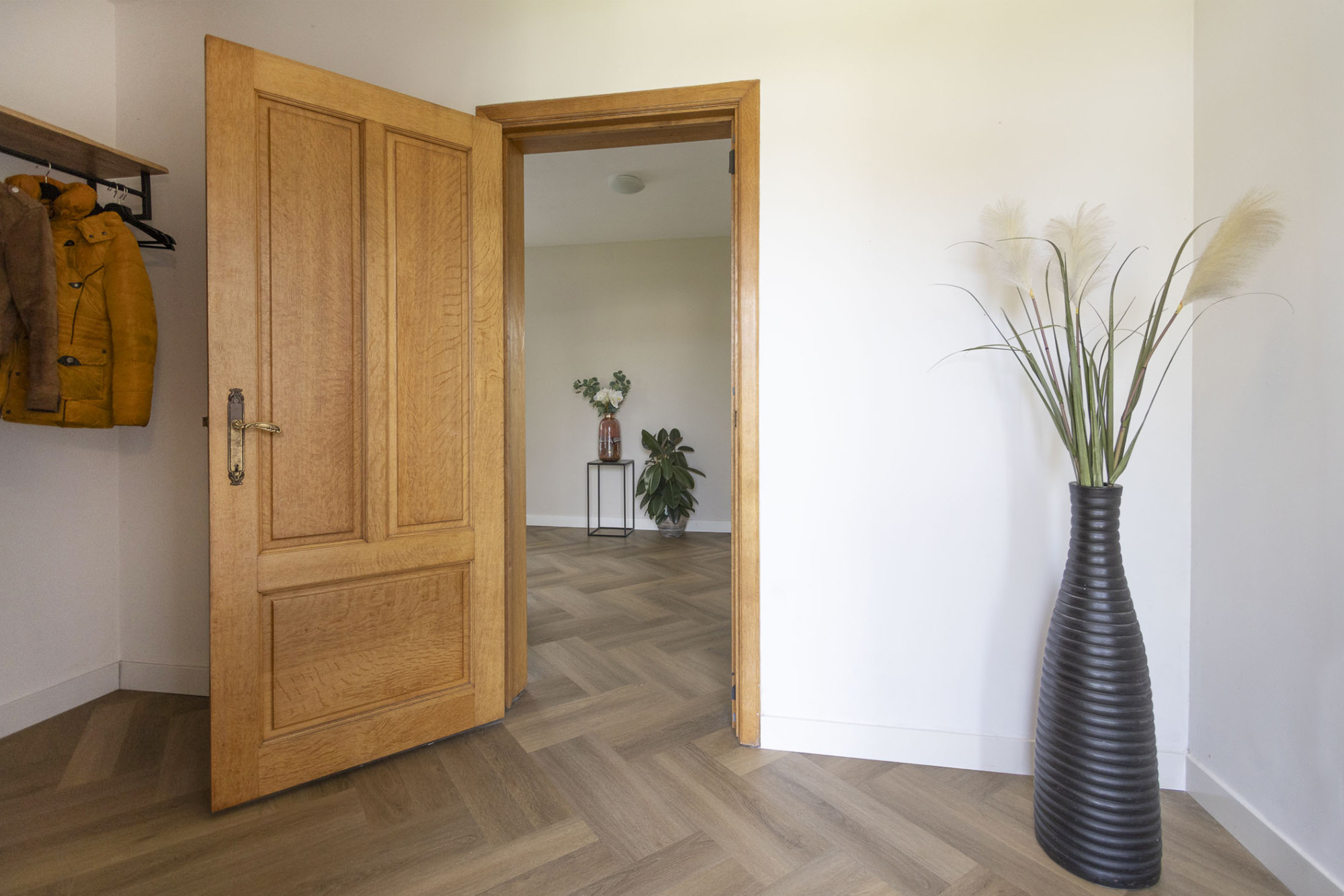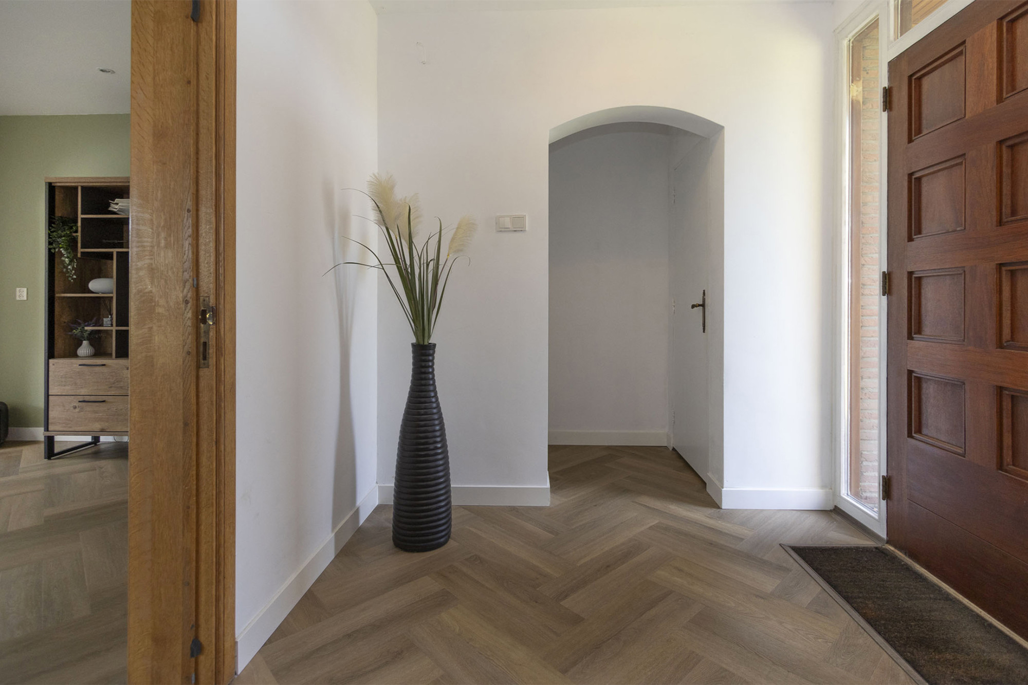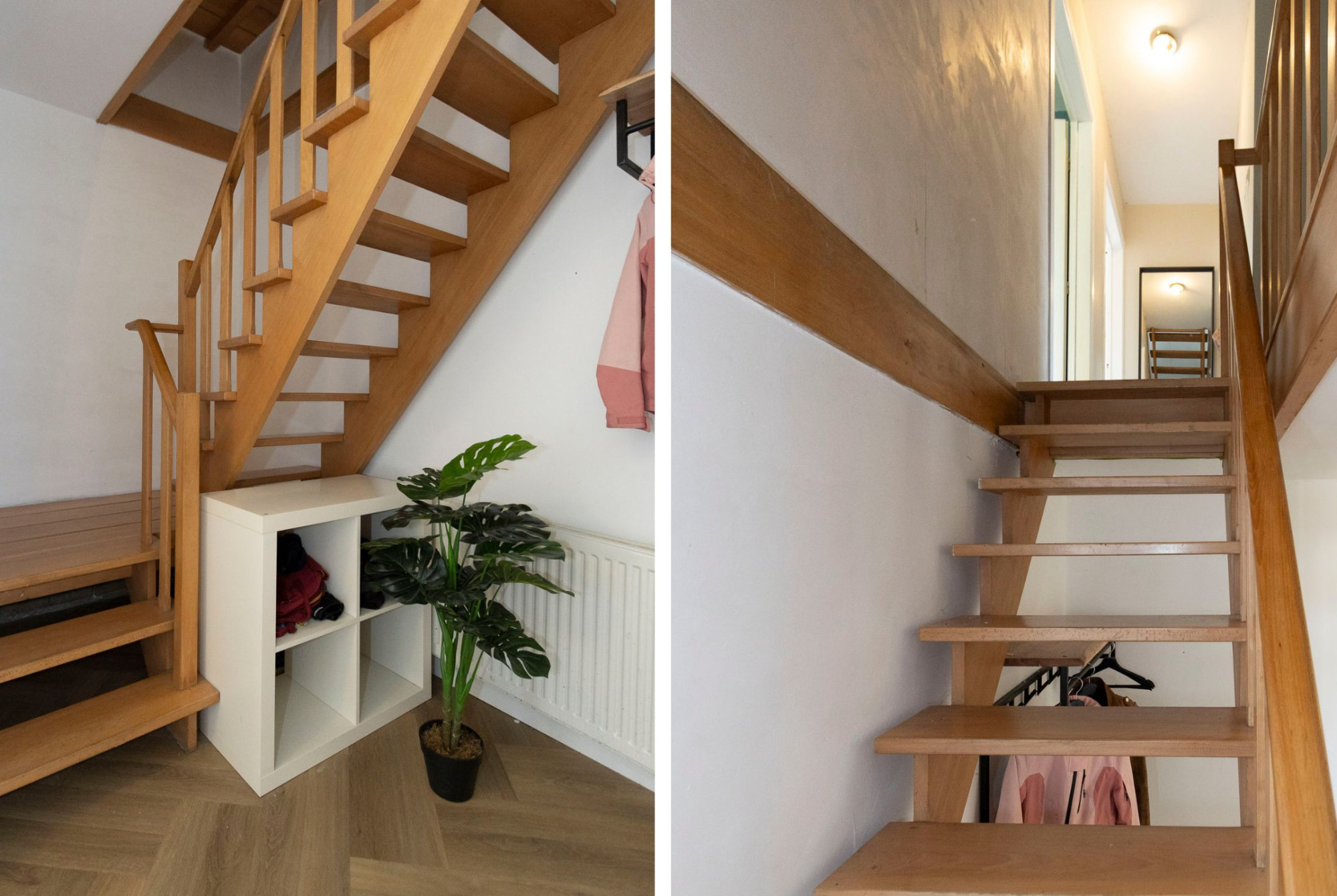 Entree via de voordeur aan de voorzijde van de woning. In de hal bevinden zich de vernieuwde meterkast (2025), het moderne toilet met fontein, de trap naar boven en de toegang tot de woonkamer.