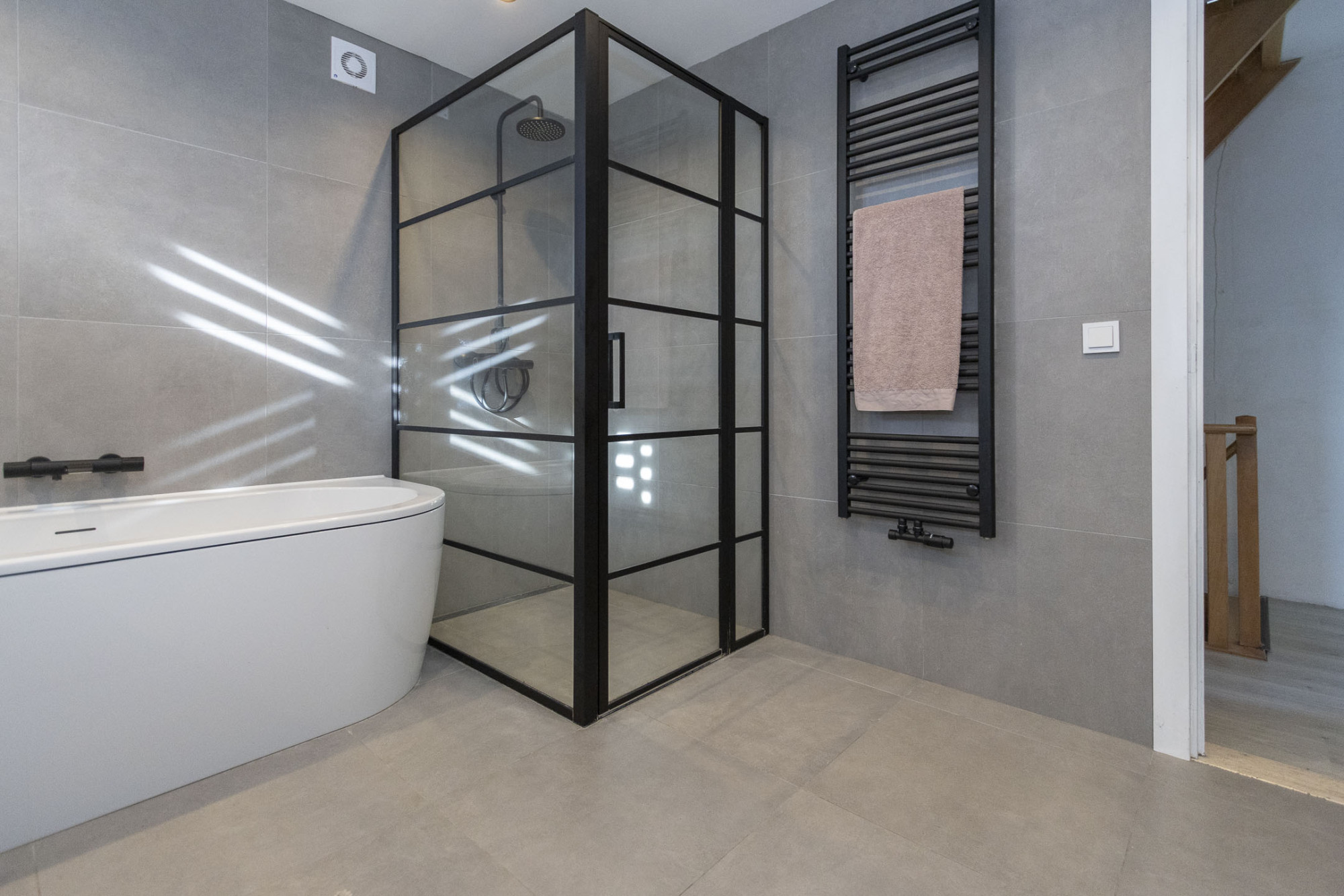 De geheel vernieuwde badkamer (2022) is luxe uitgevoerd met een ruime inloopdouche voorzien van regendouche, een ligbad, dubbele wastafel met meubel, toilet, grote ronde spiegel met ledverlichting, vloerverwarming en een designradiator. Een comfortabel en luxe geheel.