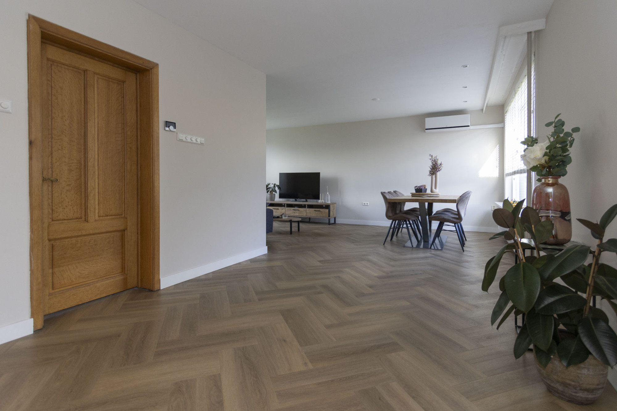 De woonkamer is opvallend ruim en licht, voorzien van een geheel vernieuwde lichte pvc-vloer die doorloopt over de gehele woonlaag. Een airco zorgt voor zowel koeling als verwarming. De open keuken (vernieuwd in 2022) is een echte eyecatcher: uitgevoerd met een spoeleiland, gezellige bar en moderne inbouwapparatuur zoals een vaatwasser, combi-oven, 4-pits inductiekookplaat, afzuigkap en een grote koelkast. In de keuken zorgt een plat dakraam voor extra daglicht.