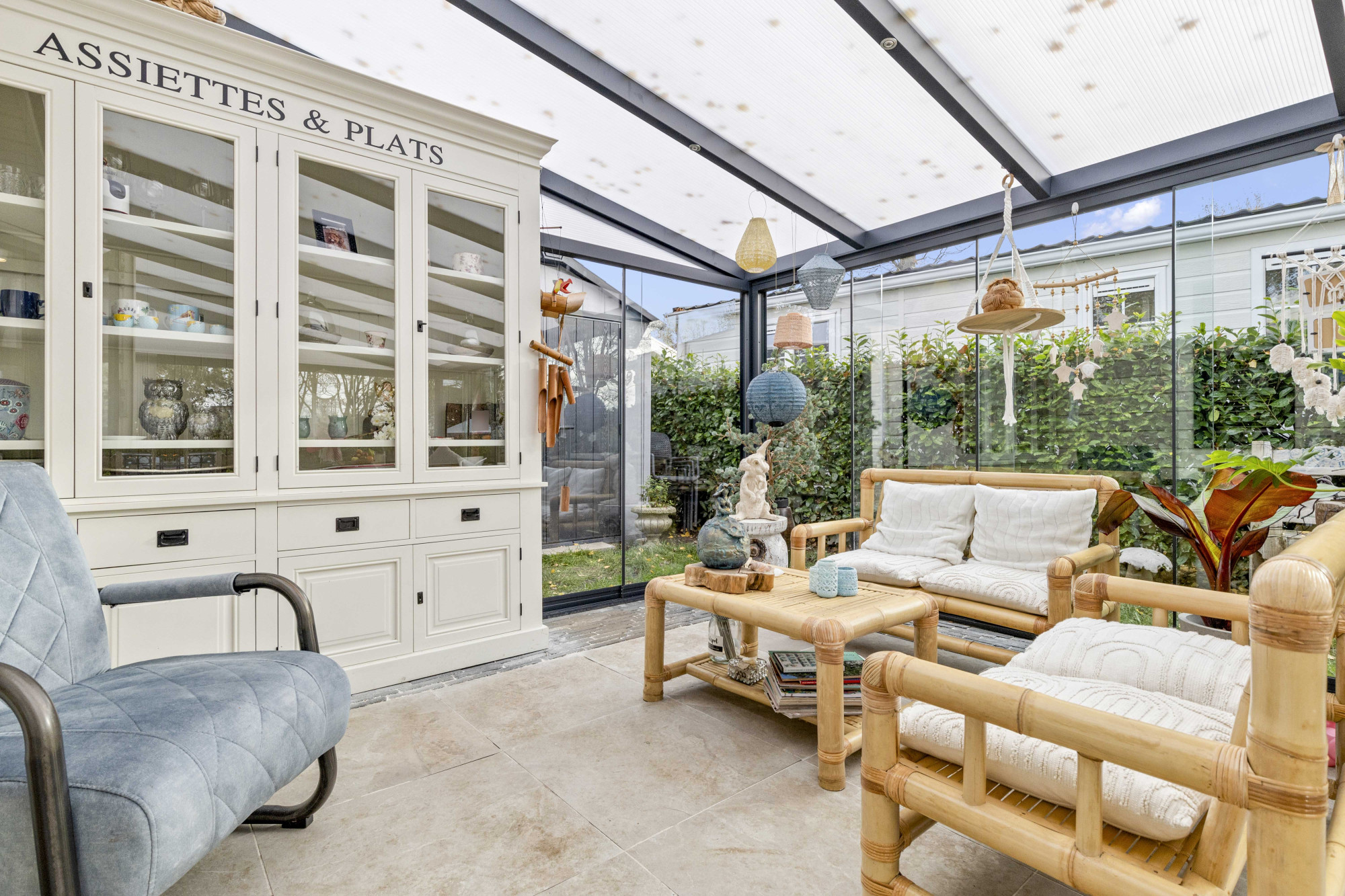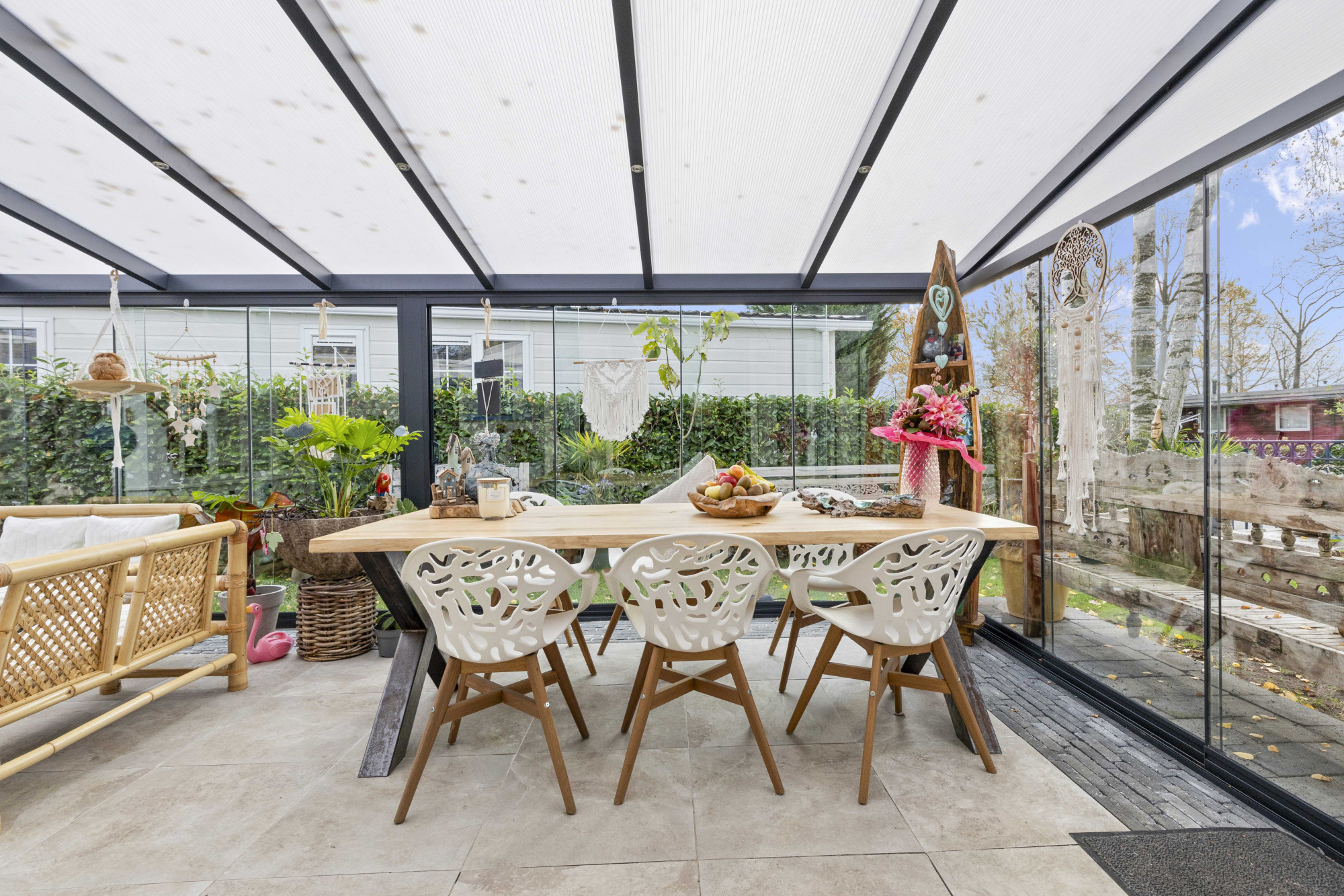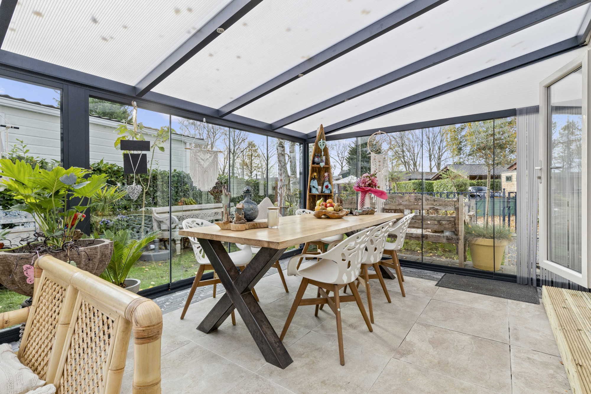 Stap binnen in deze stijlvolle en moderne tuinserre, volledig omgeven door glas en voorzien van een elegante glazen schuifpui. De serre vormt een harmonieuze overgang tussen binnen en buiten, waardoor je in elk seizoen kunt genieten van natuurlijk licht, het uitzicht op de tuin en ultieme rust.