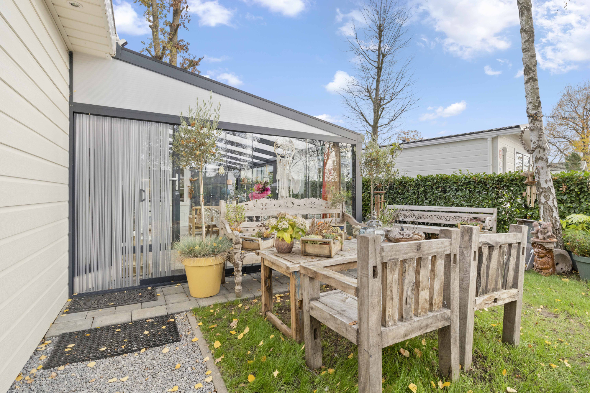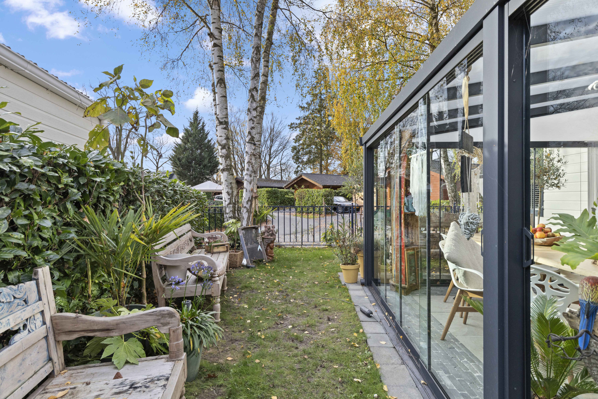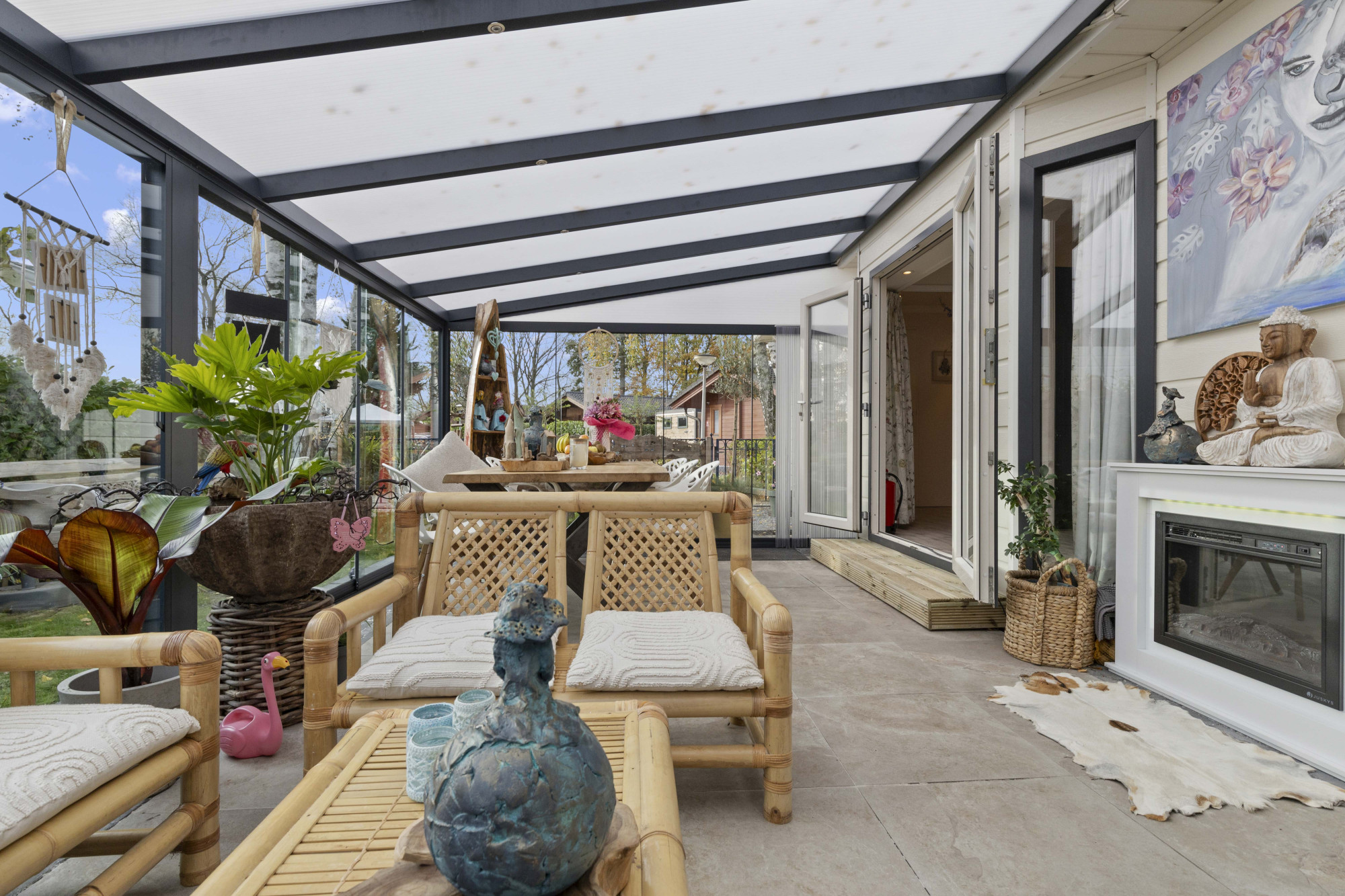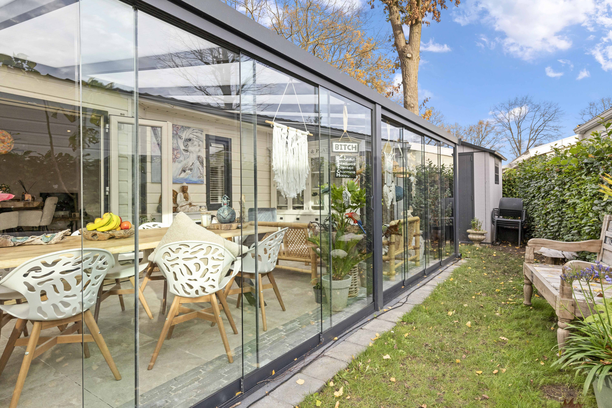Stap binnen in deze stijlvolle en moderne tuinserre, volledig omgeven door glas en voorzien van een elegante glazen schuifpui. De serre vormt een harmonieuze overgang tussen binnen en buiten, waardoor je in elk seizoen kunt genieten van natuurlijk licht, het uitzicht op de tuin en ultieme rust.