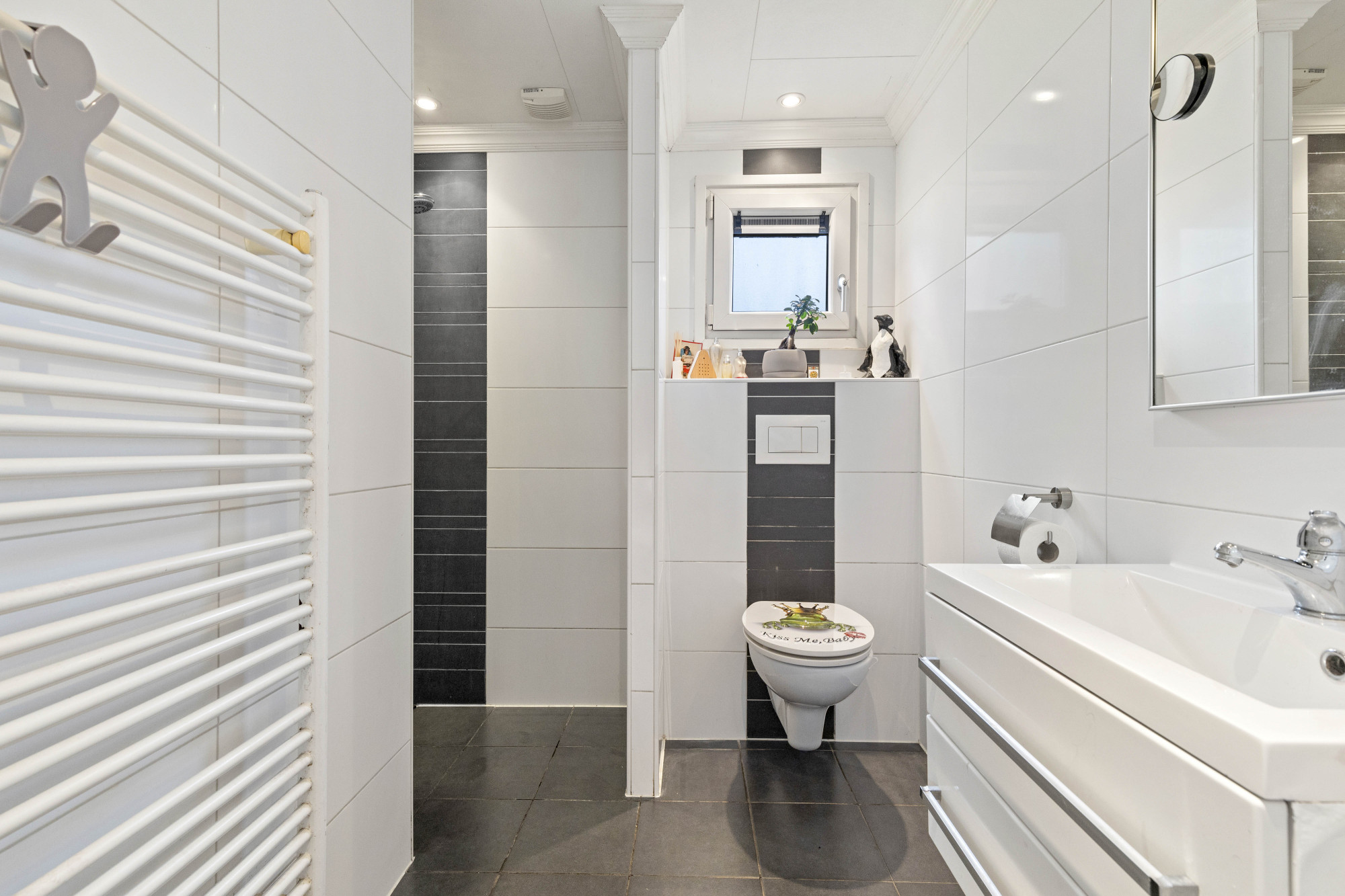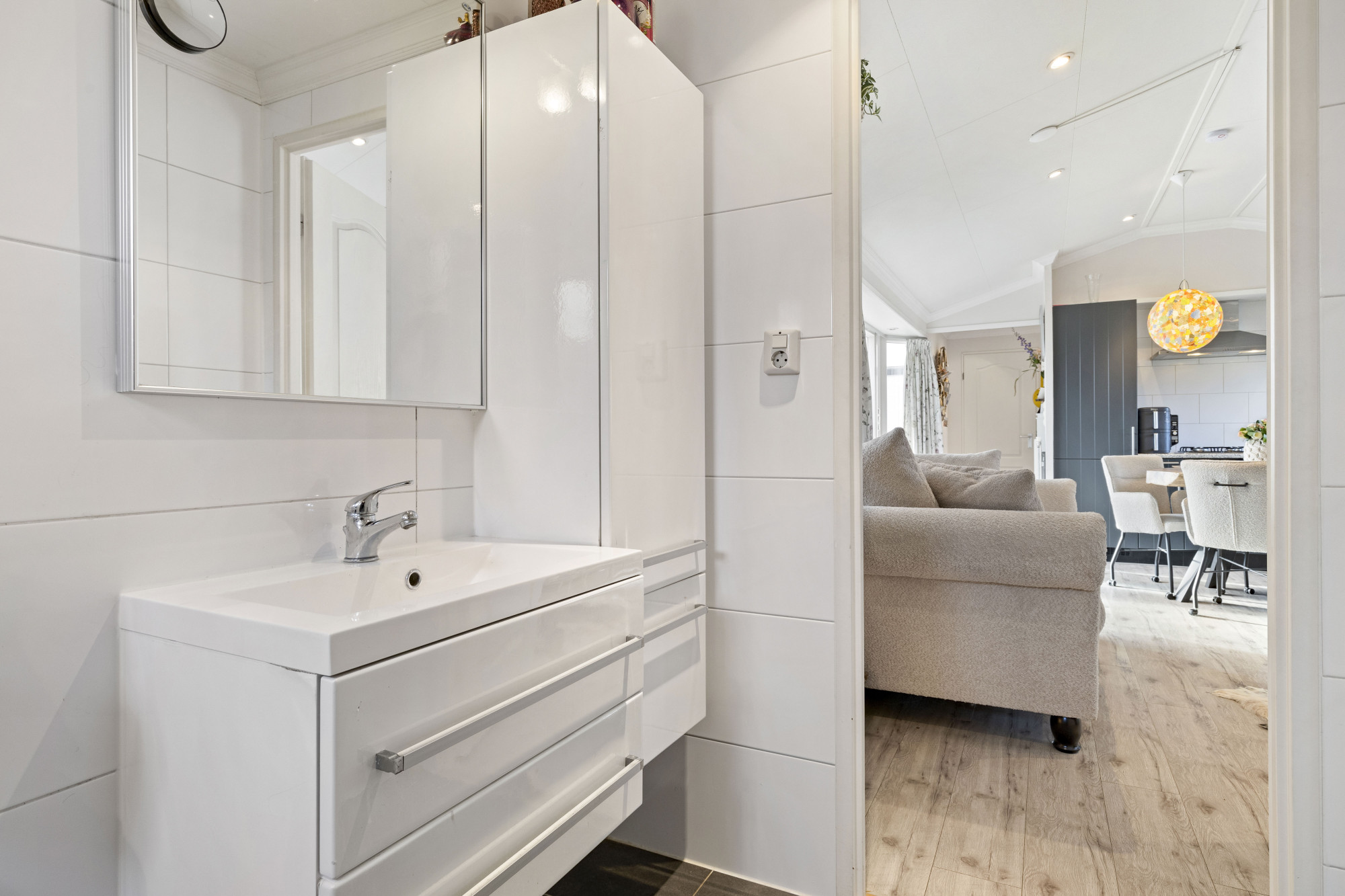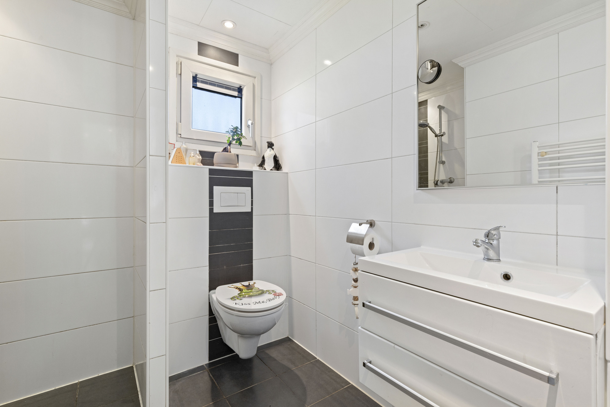De badkamer is modern en compleet uitgerust met een wastafel, toilet en douche. De woning heeft een gebruiksvriendelijke indeling die bijdraagt aan een aangenaam verblijf.