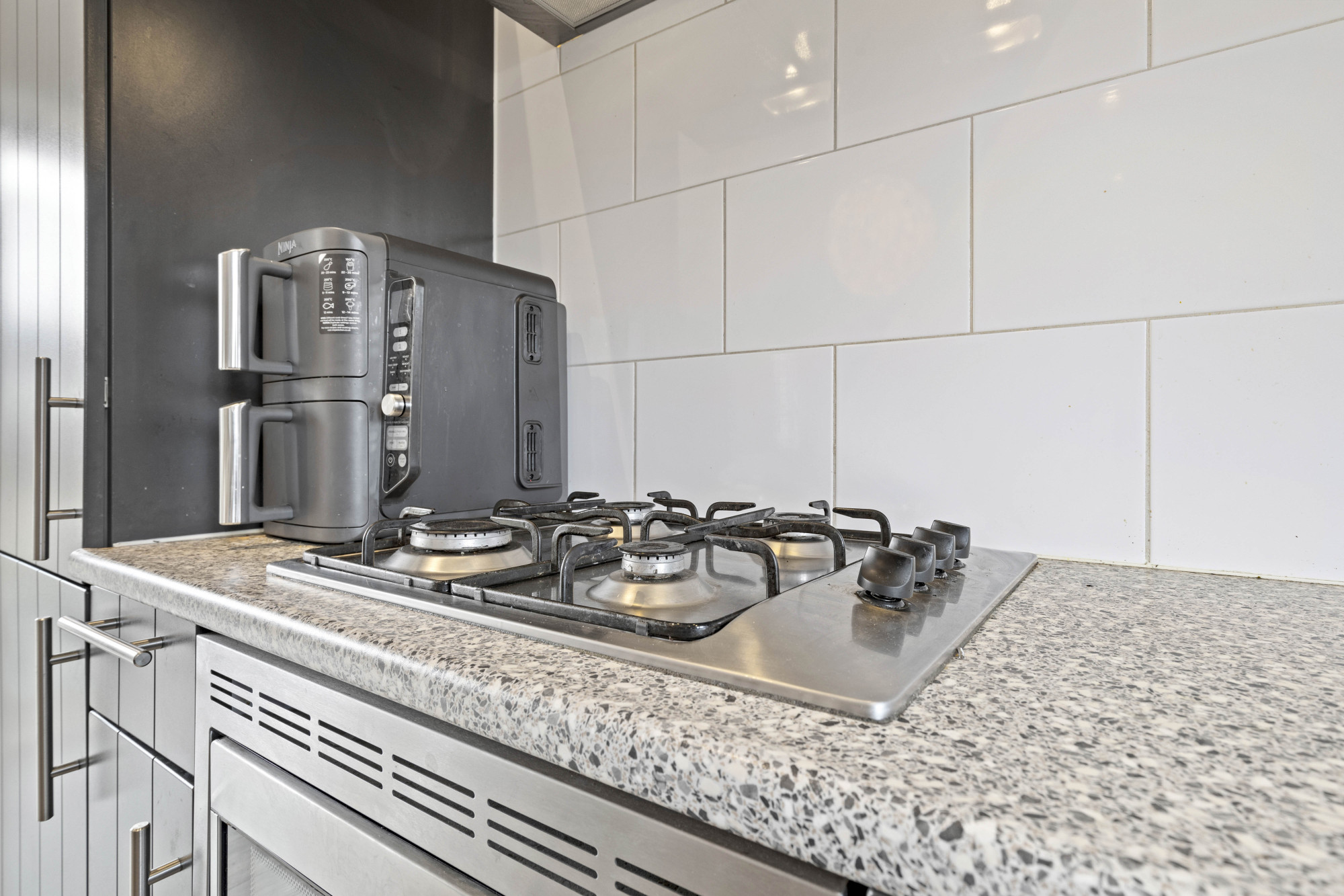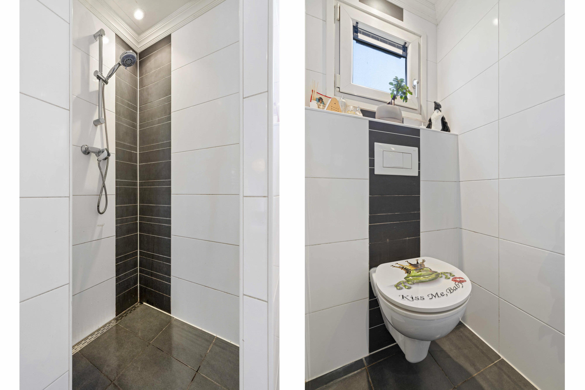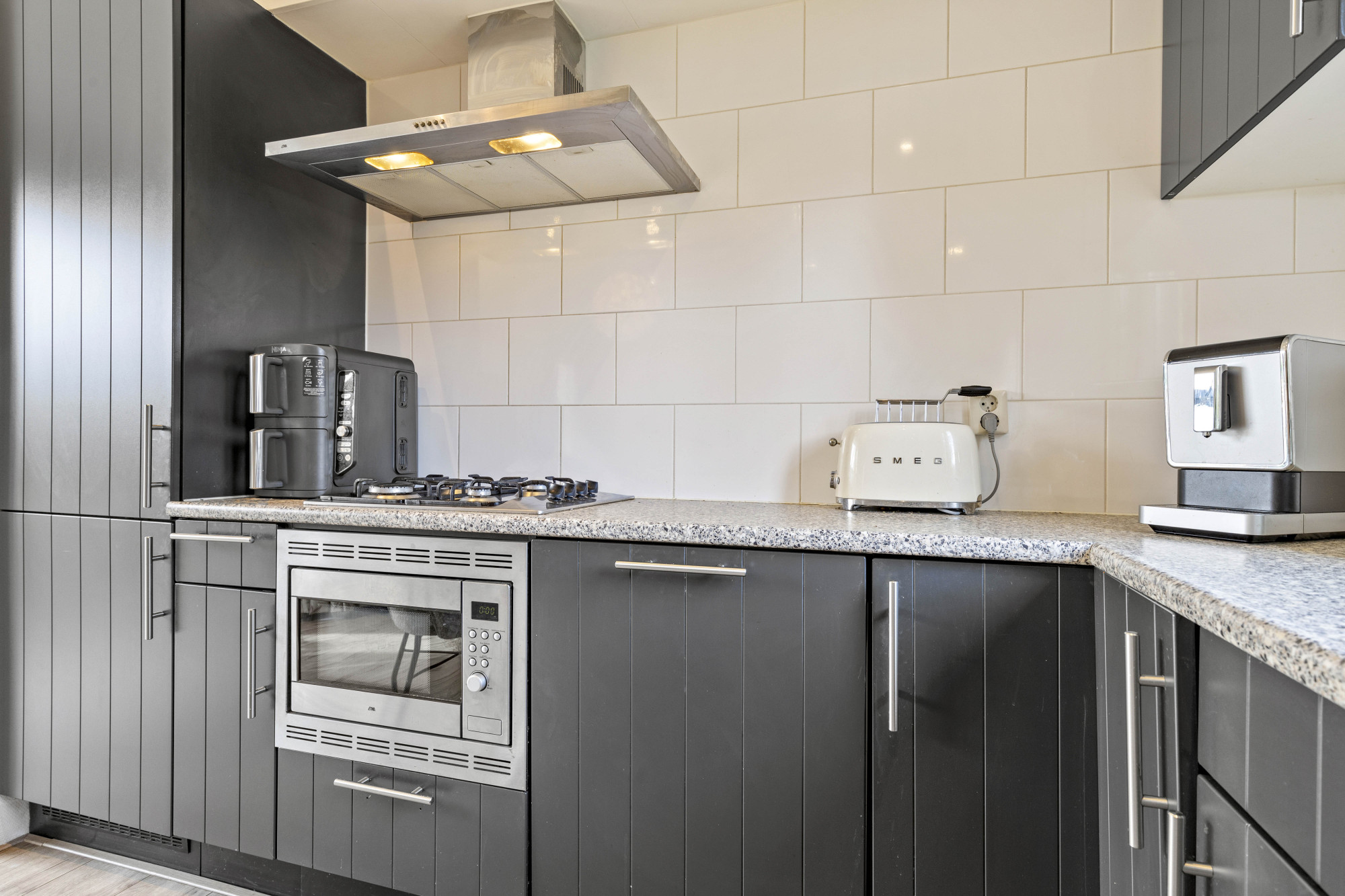 De badkamer is modern en compleet uitgerust met een wastafel, toilet en douche. De woning heeft een gebruiksvriendelijke indeling die bijdraagt aan een aangenaam verblijf.