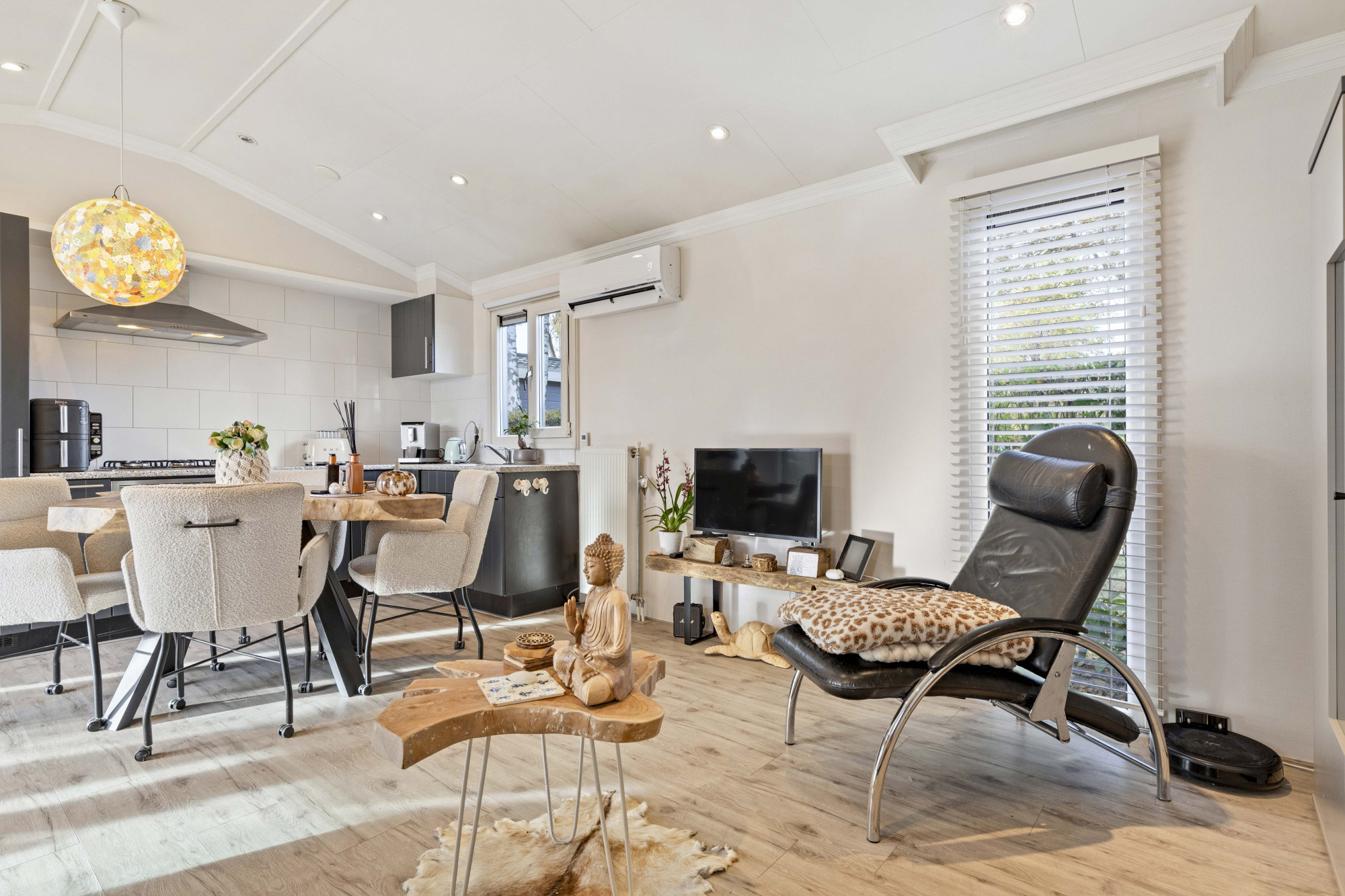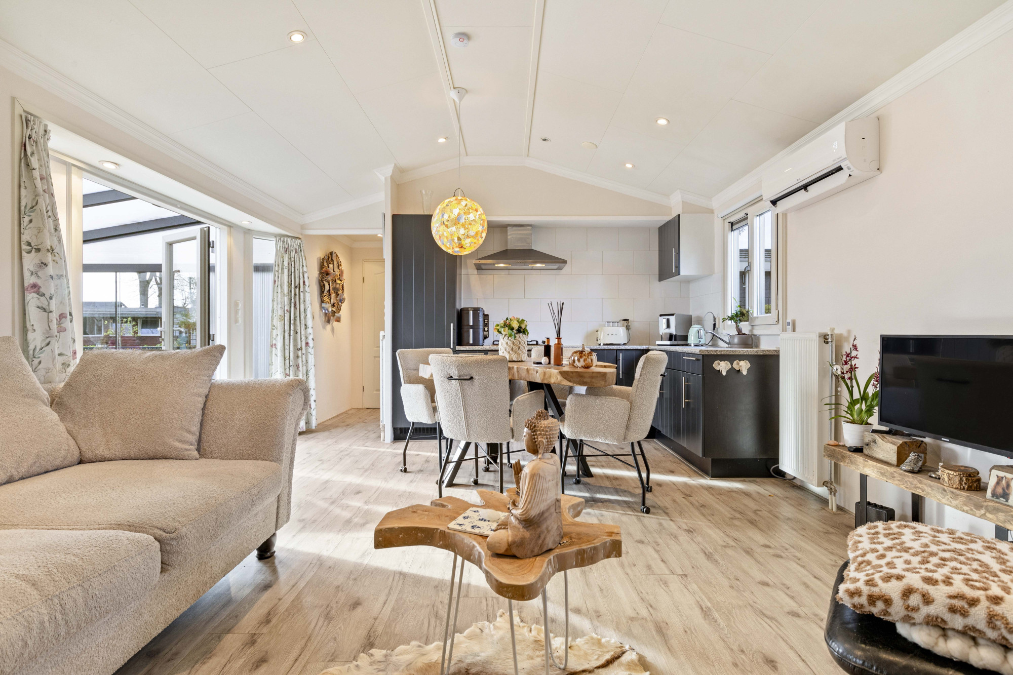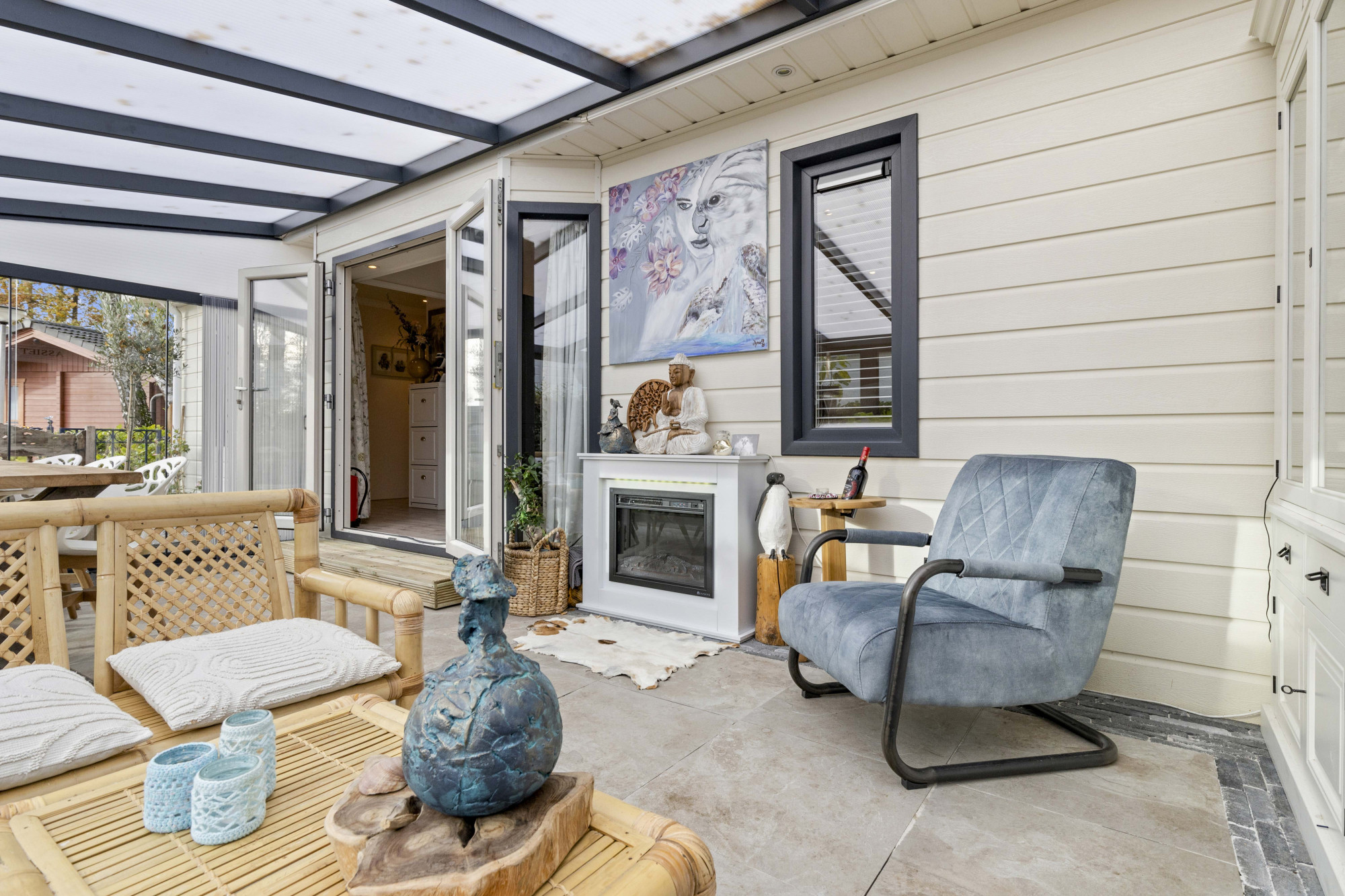 Of je nu ’s ochtends de eerste zonnestralen meepakt, ’s middags ontspannen werkt of ’s avonds gezellig borrelt met vrienden: deze tuinserre biedt een heerlijke plek voor elk moment van de dag. Dankzij de schuifpui open je de ruimte in een handomdraai, waardoor binnen en buiten moeiteloos in elkaar overlopen.