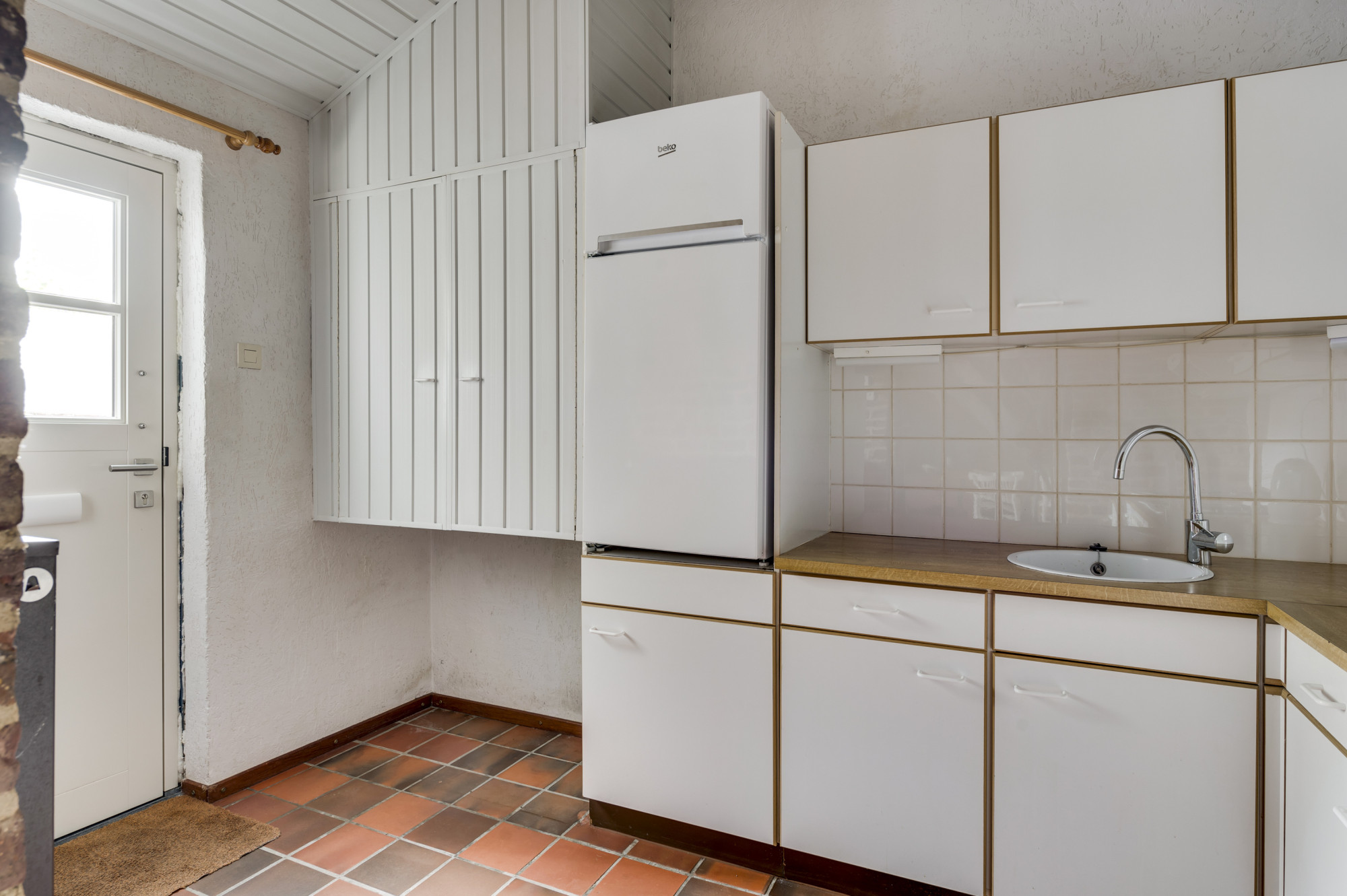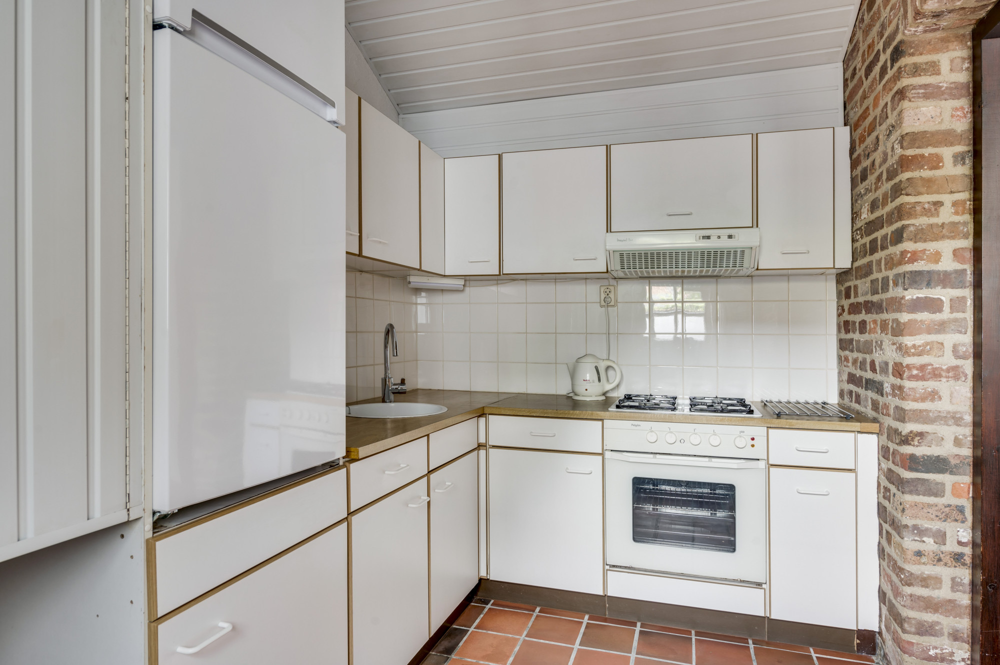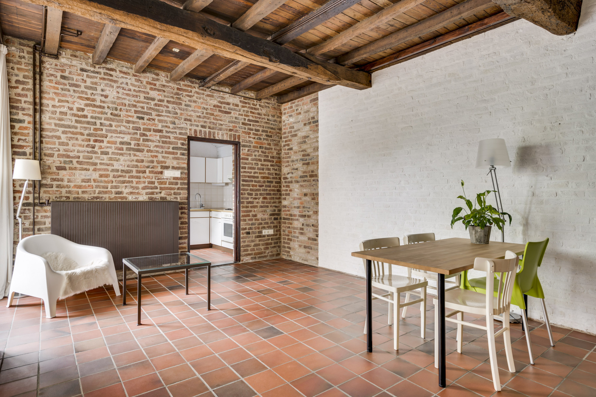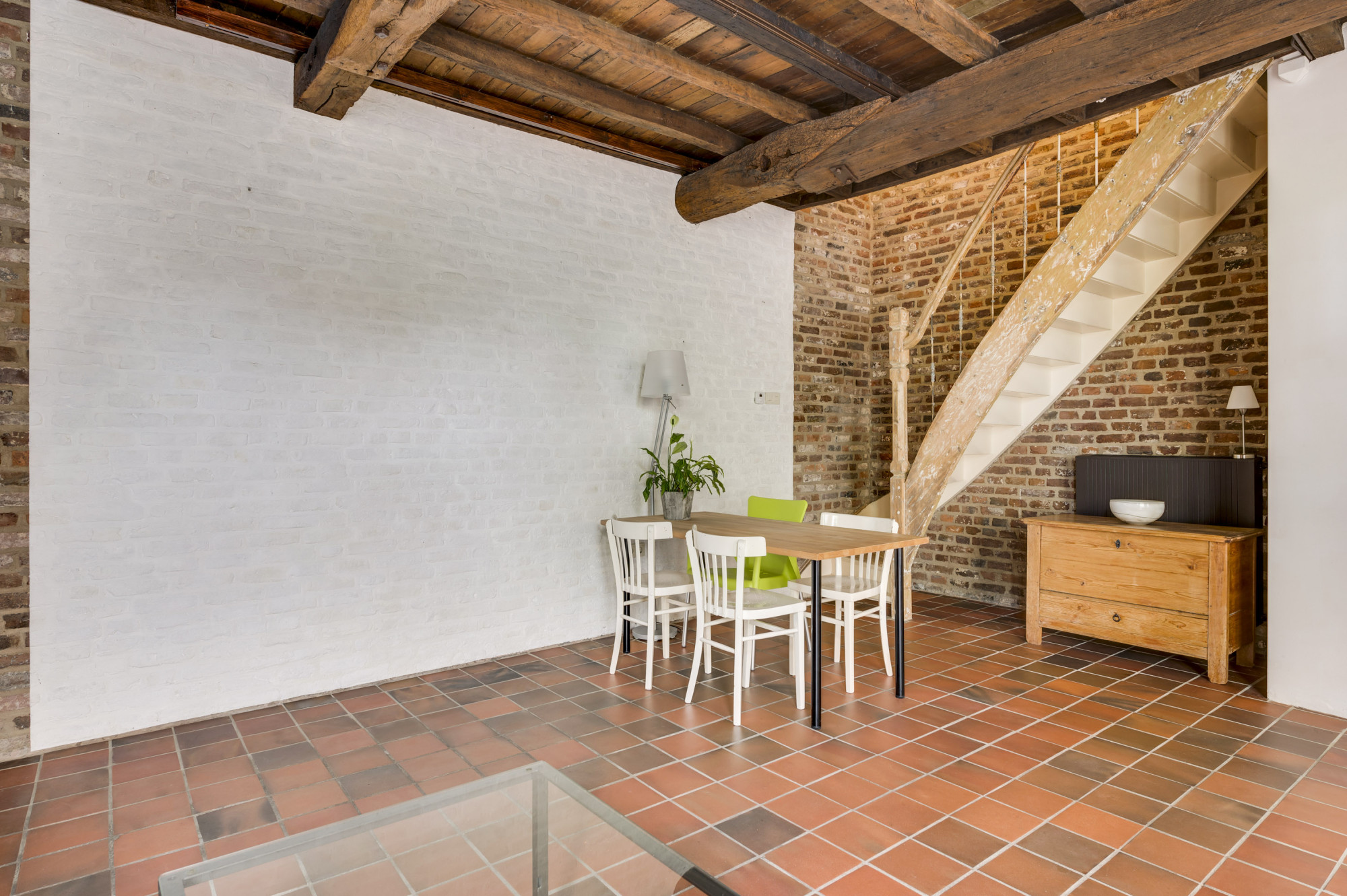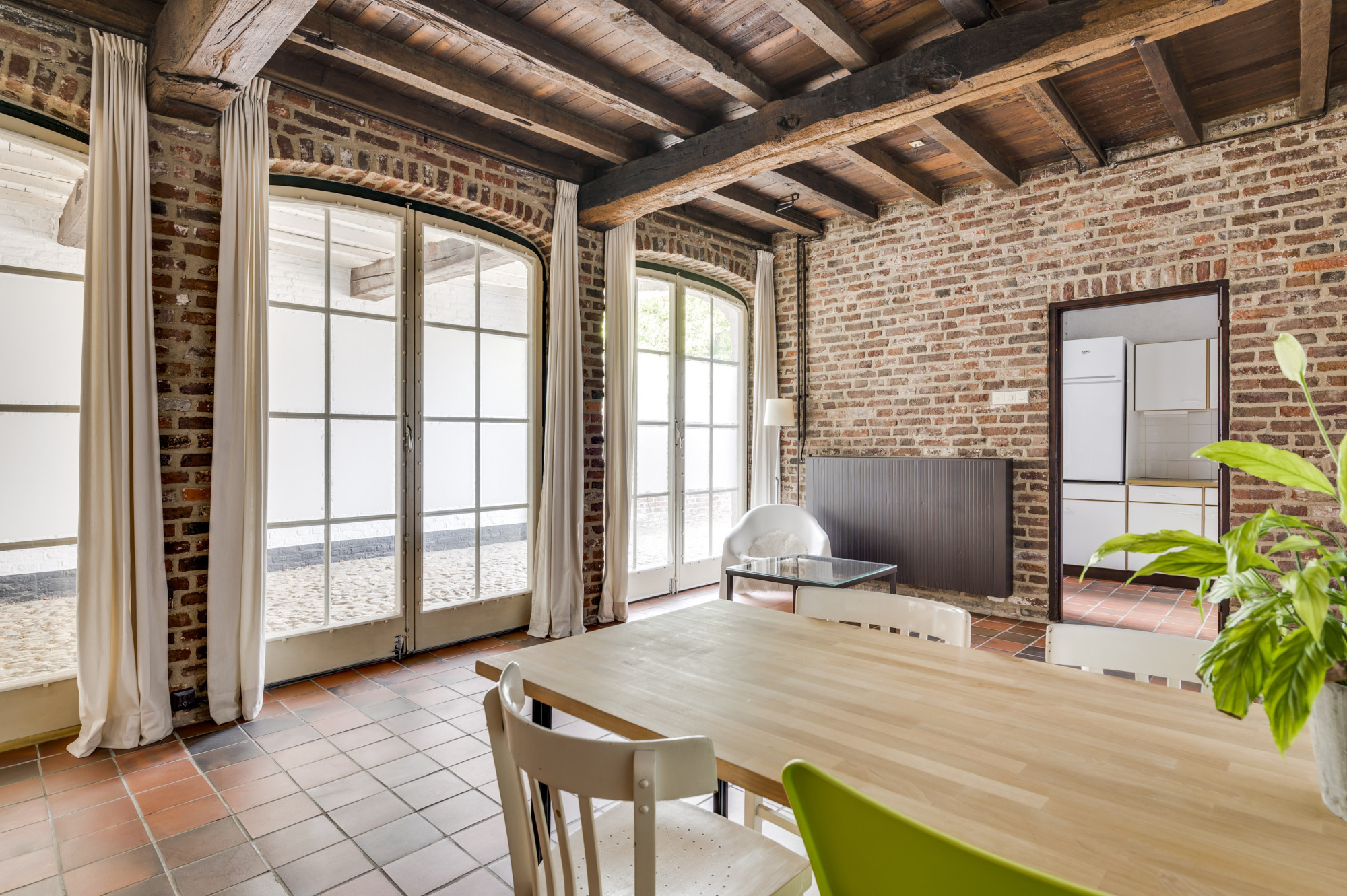 Bij binnenkomst ervaart u direct de warme sfeer van de karakteristieke woonkamer, die tevens perfect kan dienen als bedrijfsruimte of winkel. De ruimte wordt verlicht door sfeerverlichting en beschikt over indrukwekkende massief houten balken. Met drie openslaande deuren naar buiten geniet u van een directe verbinding met het pittoreske gemeentelijke voetpad. De keuken is uitgerust met inbouwapparatuur (gasfornuis, afzuigkap en oven) en een close-in boiler, bergruimte en aansluitingen voor witgoed en/of vaatwasser.